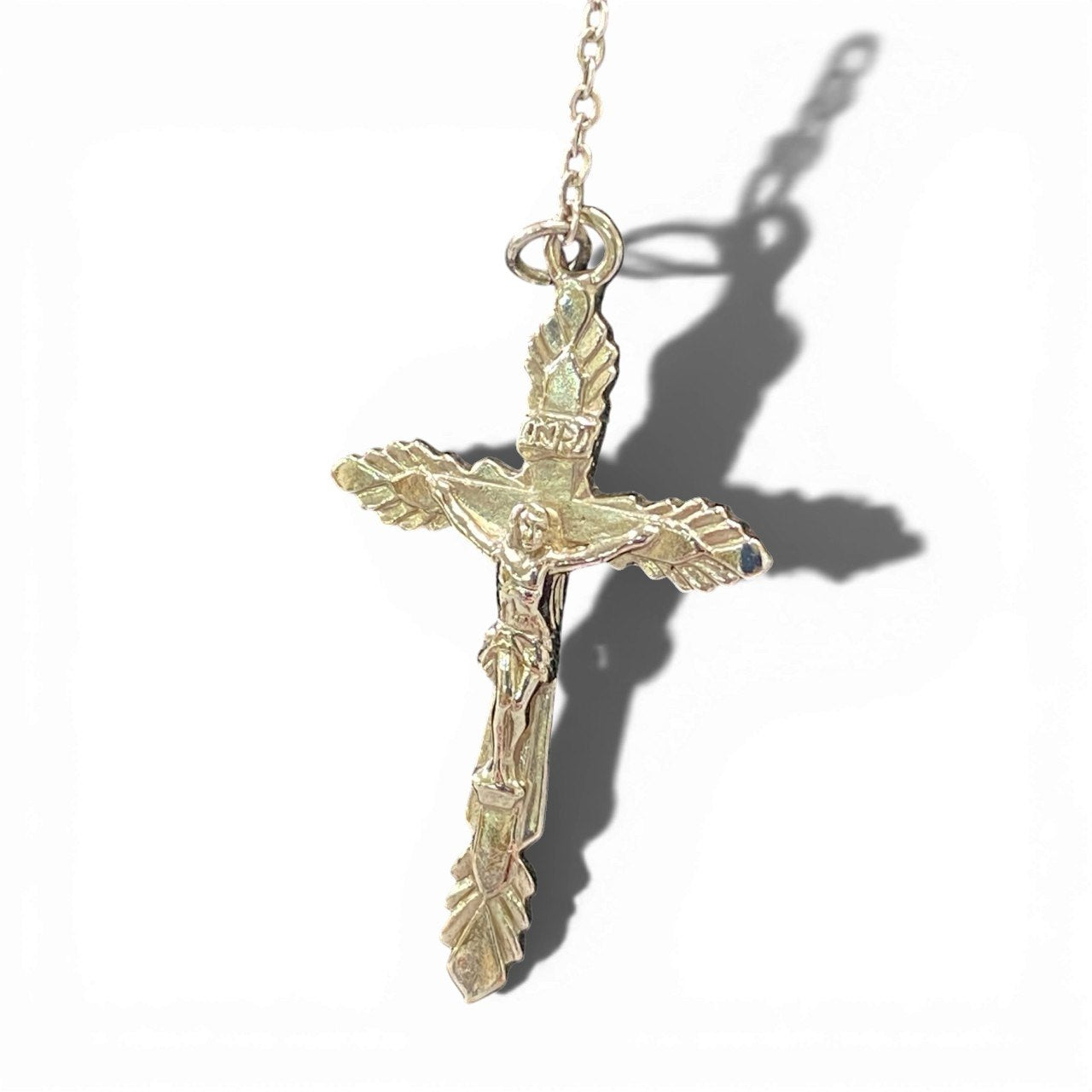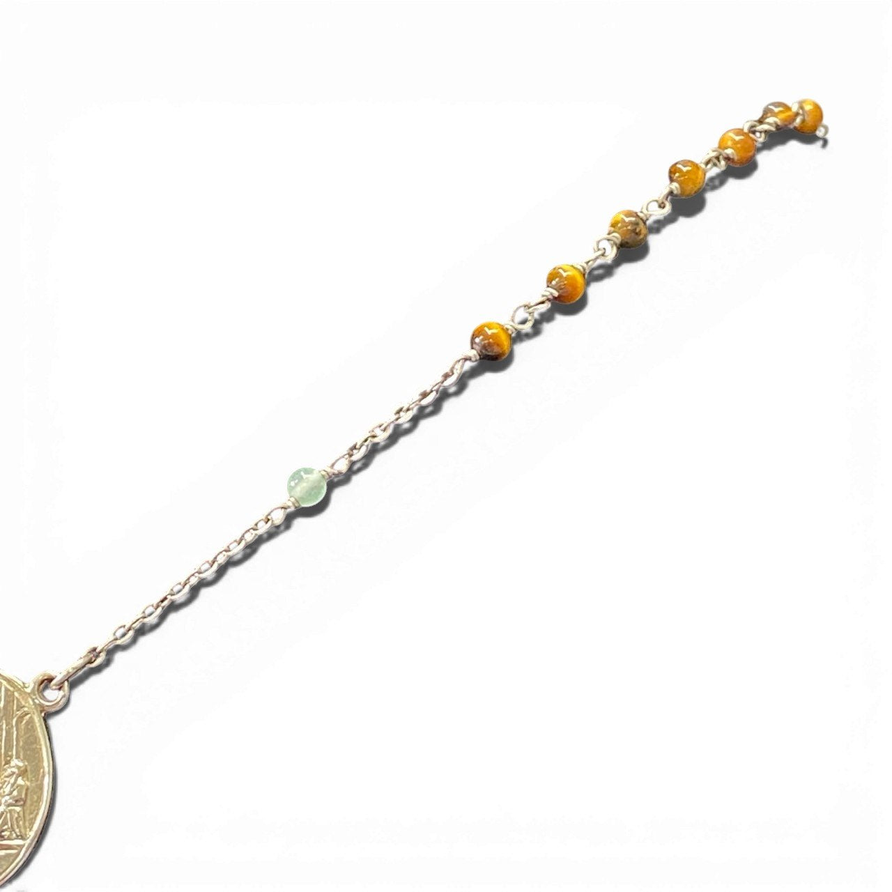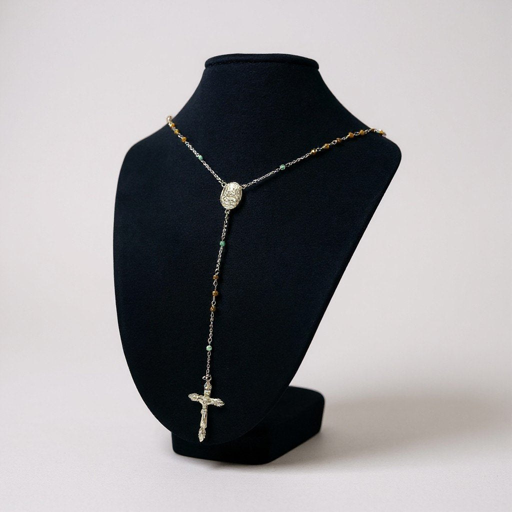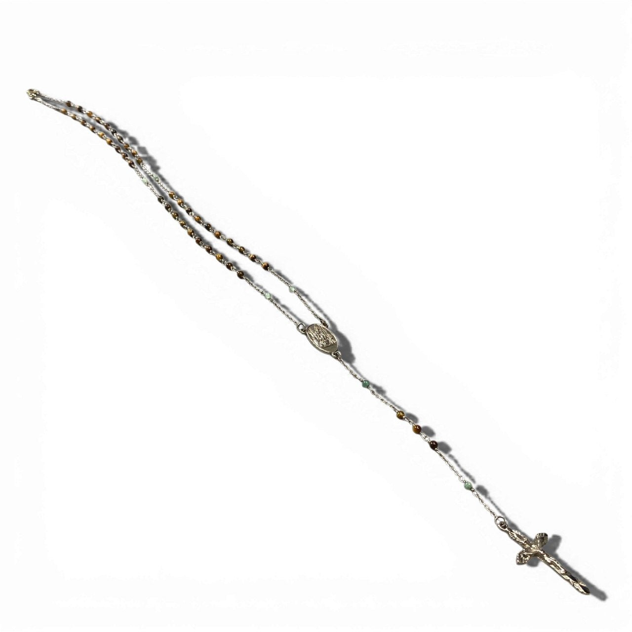 DOLCE&GABBANAらしいモチーフが印象的な、クロスデザインのネックレスです。 シルバーカラーのチェーンに、ブラウン系・グリーン系ビーズを組み合わせた落ち着きのある配色。 中央のメダイとクロストップが縦ラインを強調し、シンプルな装いに奥行きをプラスします。 カジュアルからきれいめコーデまで合わせやすく、コーディネートの主役として活躍するアイテムです。