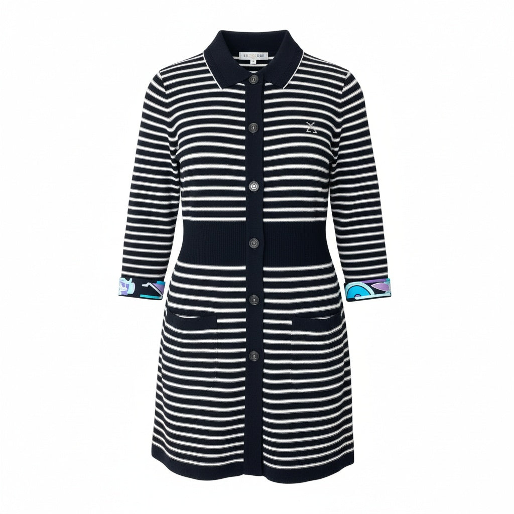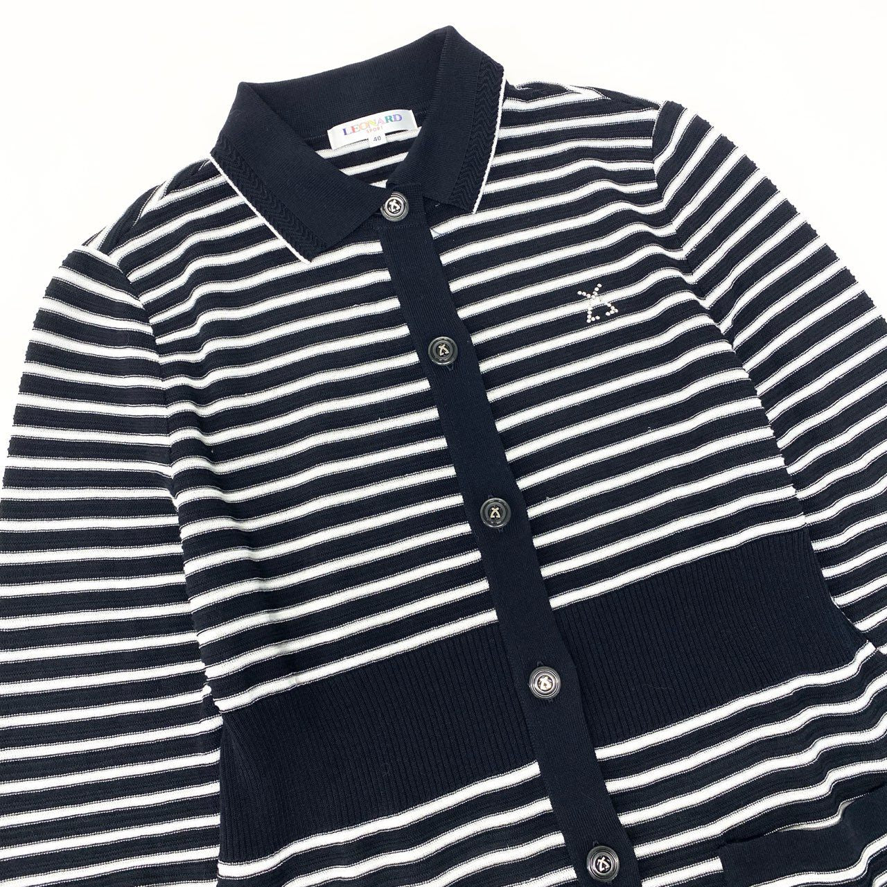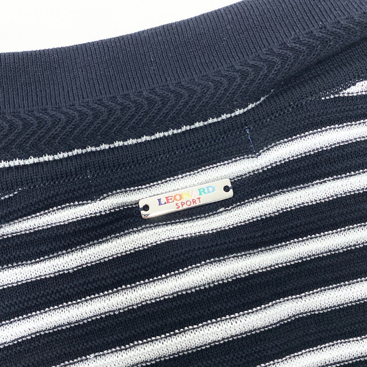 ネイビー×ホワイトのボーダー柄が爽やかな、LEONARDのポロニットです。マットでしなやかなニット素材に、フロントボタンと襟付きデザインを組み合わせ、上品なカジュアル感を演出します。ウエスト切替のペプラムシルエットが女性らしさを引き立て、体型カバーにも◎。袖口にはさりげないカラーディテールが入り、普段使いからお食事、きれいめなお出かけまで幅広く活躍する一着です。