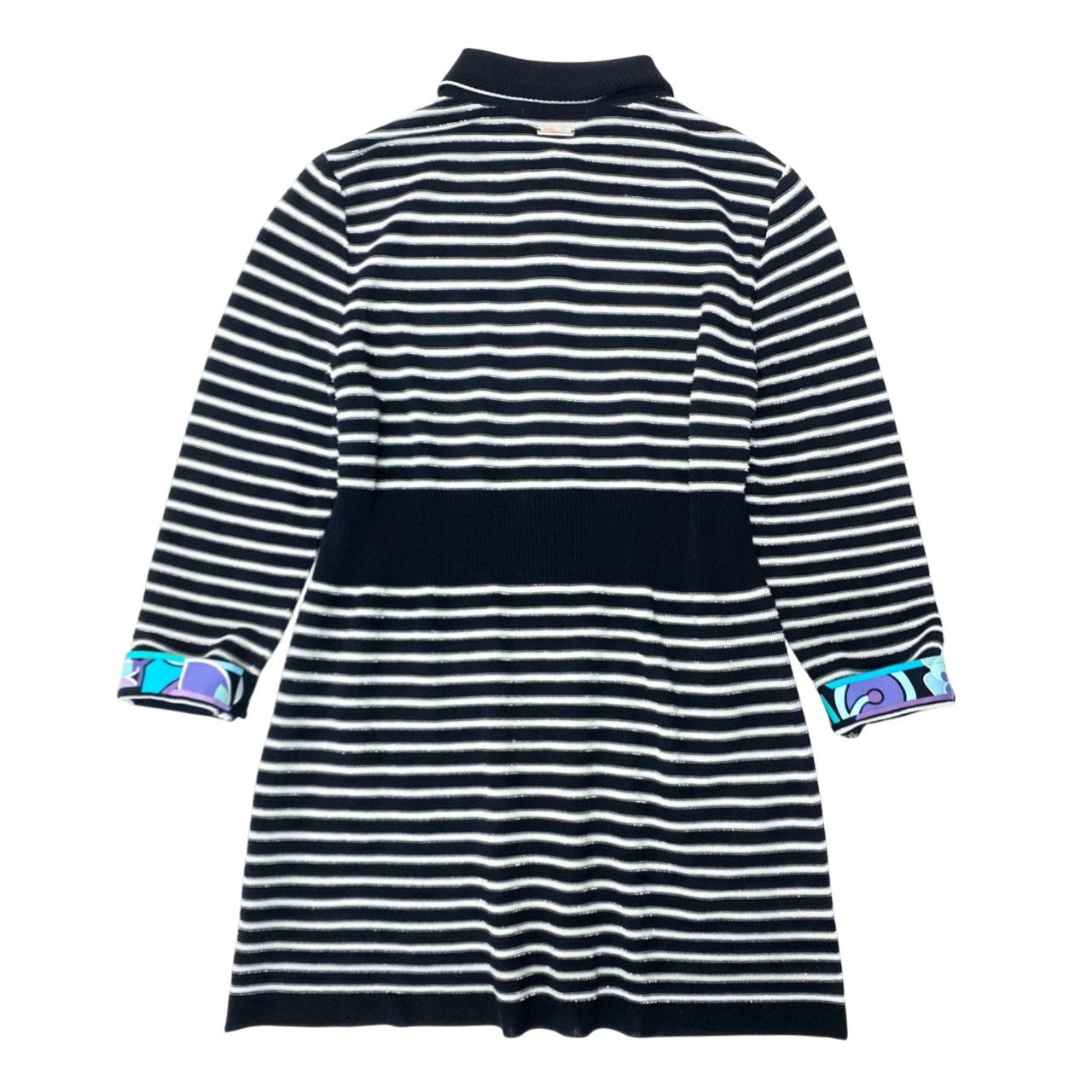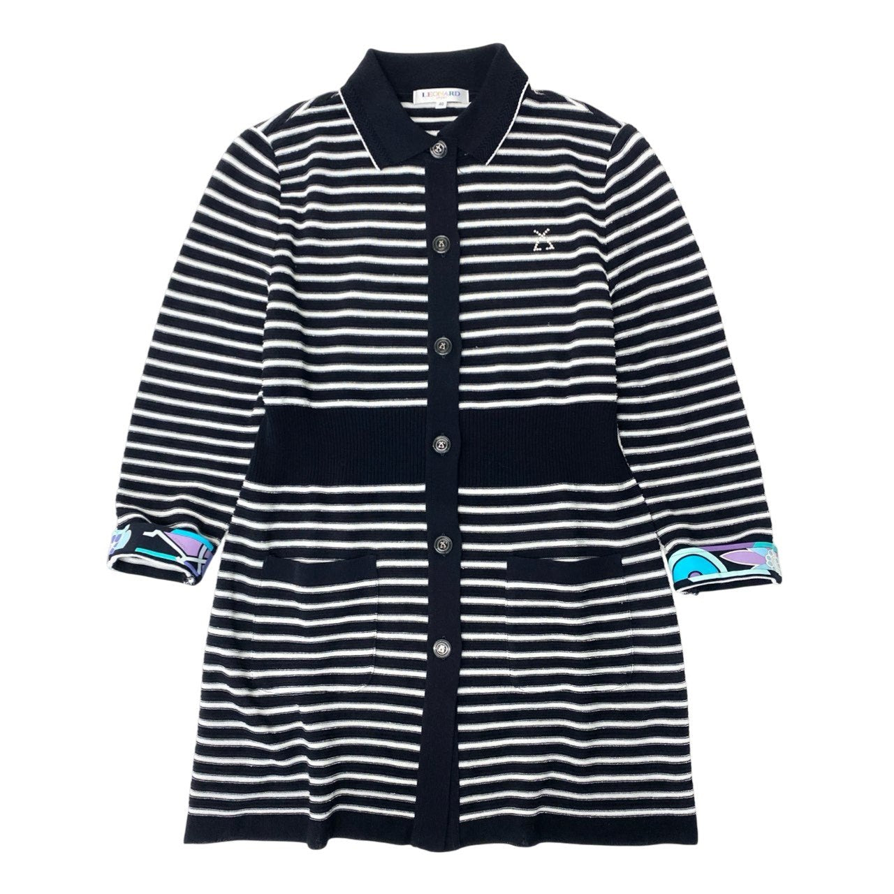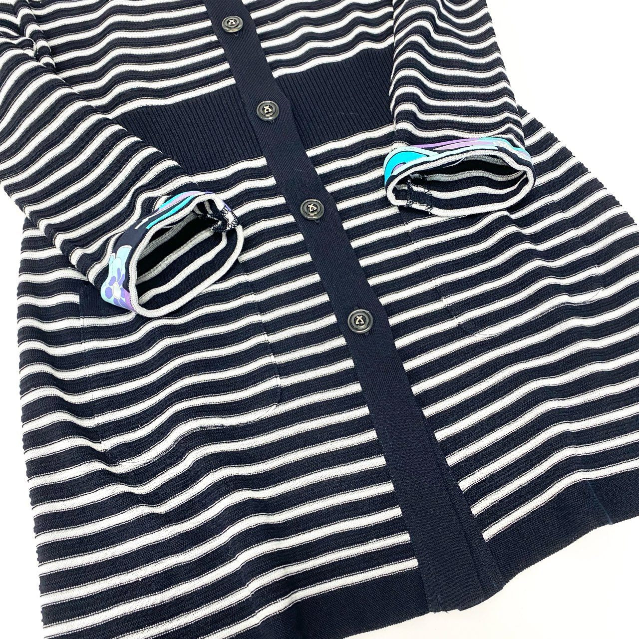 ネイビー×ホワイトのボーダー柄が爽やかな、LEONARDのポロニットです。マットでしなやかなニット素材に、フロントボタンと襟付きデザインを組み合わせ、上品なカジュアル感を演出します。ウエスト切替のペプラムシルエットが女性らしさを引き立て、体型カバーにも◎。袖口にはさりげないカラーディテールが入り、普段使いからお食事、きれいめなお出かけまで幅広く活躍する一着です。