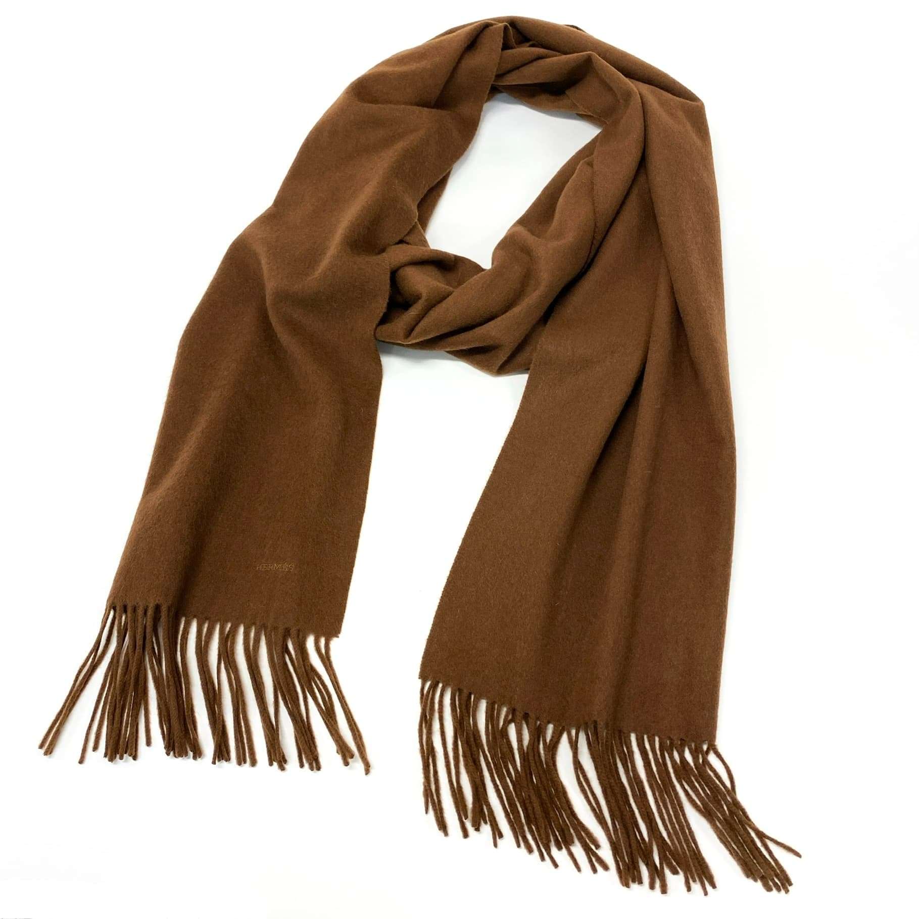落ち着いたキャメルブラウンの無地で、毛足の整ったカシミヤ素材が上品なマフラーストールです。端のフリンジがさりげないアクセントになり、装いに奥行きをプラス。ロングサイズのため、巻き方のアレンジが自在で男女問わず活躍します。オンオフ兼用で使いやすく、**Hermès**らしい洗練を感じる一枚です。