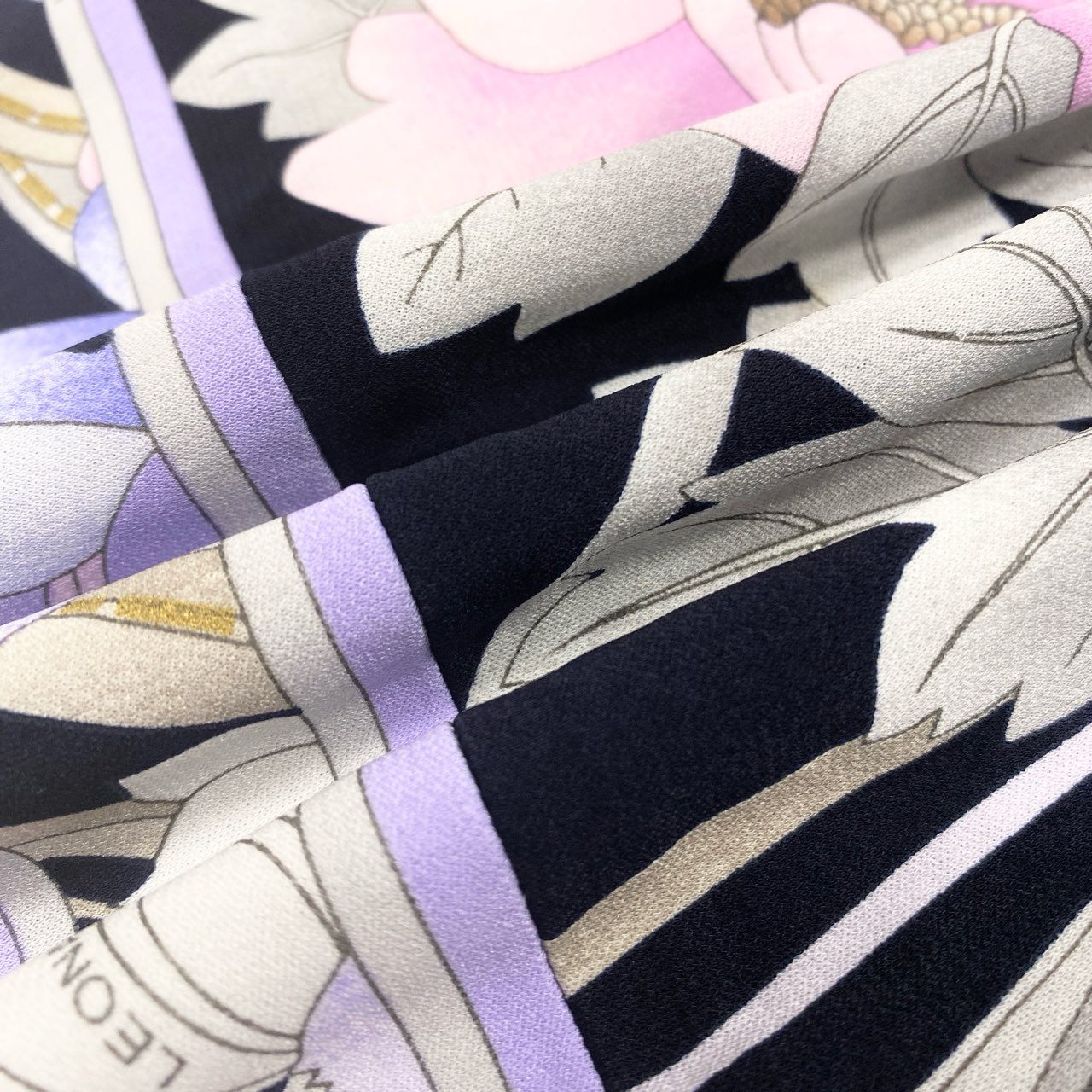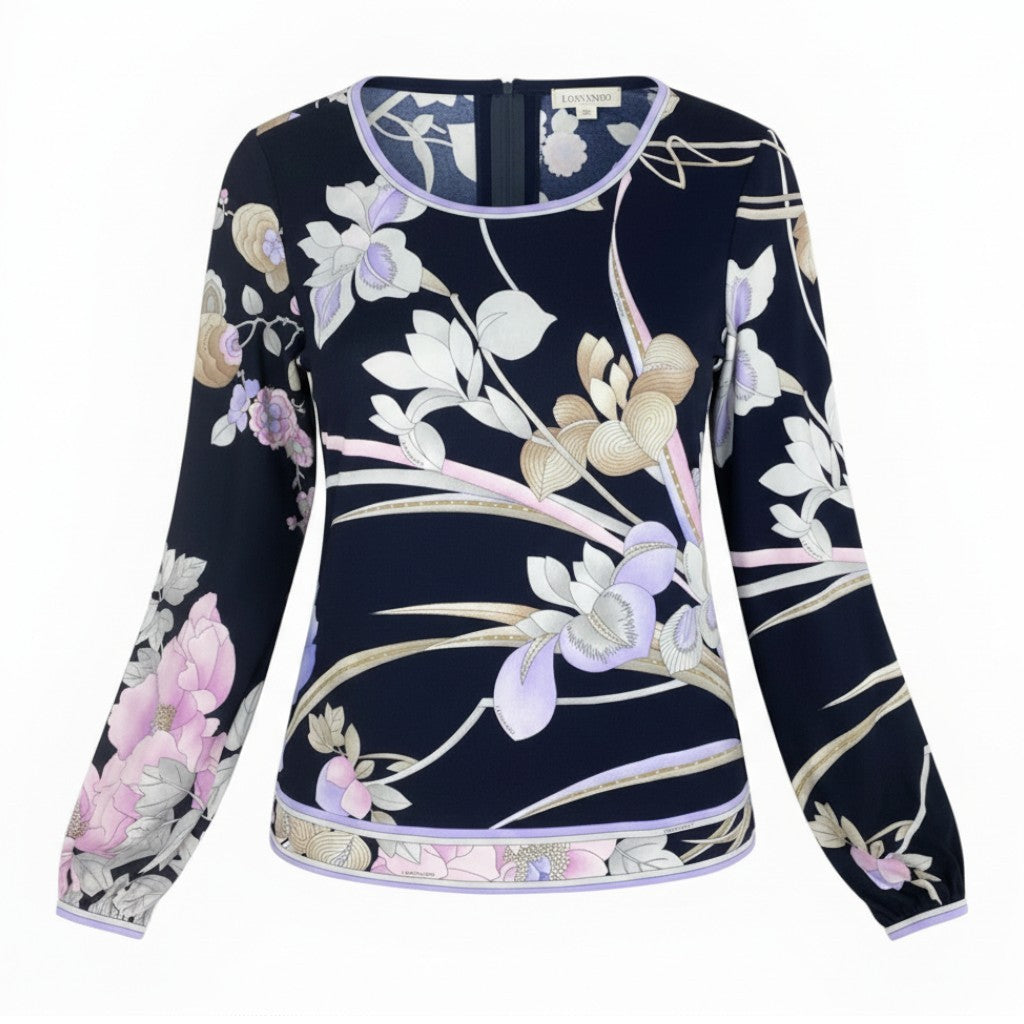 ミッドナイトネイビーをベースに、ラベンダーやベビーピンク、ベージュを配した華やかなフラワープリントが印象的なLEONARDのロングスリーブカットソーです。滑らかで上品な光沢感のある素材に、ブランドらしい繊細なボタニカル柄が映えます。ネックラインと裾にはラベンダーパイピングが施され、全体を引き締めるアクセントになっています。ジャケットのインナーとしても、一枚で主役としても活躍するエレガントな一着です。