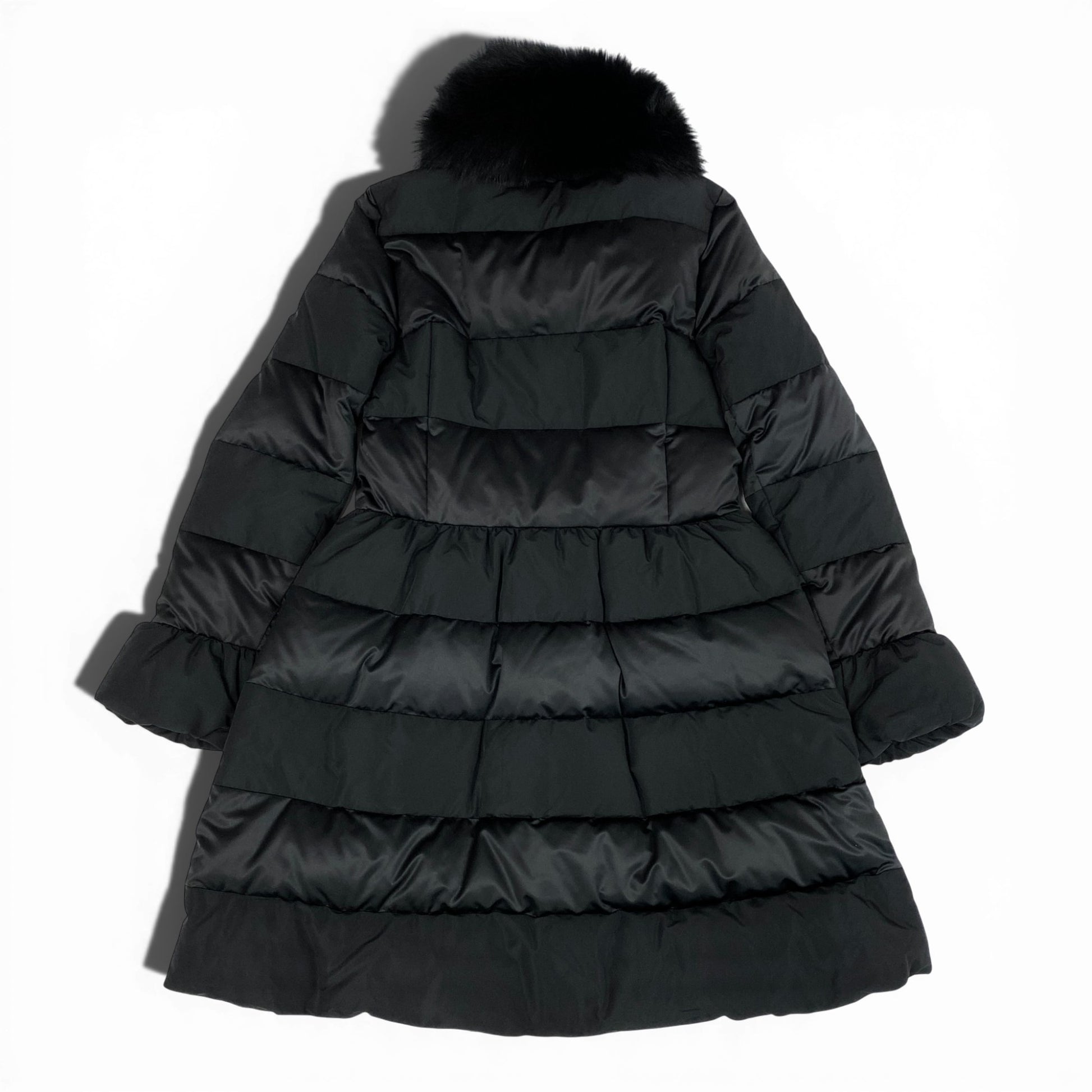 シックなブラックの無地で、光沢を抑えたナイロン系素材が上品な印象のダウンコートです。ボリュームのあるブラックファー付きフードが顔周りを華やかに演出。ウエスト切替のフレアシルエットで、女性らしさと防寒性を両立しています。デイリーから通勤、きれいめなお出かけまで幅広く活躍する一着です。