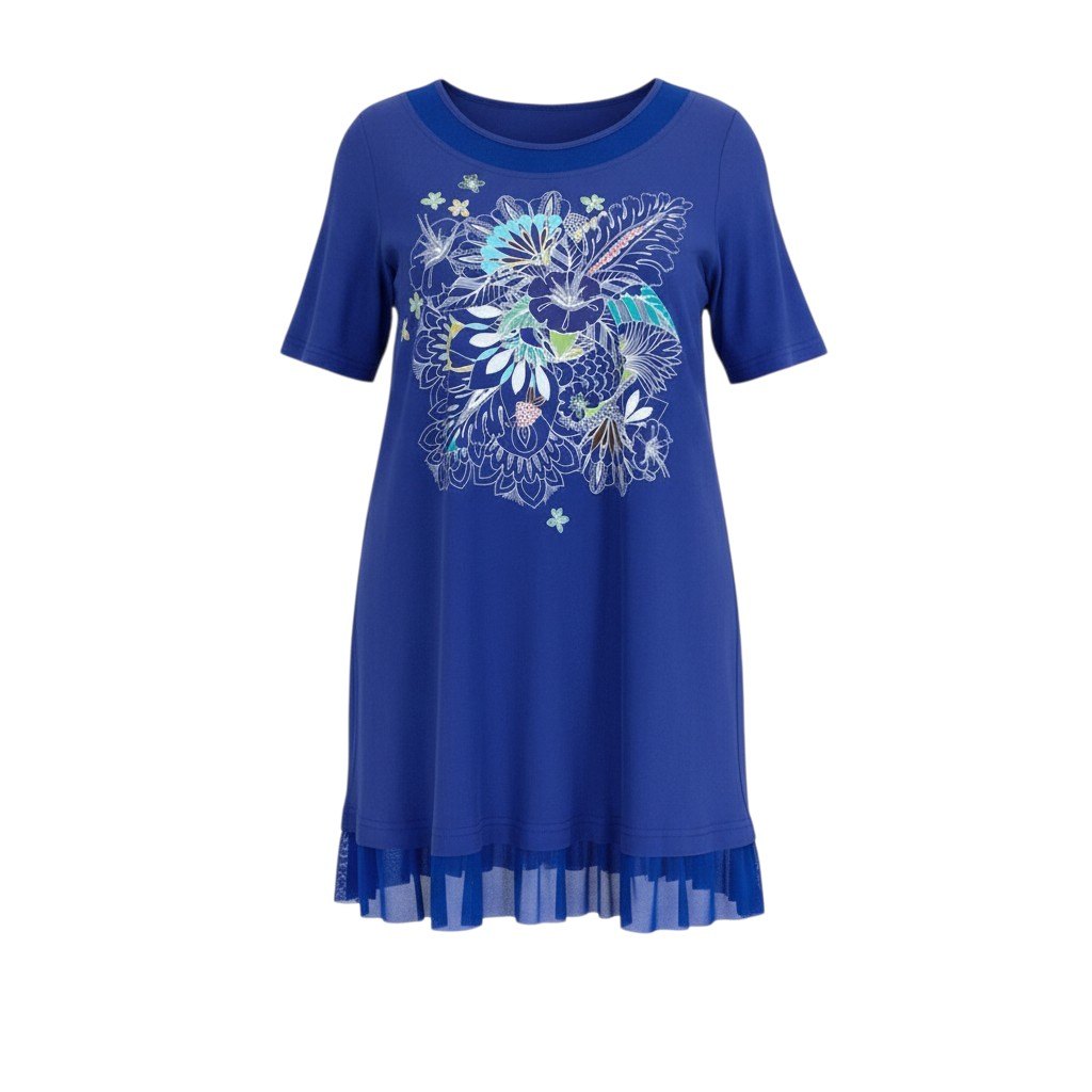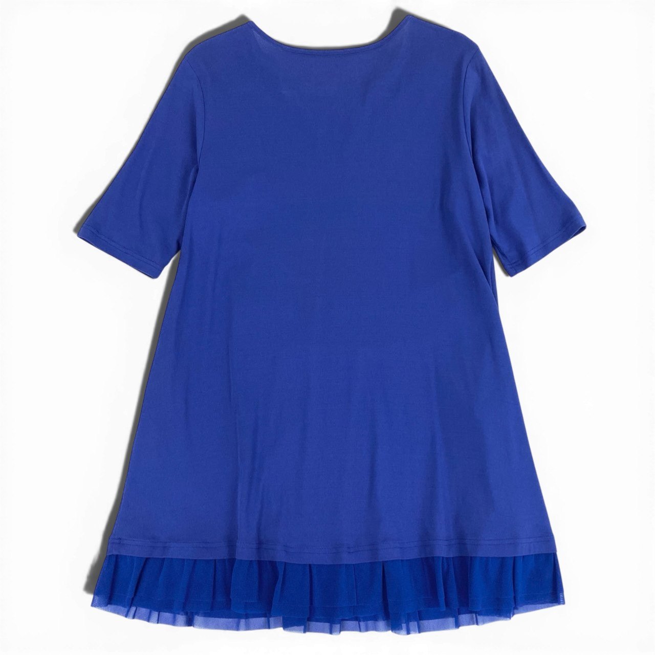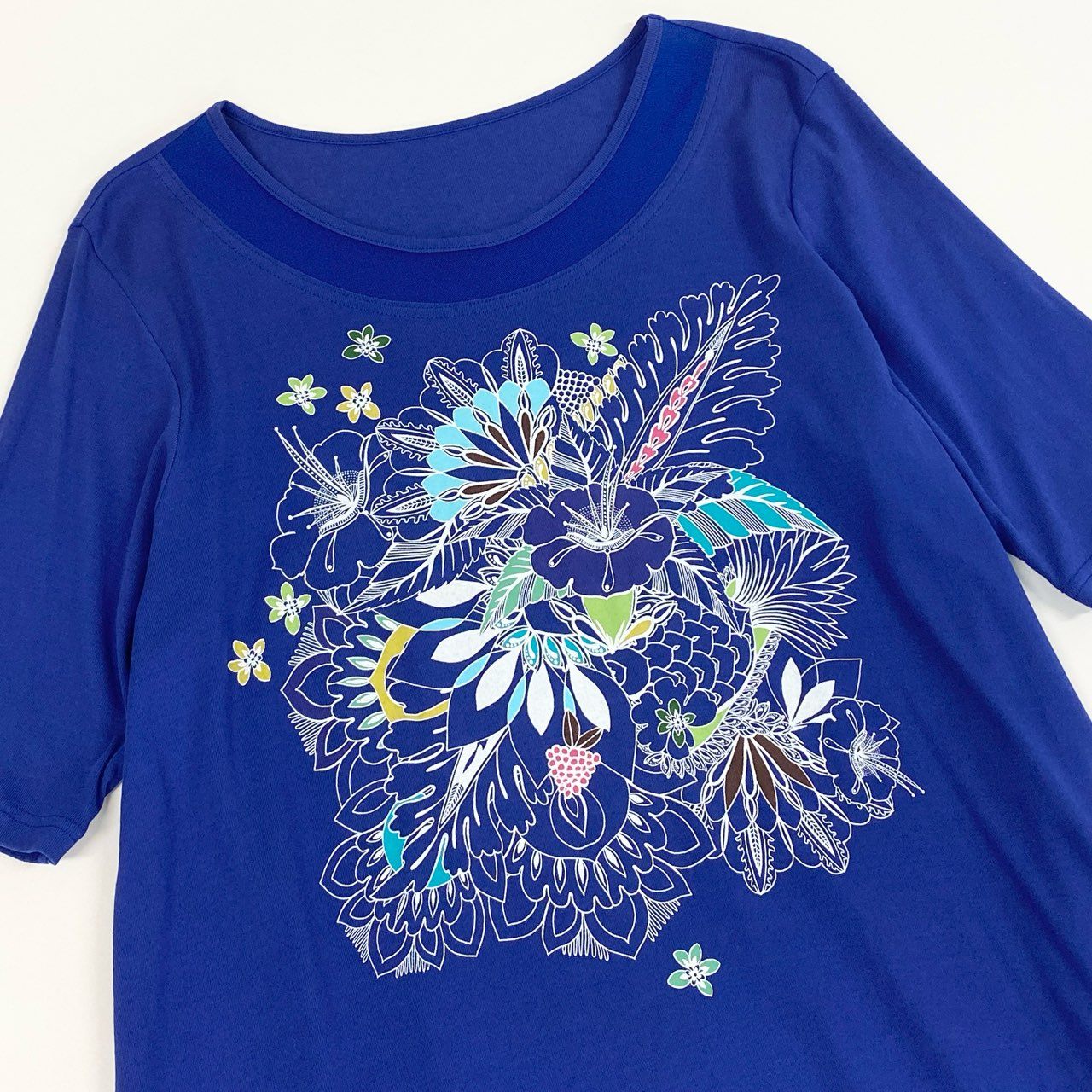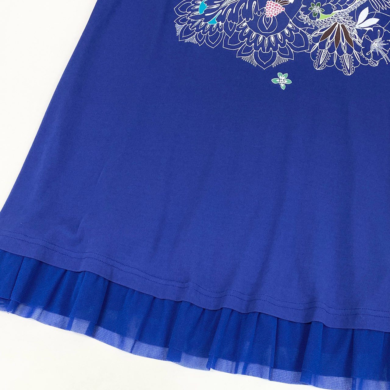 鮮やかなロイヤルブルーをベースに、フラワーモチーフのボタニカルプリントが華やかに映えるチュニックワンピース。 素材はマットでさらりとしたコットン100%、裾はメッシュ切替で軽やかな透け感をプラスしています。 ゆったりとしたシルエットで体型カバーにも優れ、快適な着心地。 デニムやレギンスと合わせたカジュアルスタイルから、リゾートやお出かけシーンまで幅広く活躍する一着です。