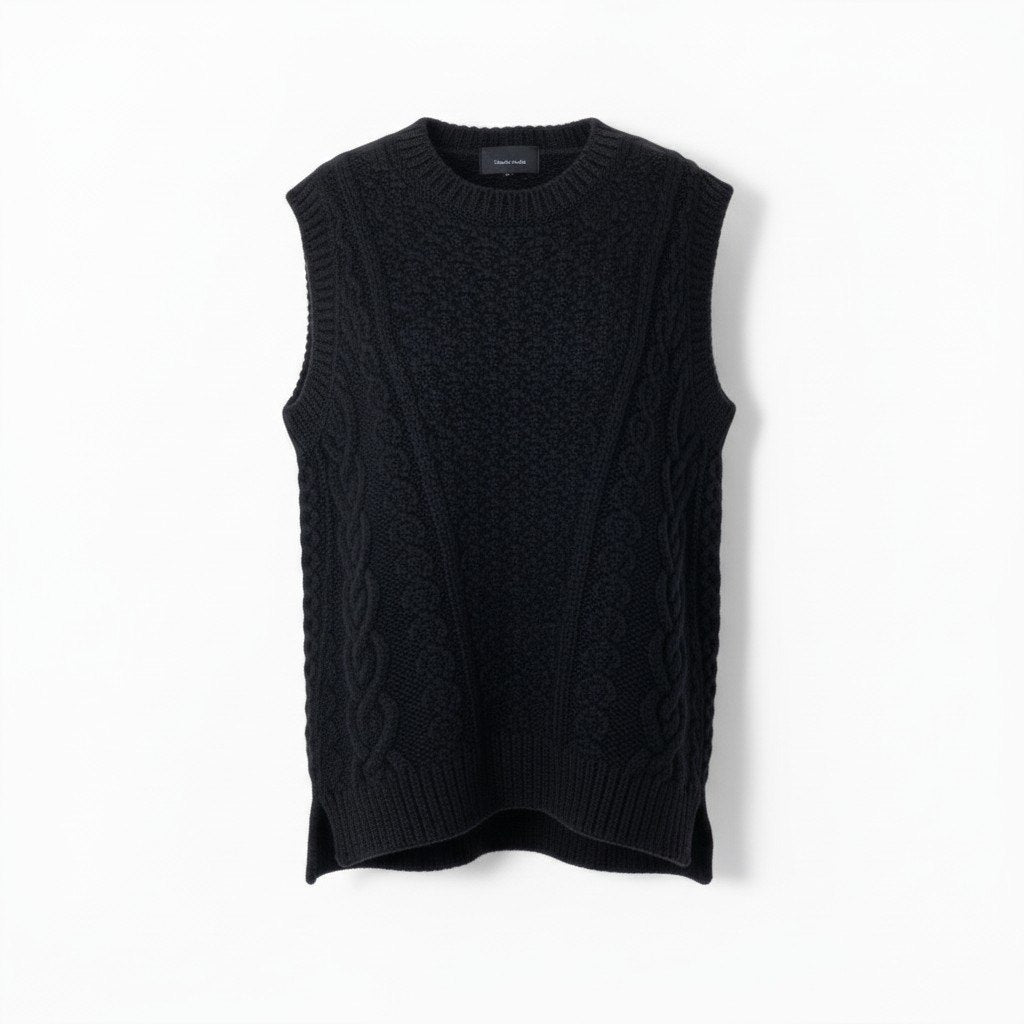 落ち着いたミッドナイトブラックカラーに、立体的なケーブル編みが映えるSimone Rochaのニットベストです。毛足のあるアルパカ混素材で、ふんわりとした柔らかな質感と温かみが魅力。バックオープンデザインが特徴で、シンプルながらモードで個性的な印象を演出します。シャツやワンピースとのレイヤードでコーディネートの主役になる一着です。