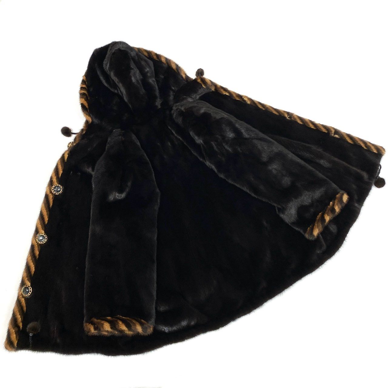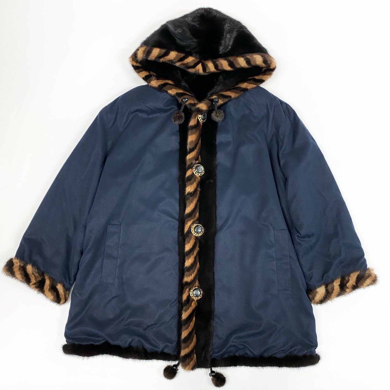 深みのあるミッドナイトブラックのダークミンクを贅沢に使用した、フード付きリバーシブル毛皮コートです。毛足が滑らかで密度が高く、上品な光沢感がラグジュアリーな雰囲気を演出します。フードまわりと前立て、袖口にはキャメルブラウン×ブラックのタイガーストライプ柄ファーをあしらい、存在感のあるデザインに。装飾性のあるメタルボタンやファーポンポン付きドローコードがアクセントとなり、ドレスアップからモードなカジュアルスタイルまで幅広く活躍する希少な一着です。