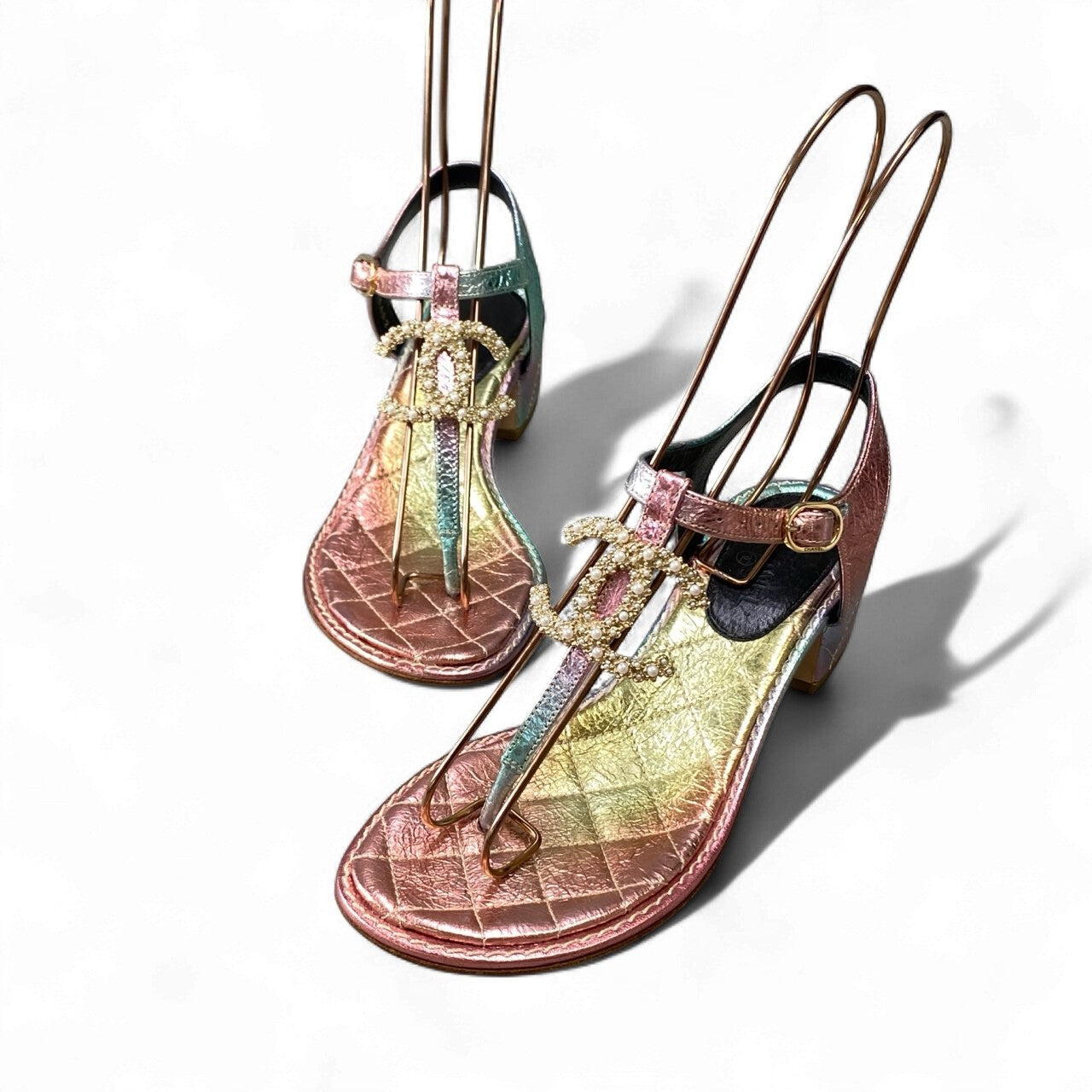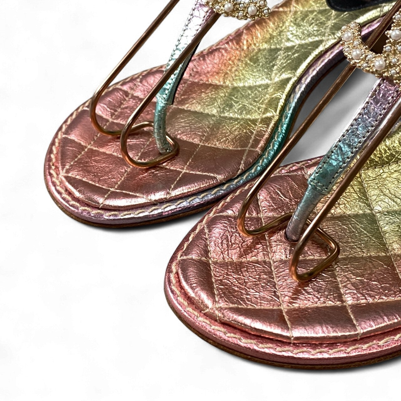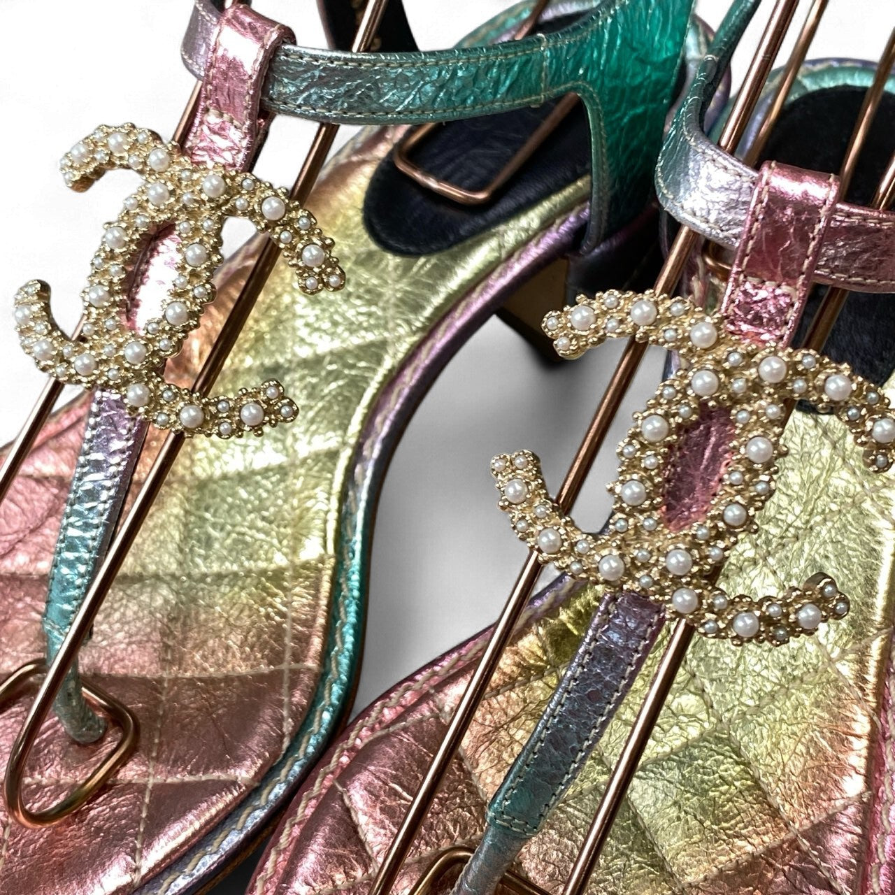 CHANELのサンダル。ピンク・ゴールド・グリーンが溶け込むように輝くレインボーメタリックレザーが美しく、足元を華やかに演出します。大粒パールを敷き詰めたCCロゴのビジュー装飾がラグジュアリー感を高め、夏のサンダルスタイルを一段と上質に。3.5cmの程よいヒールと柔らかなレザーで履き心地も良く、リゾート、シティユース、パーティーシーンにも最適です。コーディネートの主役になる、特別感あふれる一足です。
