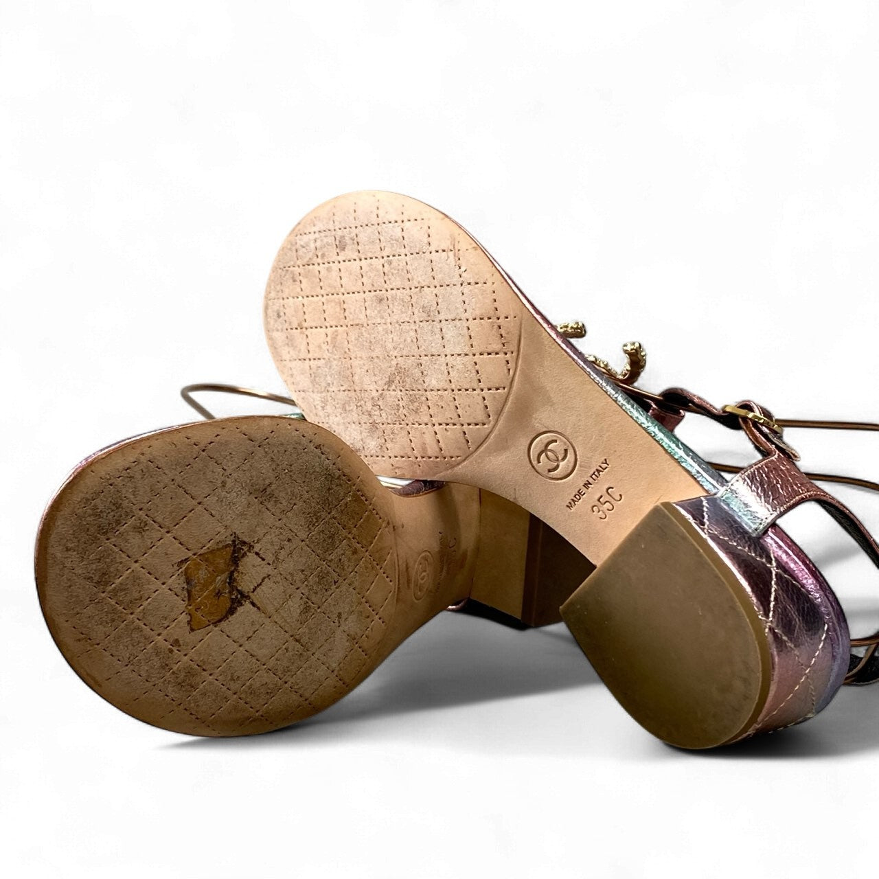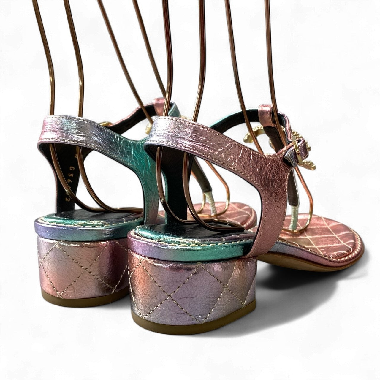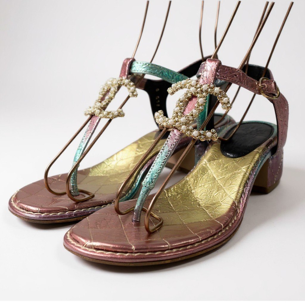 CHANELのサンダル。ピンク・ゴールド・グリーンが溶け込むように輝くレインボーメタリックレザーが美しく、足元を華やかに演出します。大粒パールを敷き詰めたCCロゴのビジュー装飾がラグジュアリー感を高め、夏のサンダルスタイルを一段と上質に。3.5cmの程よいヒールと柔らかなレザーで履き心地も良く、リゾート、シティユース、パーティーシーンにも最適です。コーディネートの主役になる、特別感あふれる一足です。