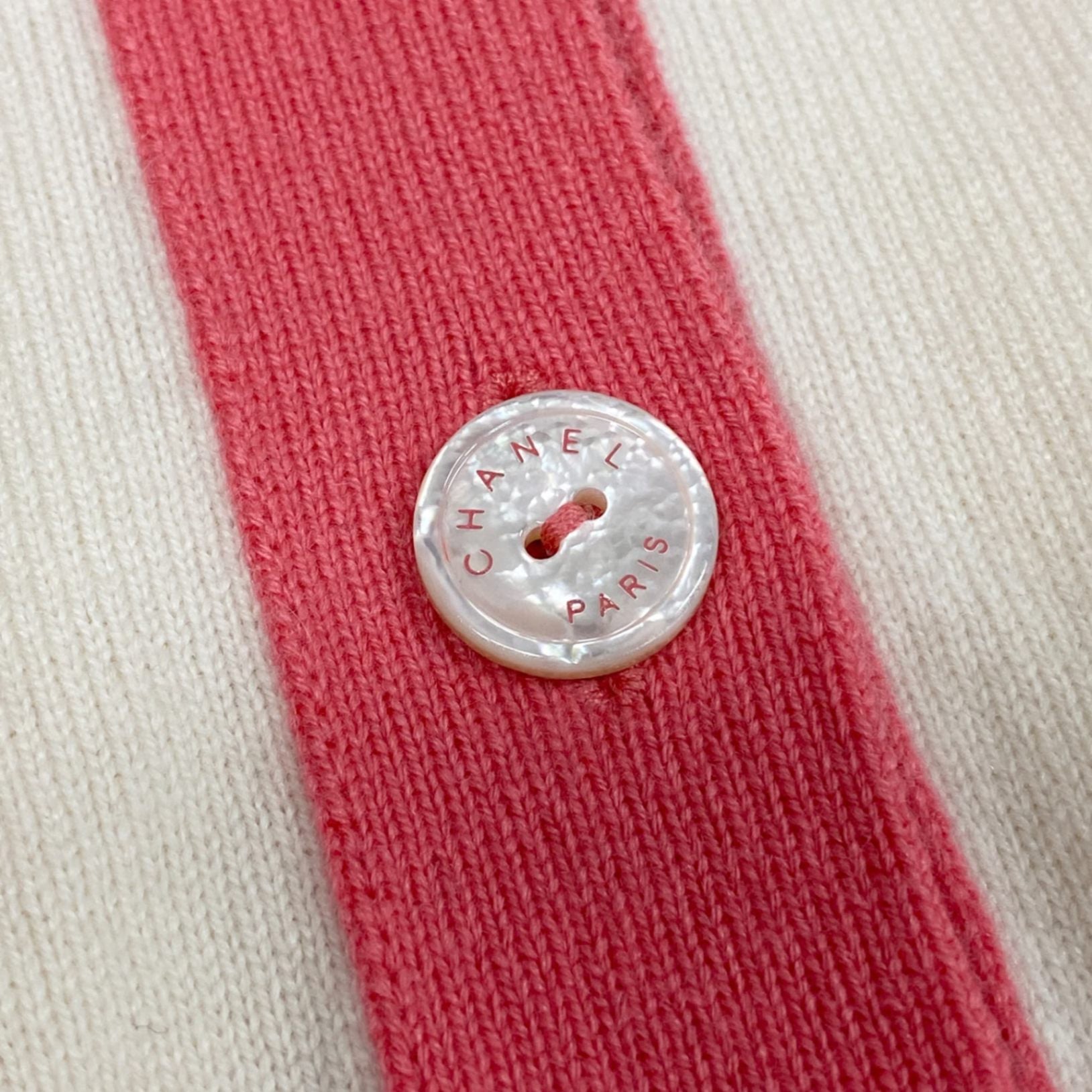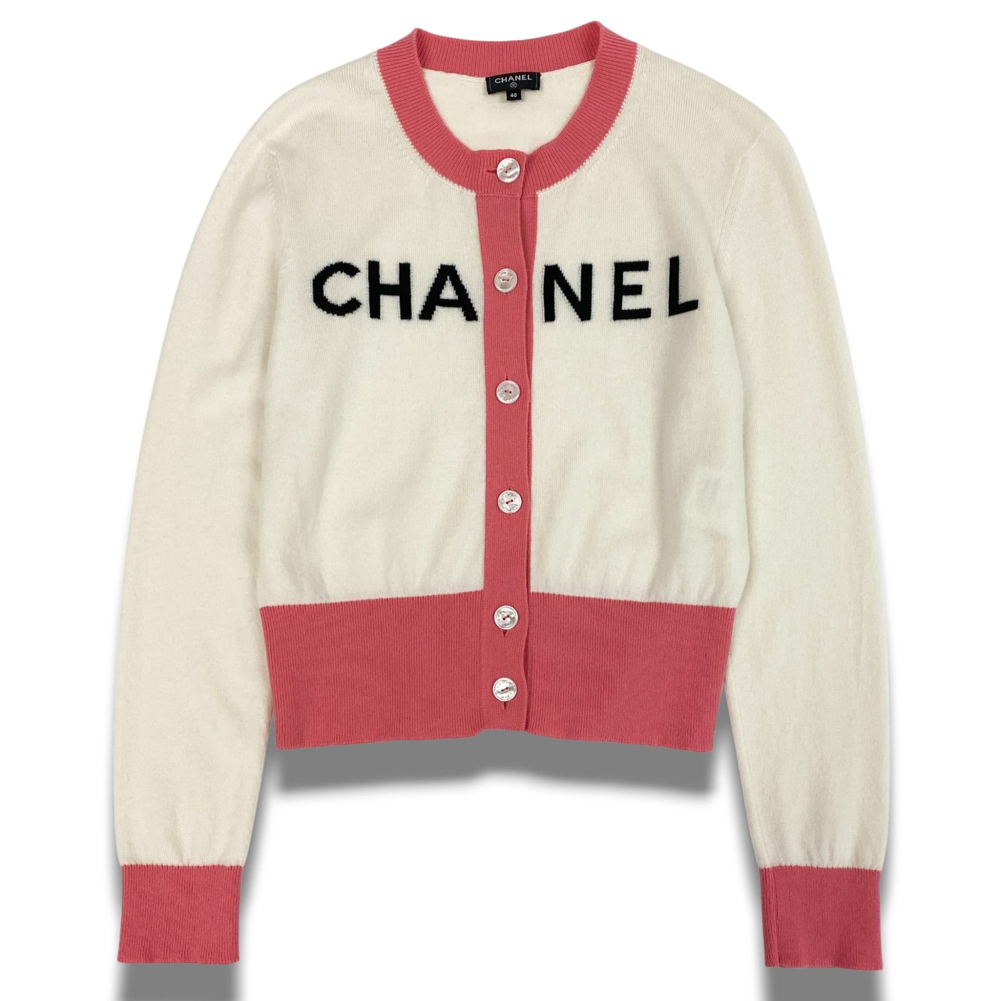 シャネルのアイボリーホワイト×コーラルピンクが華やかなカーディガンです。フロントには大胆なロゴデザインが施され、バイカラーの配色が印象的。しなやかで柔らかなニット素材に、ロゴ入りボタンが高級感をプラスします。コンパクトな丈感でスタイルアップ効果があり、デニムからフェミニンなスカートまで幅広く合わせられる主役級の一着です。