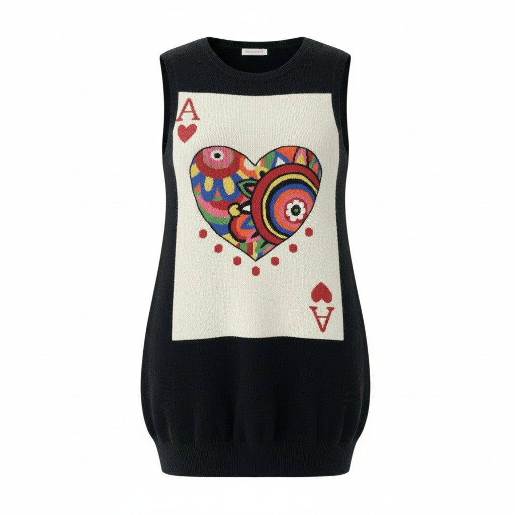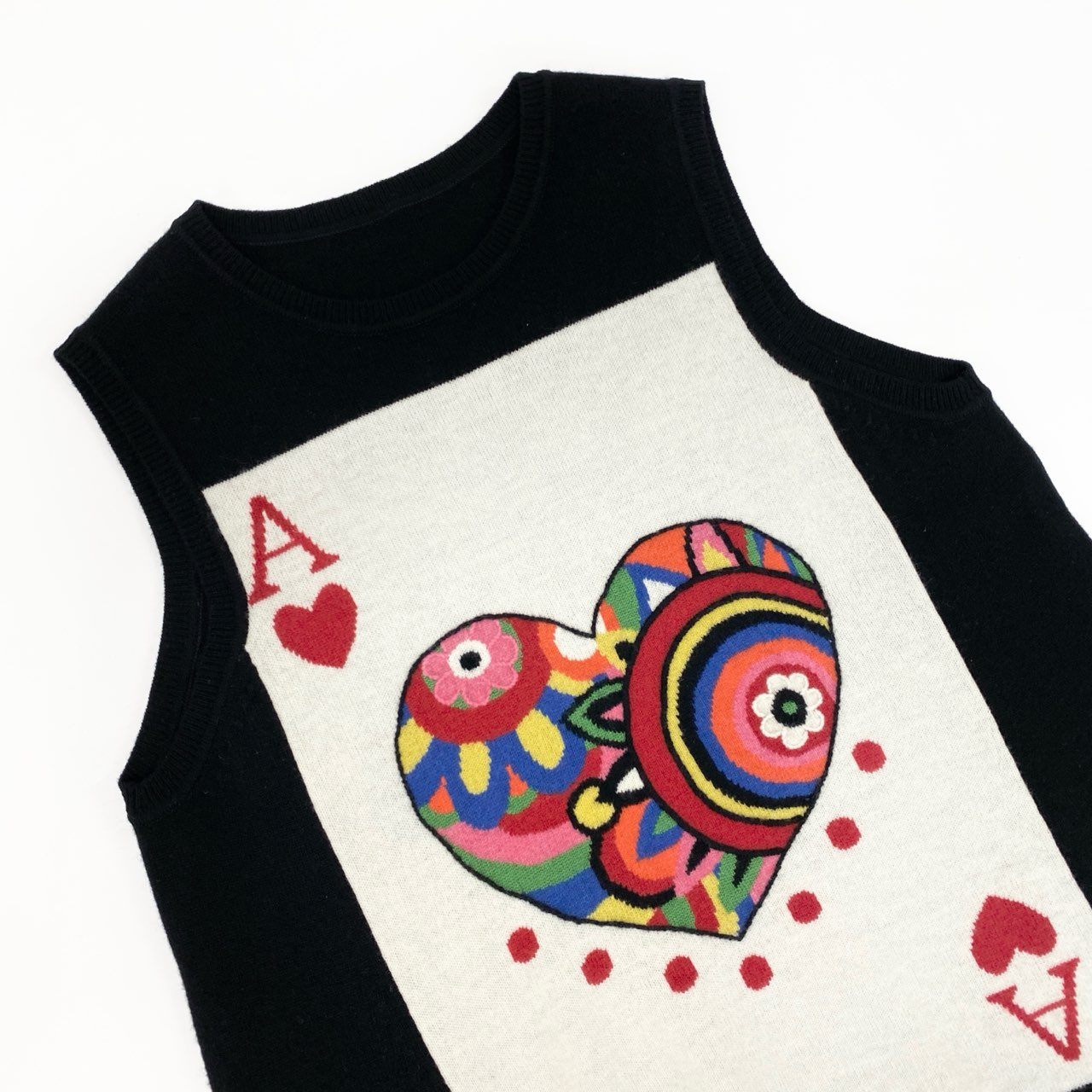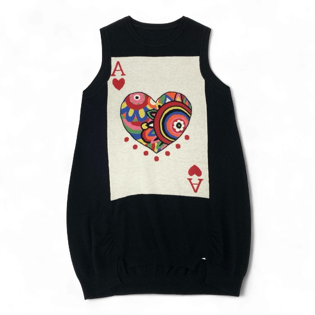 ブラックベースに、フロントへ大きく配置されたトランプの“A・ハート”モチーフが目を引くニットワンピースです。ハートの内部はビビッドカラーの花柄×抽象柄が組み合わされ、トクコプルミエヴォルらしいアート性の高いデザインが際立ちます。ニット特有の柔らかさと伸縮性があり、着心地も快適。1枚で主役になる存在感抜群のワンピースで、お出かけや旅行、ショーシーンにもおすすめの一着です。