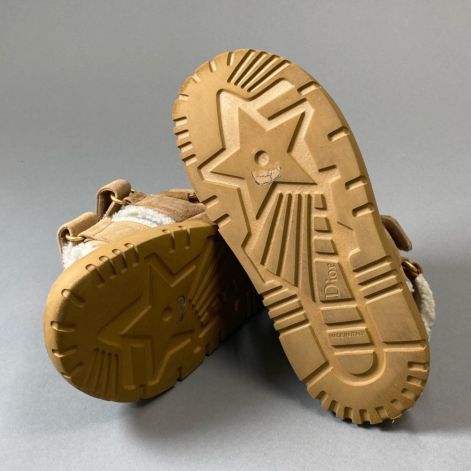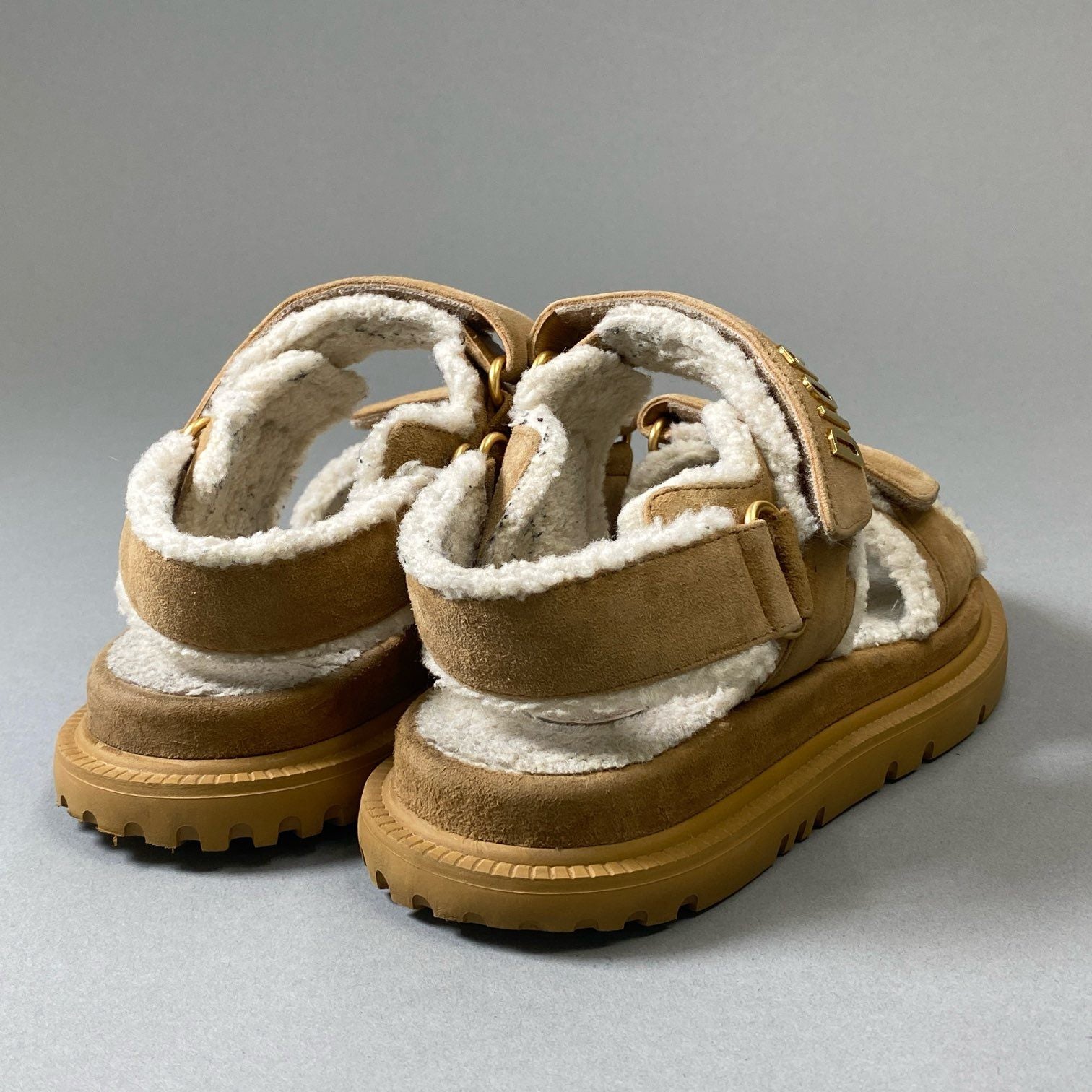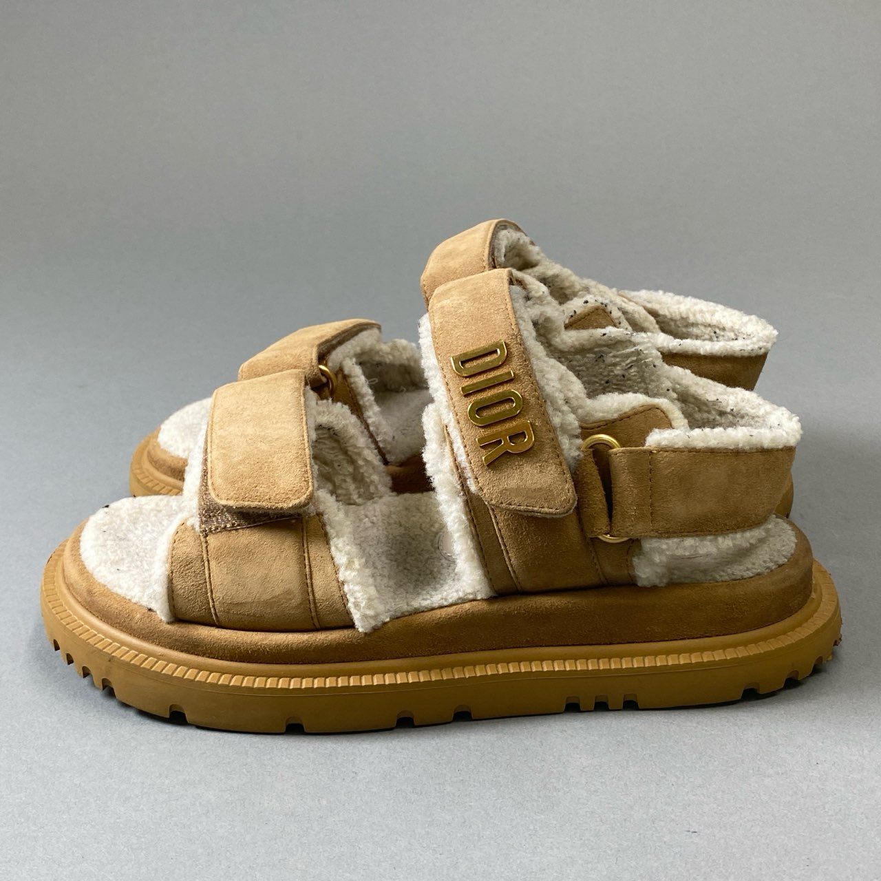クリスチャンディオールのラグジュアリーサンダル。キャメルベージュのゴートスキンを用い、内側にはふわふわのシープファーライニングを施した贅沢な仕様です。アッパーにはゴールドの「DIOR」ロゴがあしらわれ、上品なアクセントに。ボリューム感のあるソールはアウトドアテイストを取り入れつつ、都会的なファッションにもマッチします。カジュアルなデイリースタイルはもちろん、リゾートやトラベルシーンでも活躍する一足です。