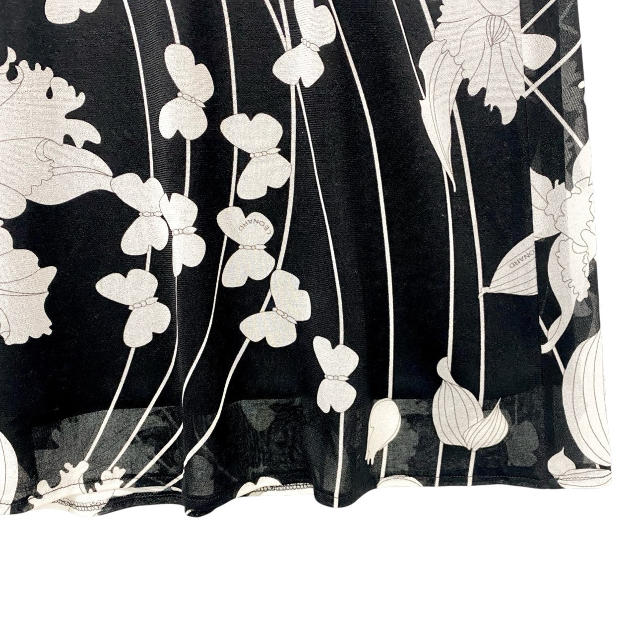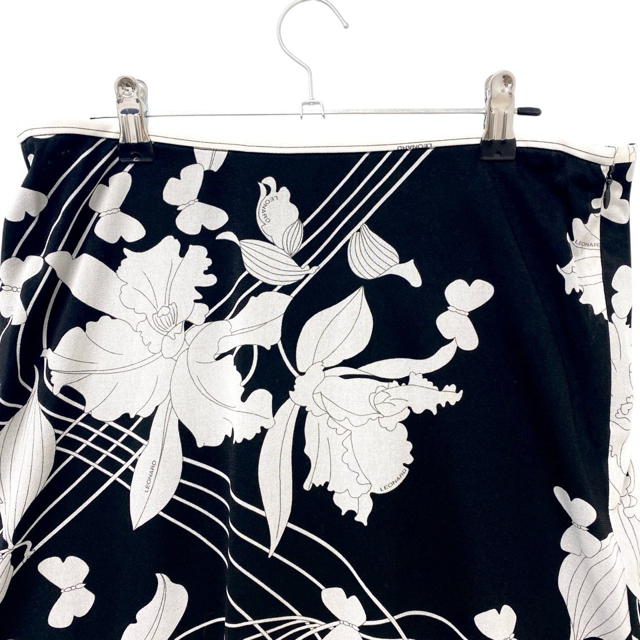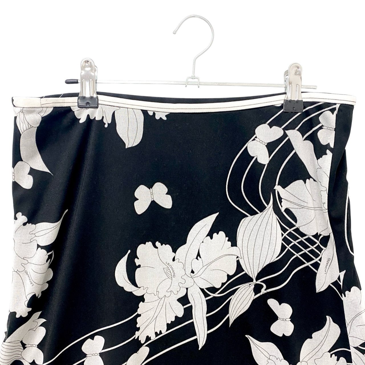 73c13 LEONARD レオナール カンカン素材 美しい花柄プリント フレアスカート 膝丈スカート 73 モノトーン レディースu02t