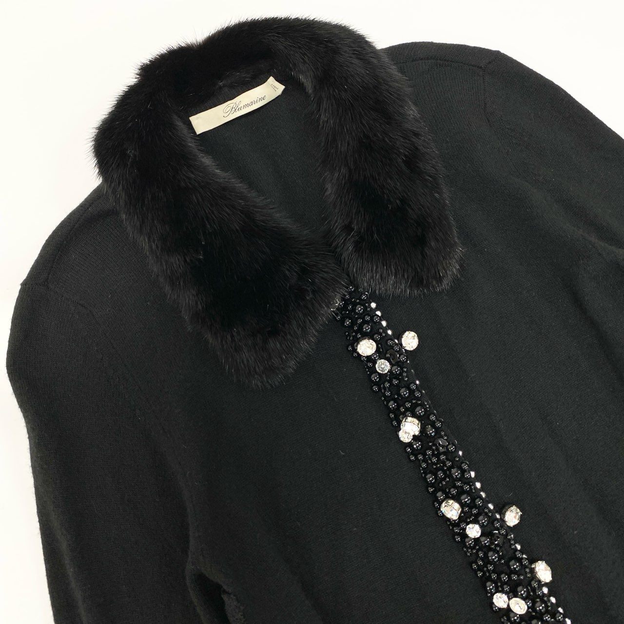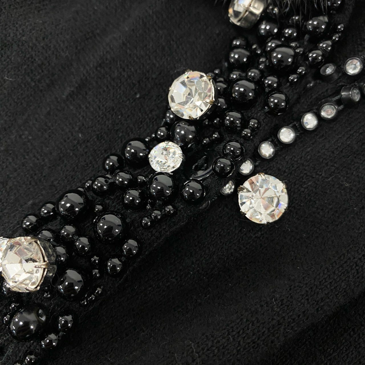 BLUMARINE(ブルマリン)のブラックニットセーター。マットなウール素材をベースに、襟元にはふんわりとしたフェイクファーを、フロントにはビーズとレース装飾を施した華やかなデザインです。上品な光沢を放つビジューディテールがエレガントさを際立たせ、シンプルなボトムと合わせても存在感のある一着。デートや特別なディナー、パーティーシーンにも映えるラグジュアリーニットです。