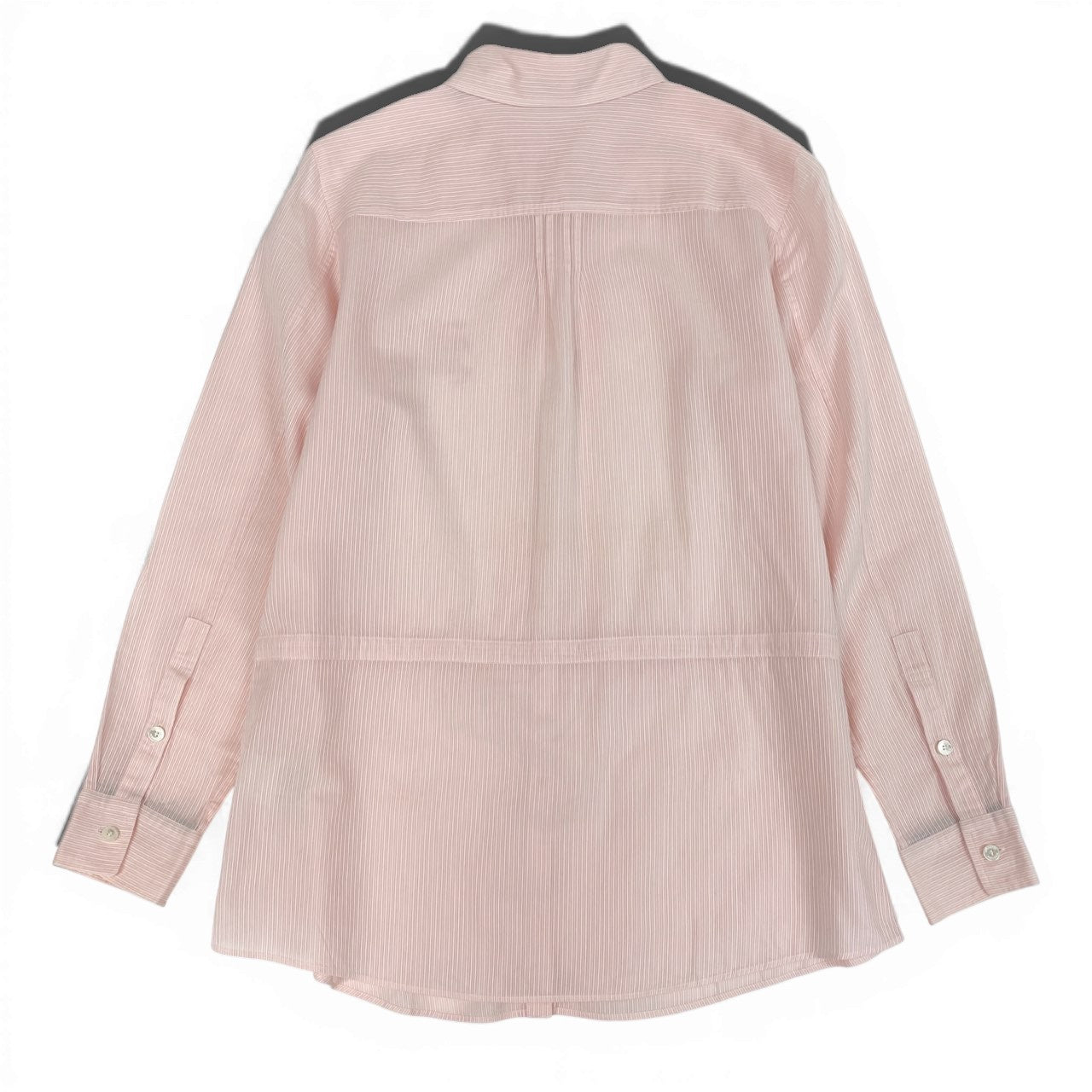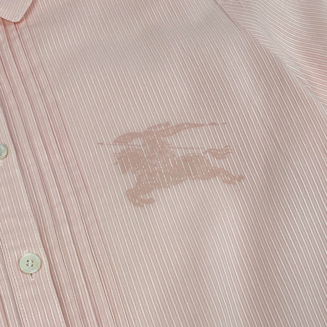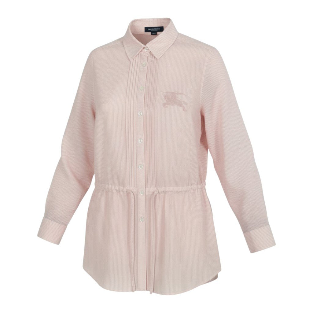 淡いベビーピンクの無地に、繊細なストライプ織りが入った上品なデザインです。 マットでなめらかなコットン調素材に、胸元のホース刺繍ロゴがさりげないアクセント。 フロントのピンタックとウエストドローコードがフェミニンなシルエットを演出します。 オフィススタイルやきれいめカジュアルに活躍する、バーバリーらしい洗練された長袖ブラウスです。