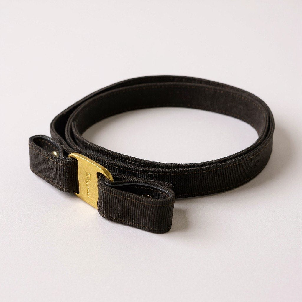Salvatore Ferragamoらしい上品さが際立つレディースベルト。 ダークブラウン系のリブ織りファブリックに、ゴールドトーンのフック型メタル金具を合わせた洗練デザインです。 素材はマットで柔らかな質感で、軽やかな着け心地が魅力。 ワンピースやスカートのウエストマーク、きれいめパンツのアクセントとして活躍する一本です。