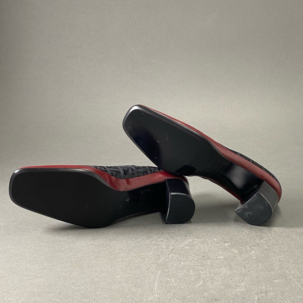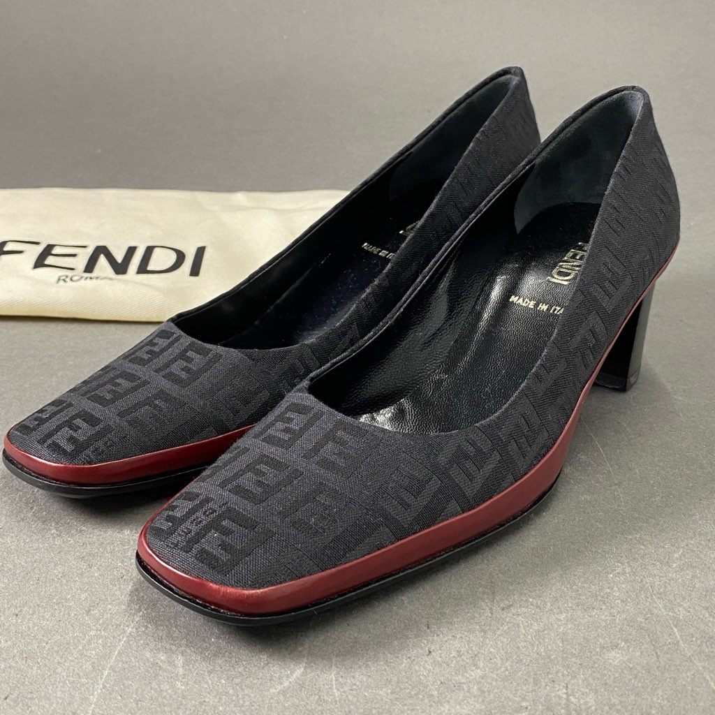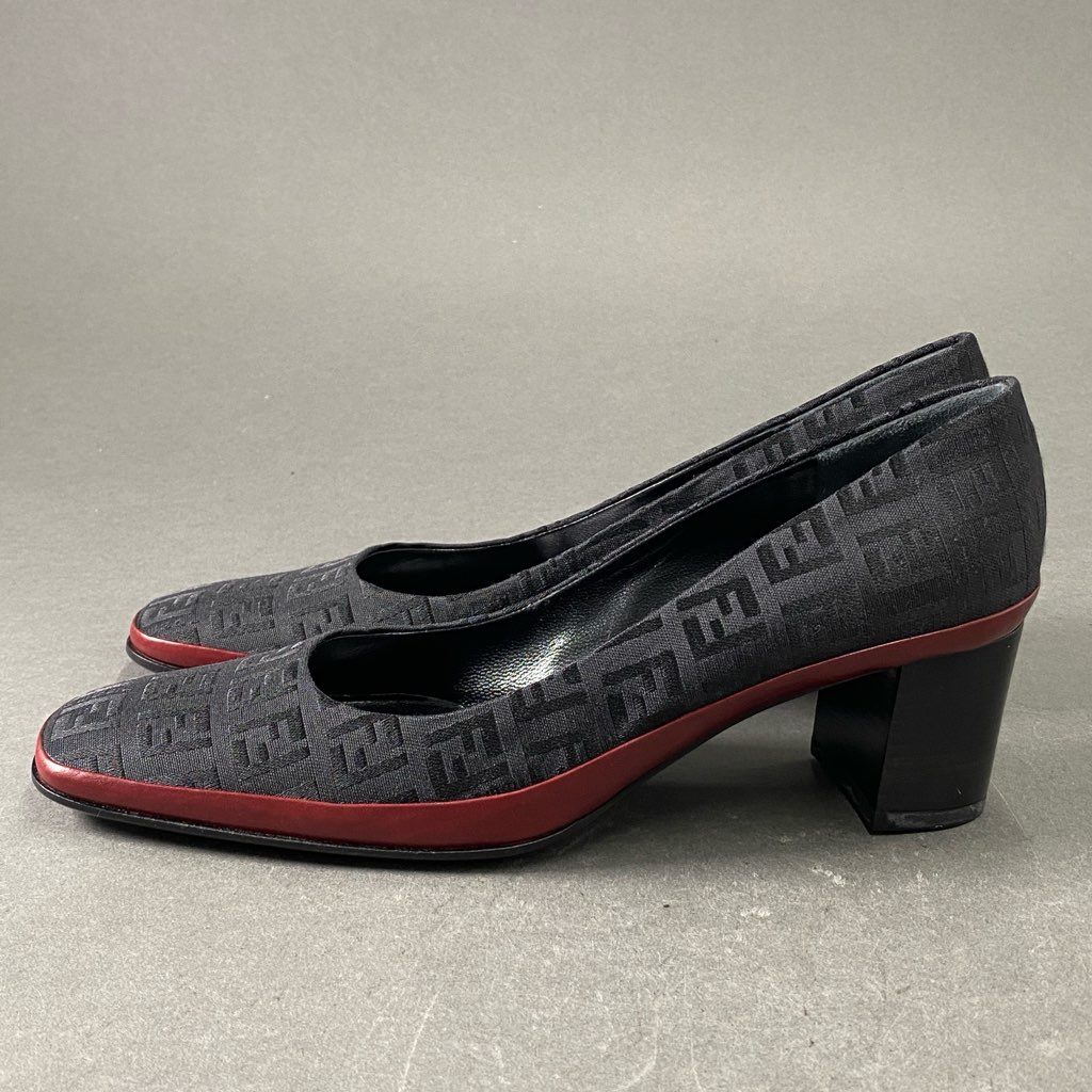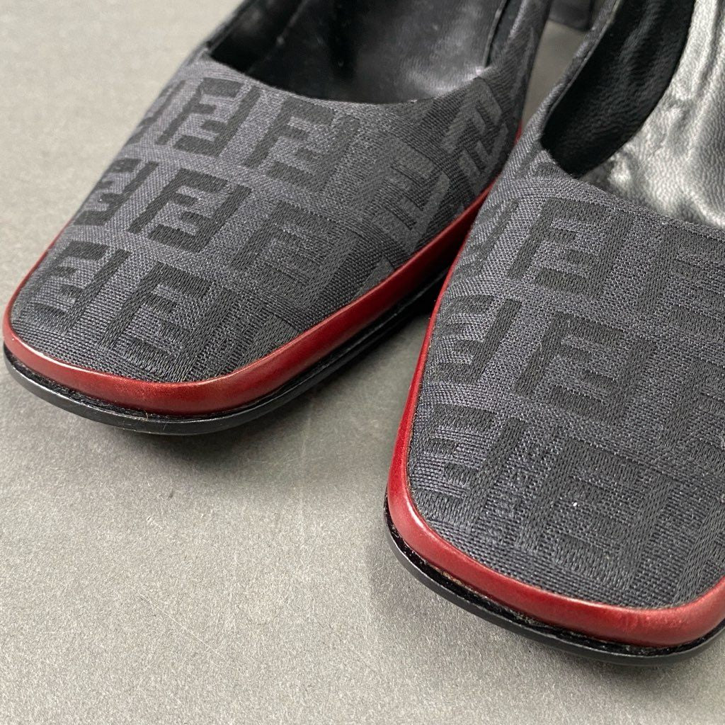 9f13 《美品》 FENDI フェンディ ズッカ柄 チャンキーヒール パンプス 36 ブラック レッド キャンバス イタリア製 シューズ