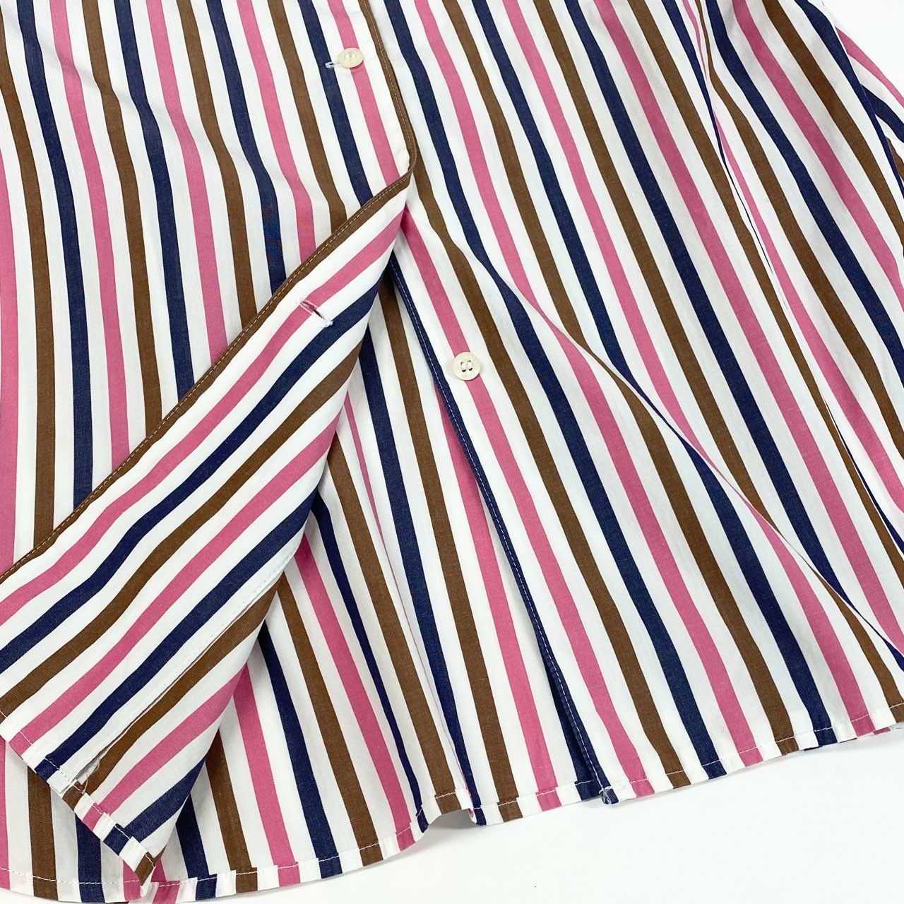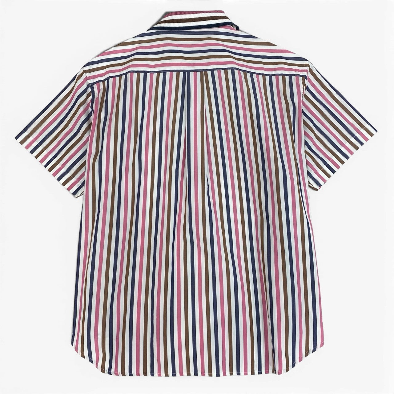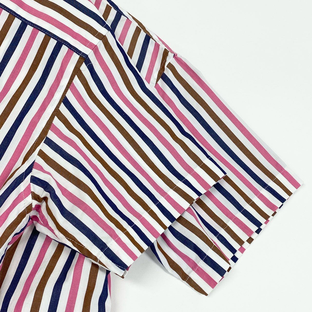Christian Diorのレディース 半袖シャツです。ホワイト×ネイビー×ピンク×ブラウン系のマルチカラーストライプ柄が爽やかで、胸元のエンブレム刺繍が上品なアクセント。さらりとした**シャツ生地(コットン系のマットな質感)**で、暑い季節も快適な着心地です。デニムやスラックス、スカートとも合わせやすく、通勤・きれいめカジュアル・リゾートまで幅広く活躍します。