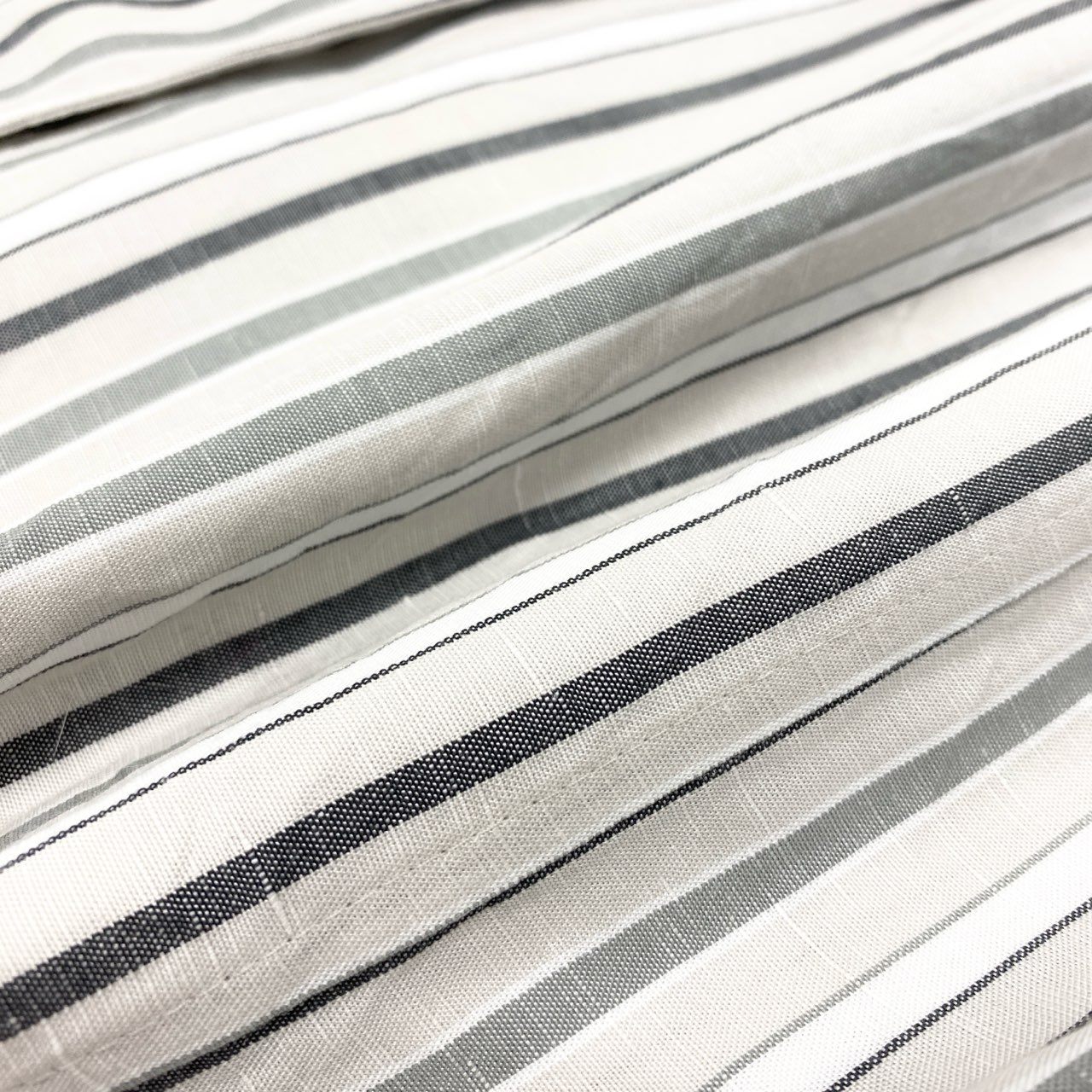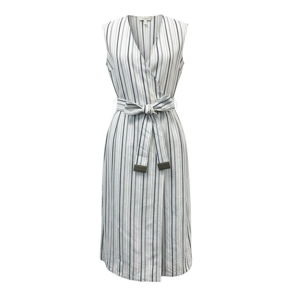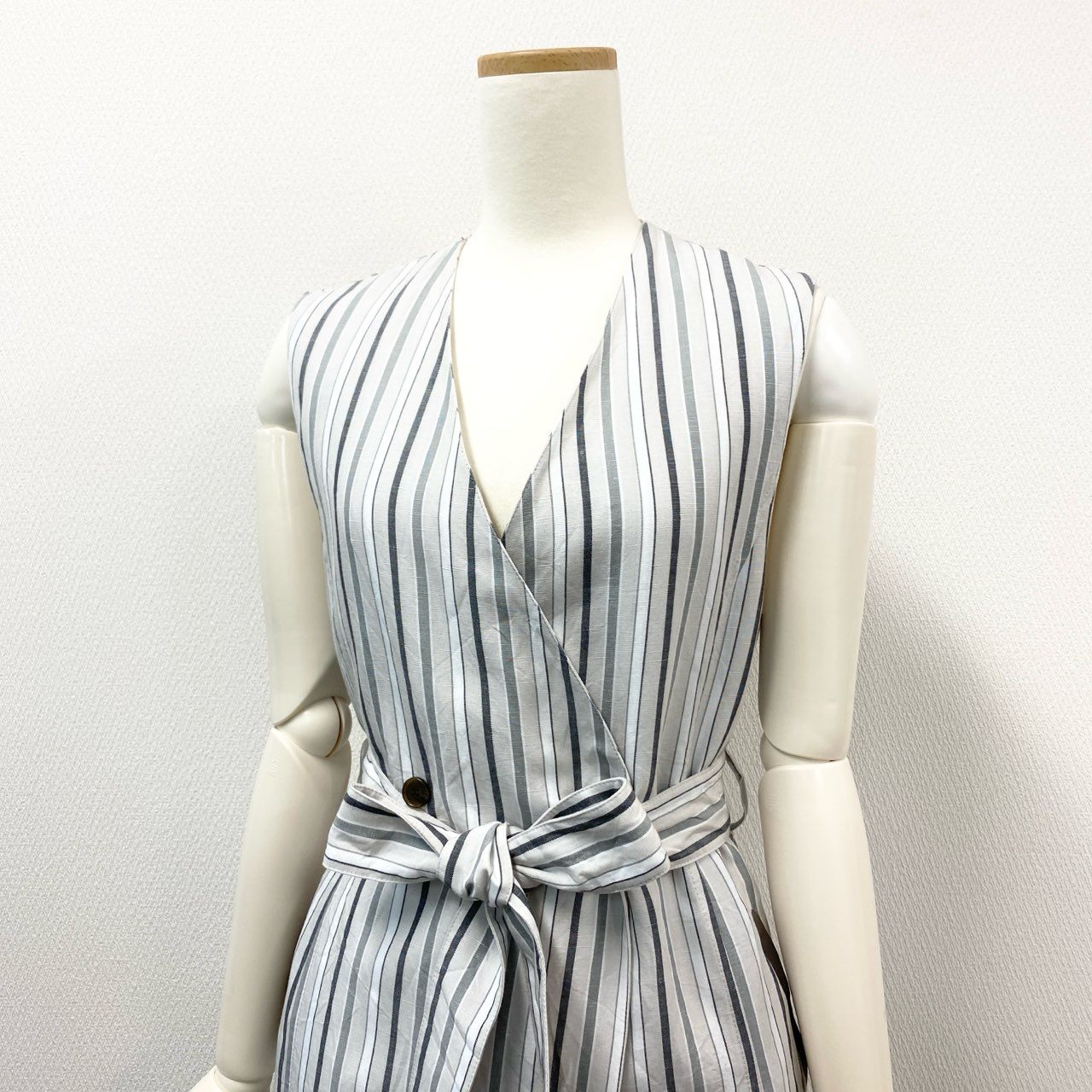 カラーはライトグレーをベースに、チャコールグレーの細ストライプ柄が入った落ち着いた印象。素材はリネンブレンドのマットな天然繊維の風合いがあり、軽やかで涼しげな着心地です。前合わせはラップデザインで、共布ベルトを結ぶことでウエストラインに上品なメリハリが生まれます。ヒールにもフラットにも合わせやすく、お出かけ・通勤・リゾートシーンまで活躍できる上質ワンピースです。