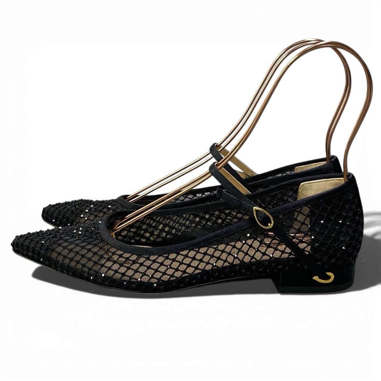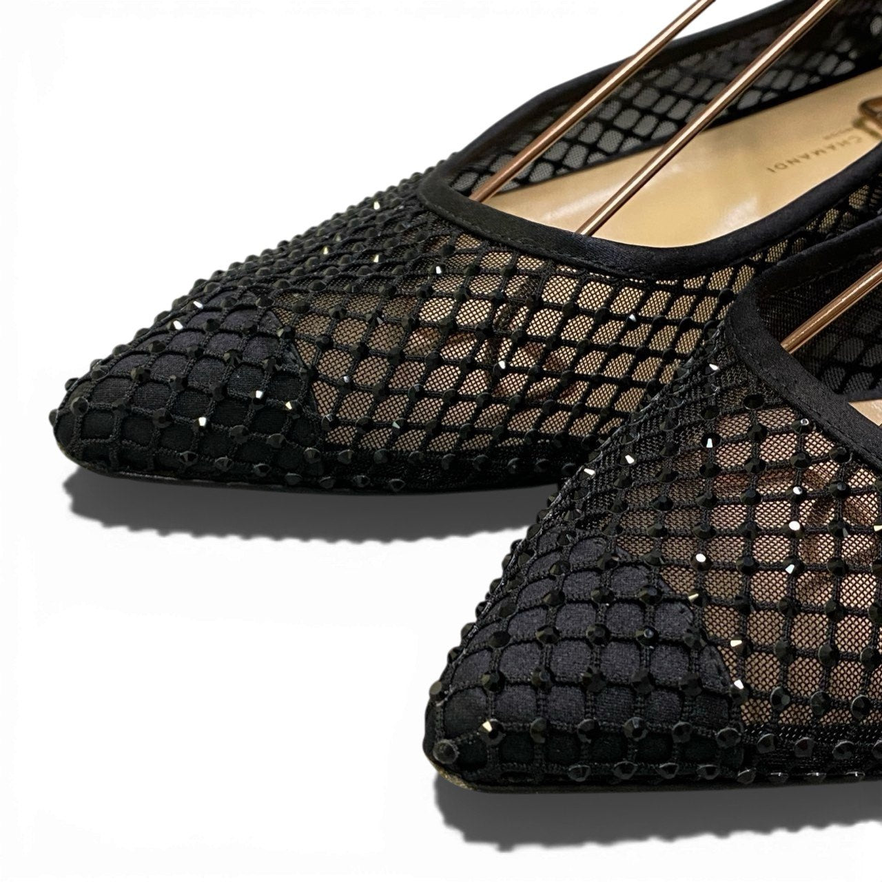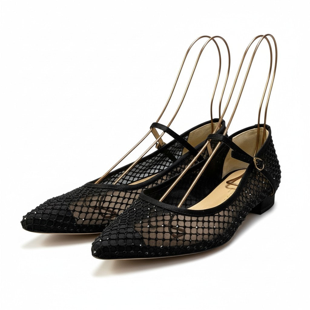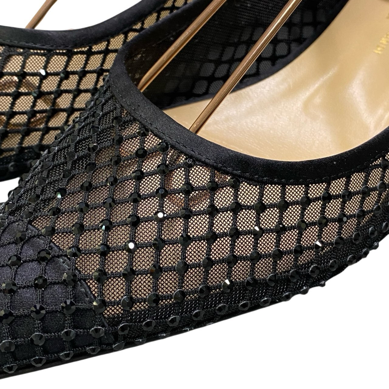 上品なブラックカラーのメッシュ素材を使用したポインテッドトゥパンプスです。 格子状のネットパターンに繊細なラインストーン装飾が施され、華やかさと抜け感を両立したデザインが魅力。 ローヒールとアンクルストラップ仕様で安定感があり、ドレスアップシーンからパーティー、セレモニーまで幅広く活躍します。 シアー感のある軽やかな素材が足元を美しく演出し、春夏コーデのアクセントにもおすすめの一足です。