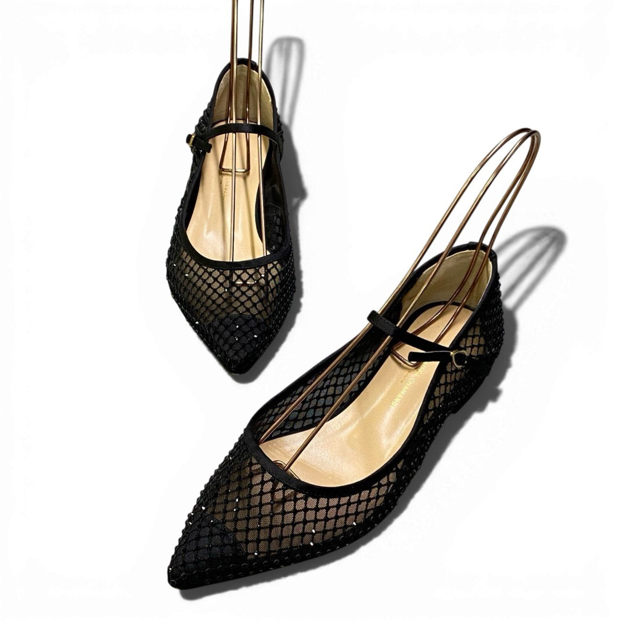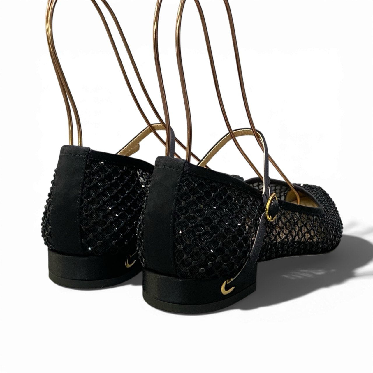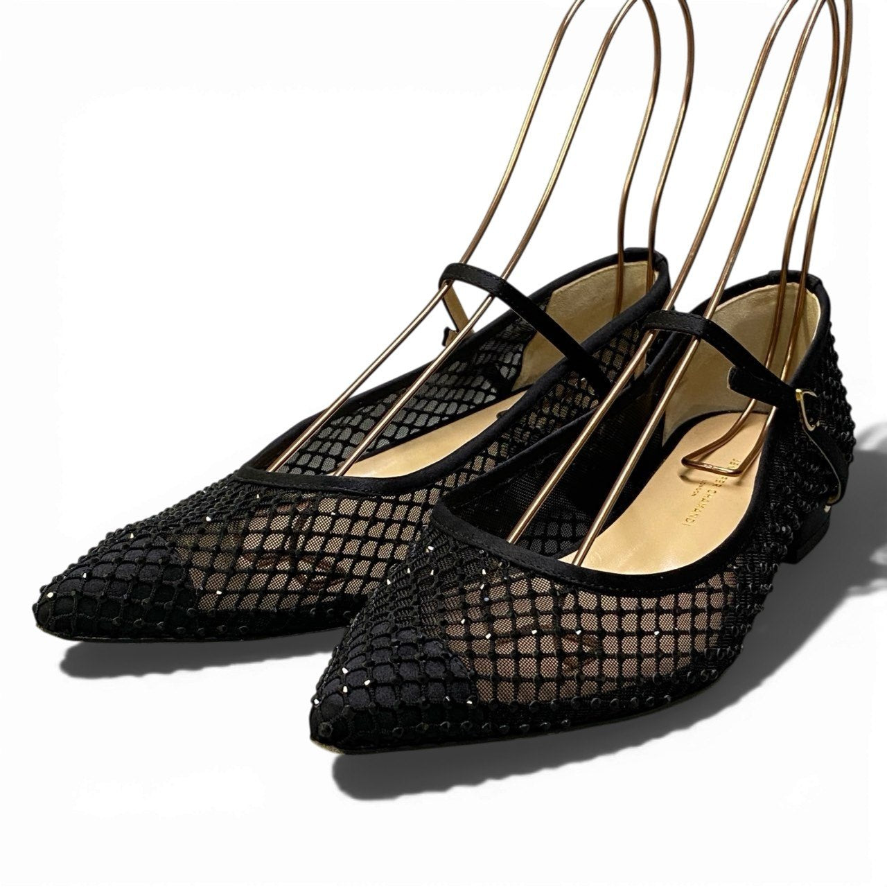 上品なブラックカラーのメッシュ素材を使用したポインテッドトゥパンプスです。 格子状のネットパターンに繊細なラインストーン装飾が施され、華やかさと抜け感を両立したデザインが魅力。 ローヒールとアンクルストラップ仕様で安定感があり、ドレスアップシーンからパーティー、セレモニーまで幅広く活躍します。 シアー感のある軽やかな素材が足元を美しく演出し、春夏コーデのアクセントにもおすすめの一足です。