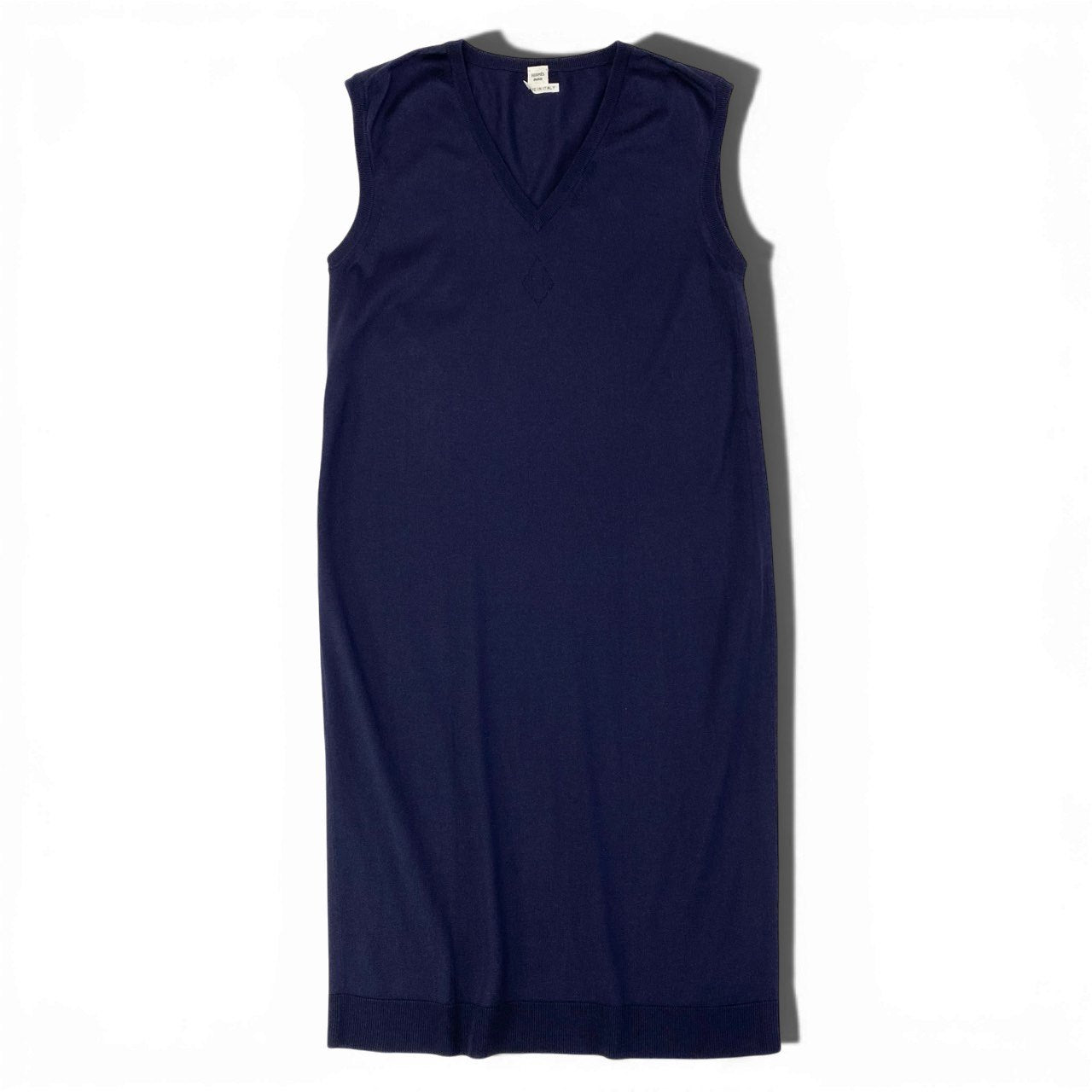 2a29【美品】HERMES エルメス ノースリーブニットワンピース Vネック 胸元ロゴ 36サイズ ネイビー コットン100% レディース 女性用o07t