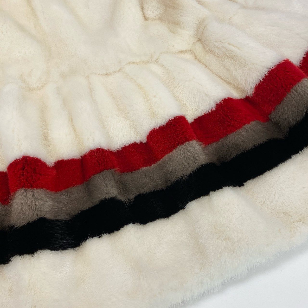 Pellicce Moda(ペリッチェ・モーダ)のミンクファーベスト。上質なホワイトミンクをベースに、裾にレッド・グレー・ブラックのストライプラインをあしらった華やかなデザインです。柔らかく艶やかな本毛皮を贅沢に使用し、軽やかでありながら高い保温性を実現。Aラインシルエットが女性らしさを引き立て、ドレスやニットの上に羽織るだけで洗練された印象に。特別なシーンやパーティーコーデにも最適なラグジュアリーアイテムです。