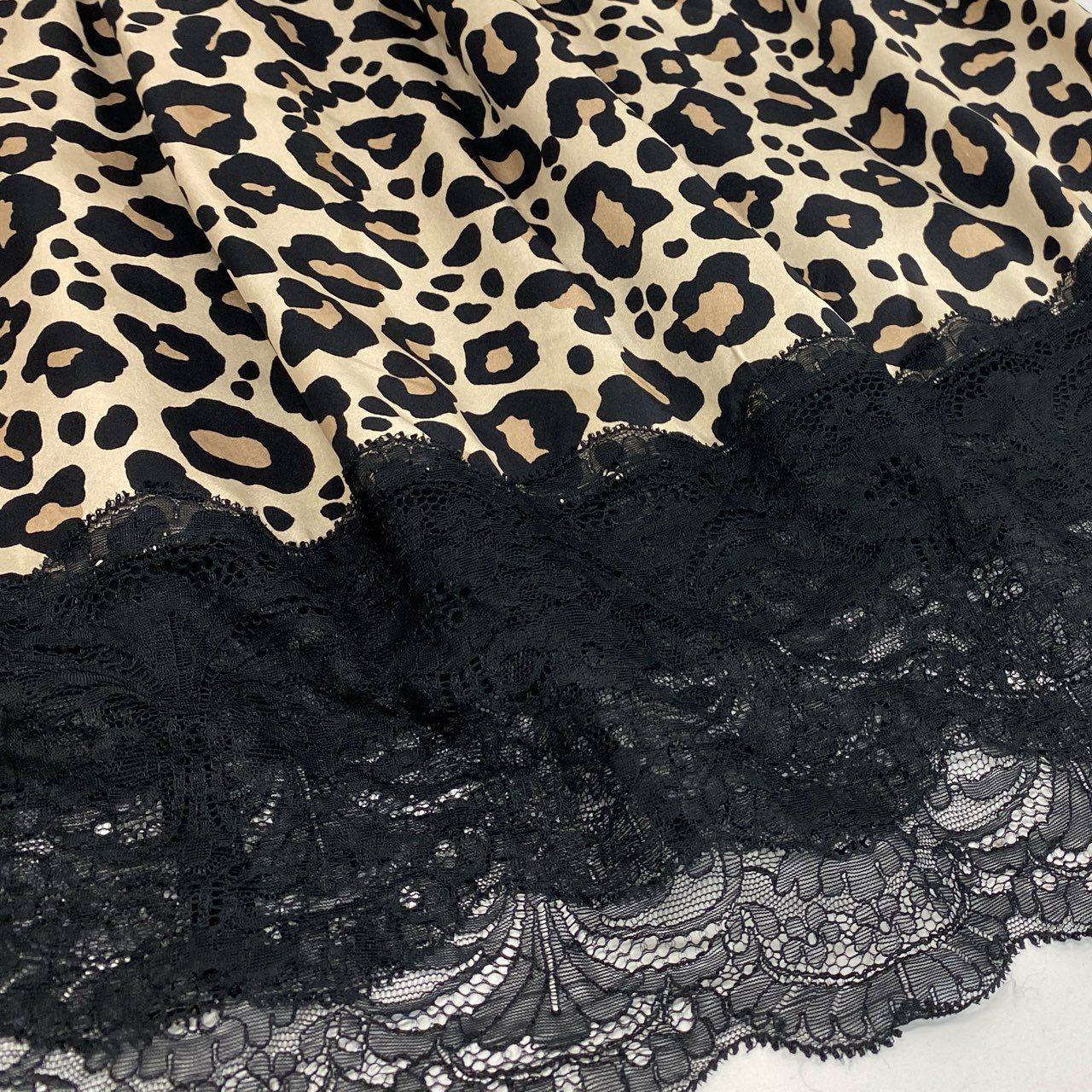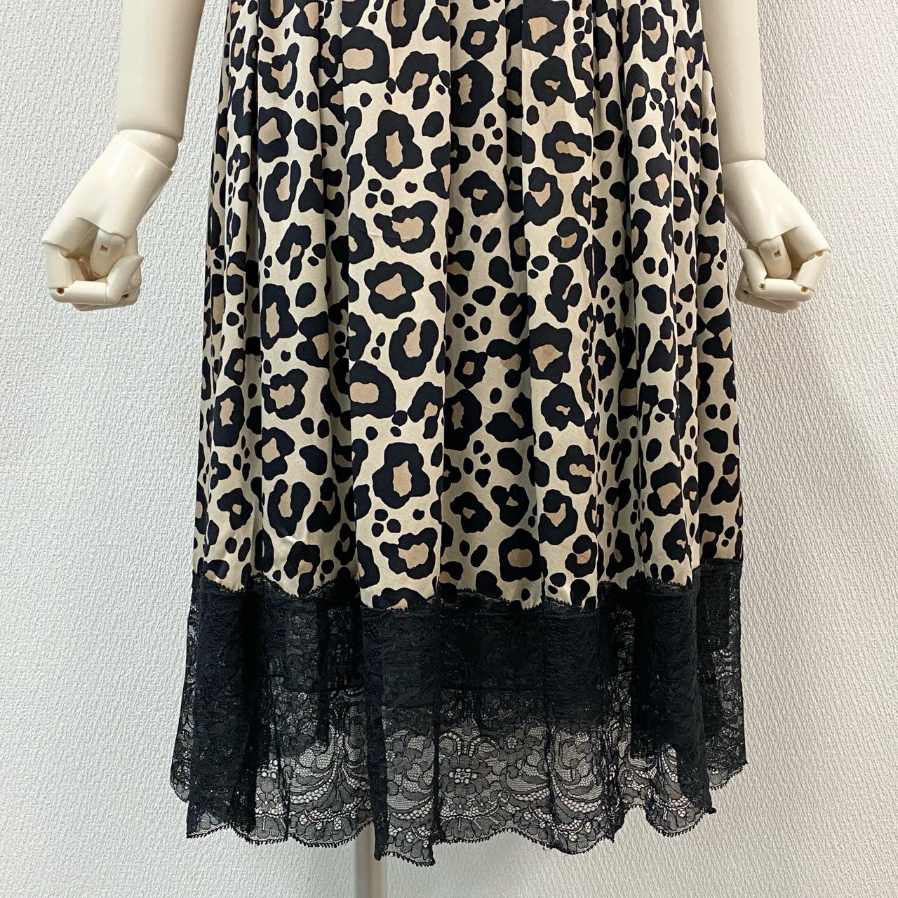 ベースはベージュ×ブラックのレオパード柄に、ブラックレースの切替を組み合わせたブルーガールの半袖ワンピースです。素材は軽やかなファブリックで、裾と袖に施された透け感のあるレースディテールがエレガントな印象をプラス。ウエスト位置に自然な切替があり、メリハリのあるシルエットを演出します。華やかで個性のあるデザインは、ディナーやパーティーなど特別なシーンにぴったりです。