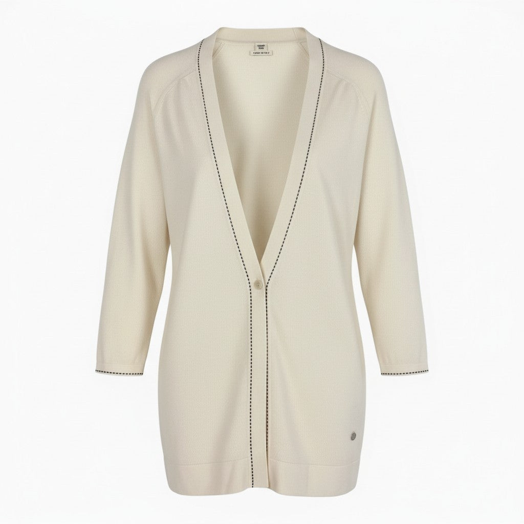 上品なアイボリーカラーが印象的な**エルメス**のロングニットカーディガンです。マットで滑らかなウール100%素材を使用し、軽やかで落ち感のある上質な風合いが魅力です。フロント縁に施された繊細なステッチディテールが、シンプルながら洗練されたアクセントになっています。通勤や日常使いはもちろん、ワンピースの羽織りとしても活躍し、季節の変わり目に重宝する一着です。