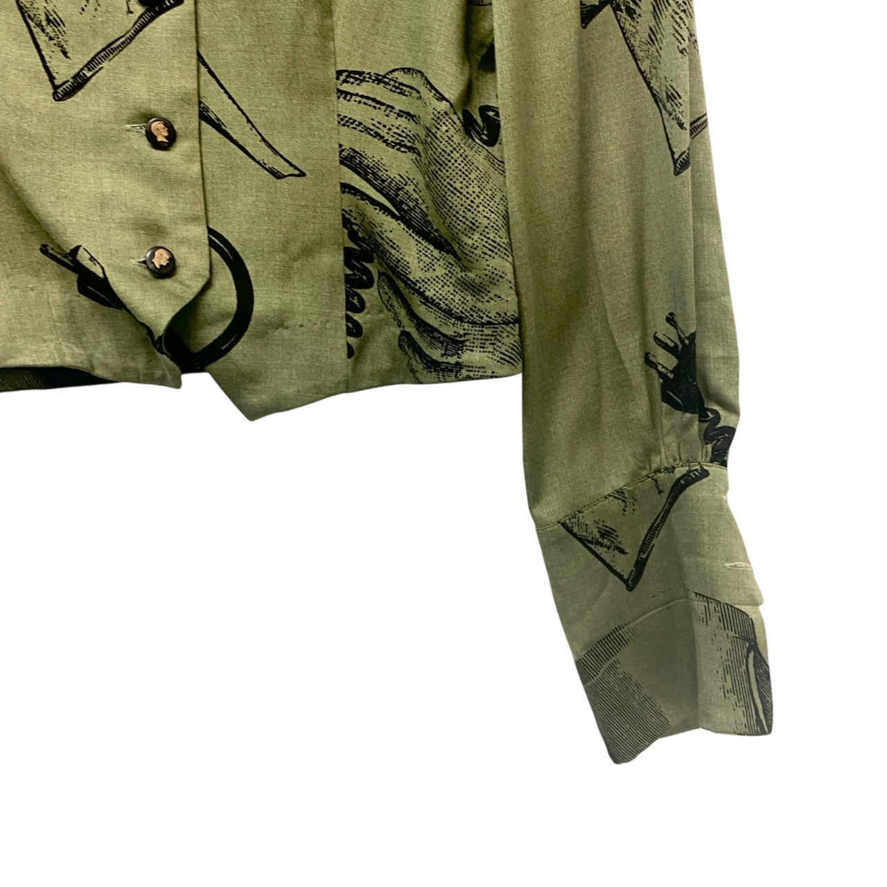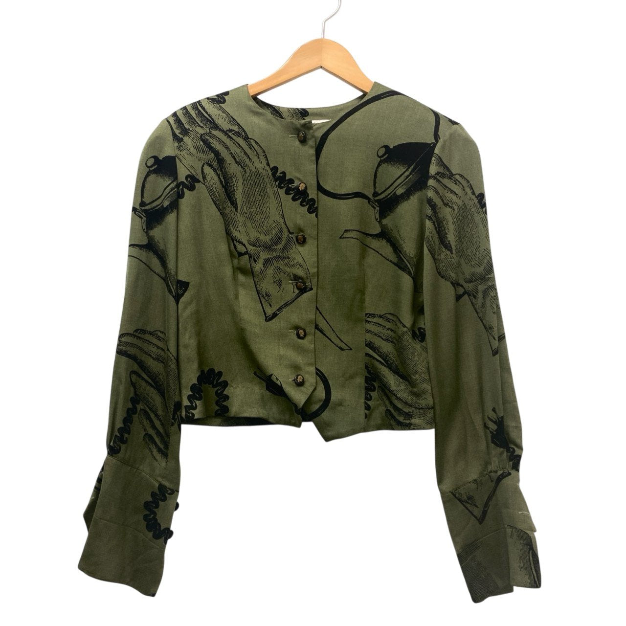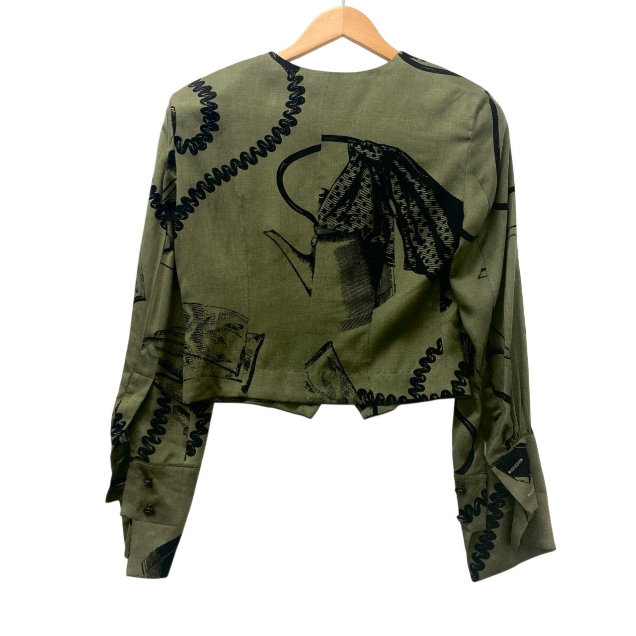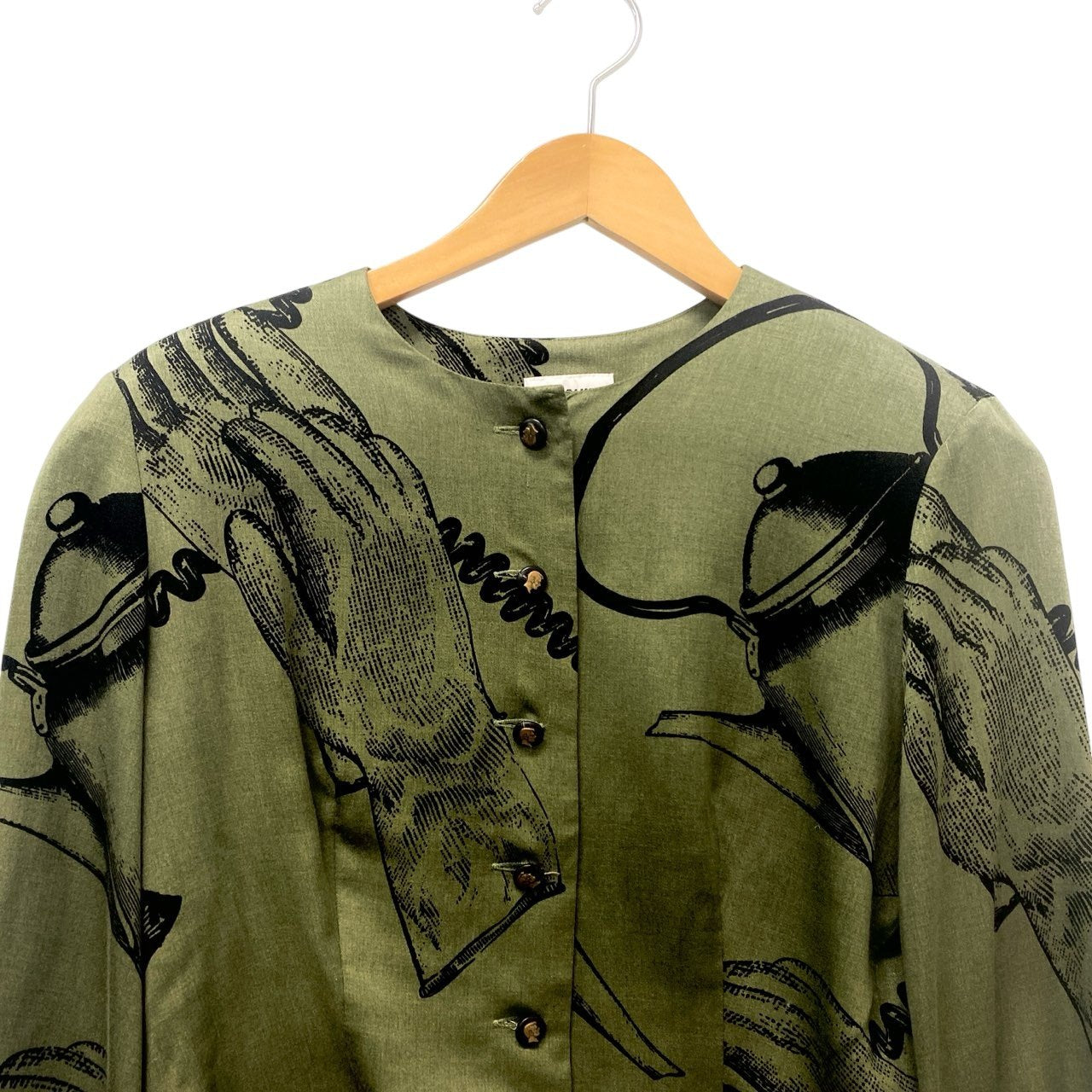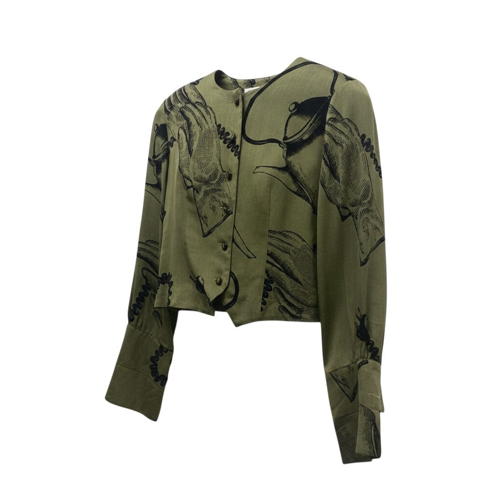 24b16 【美品】MOSCHINO モスキーノ ヴィンテージ ノーカラーシャツジャケット グラフィックプリント ショート丈 バルーン袖 カーキ レディース 女性用u02t