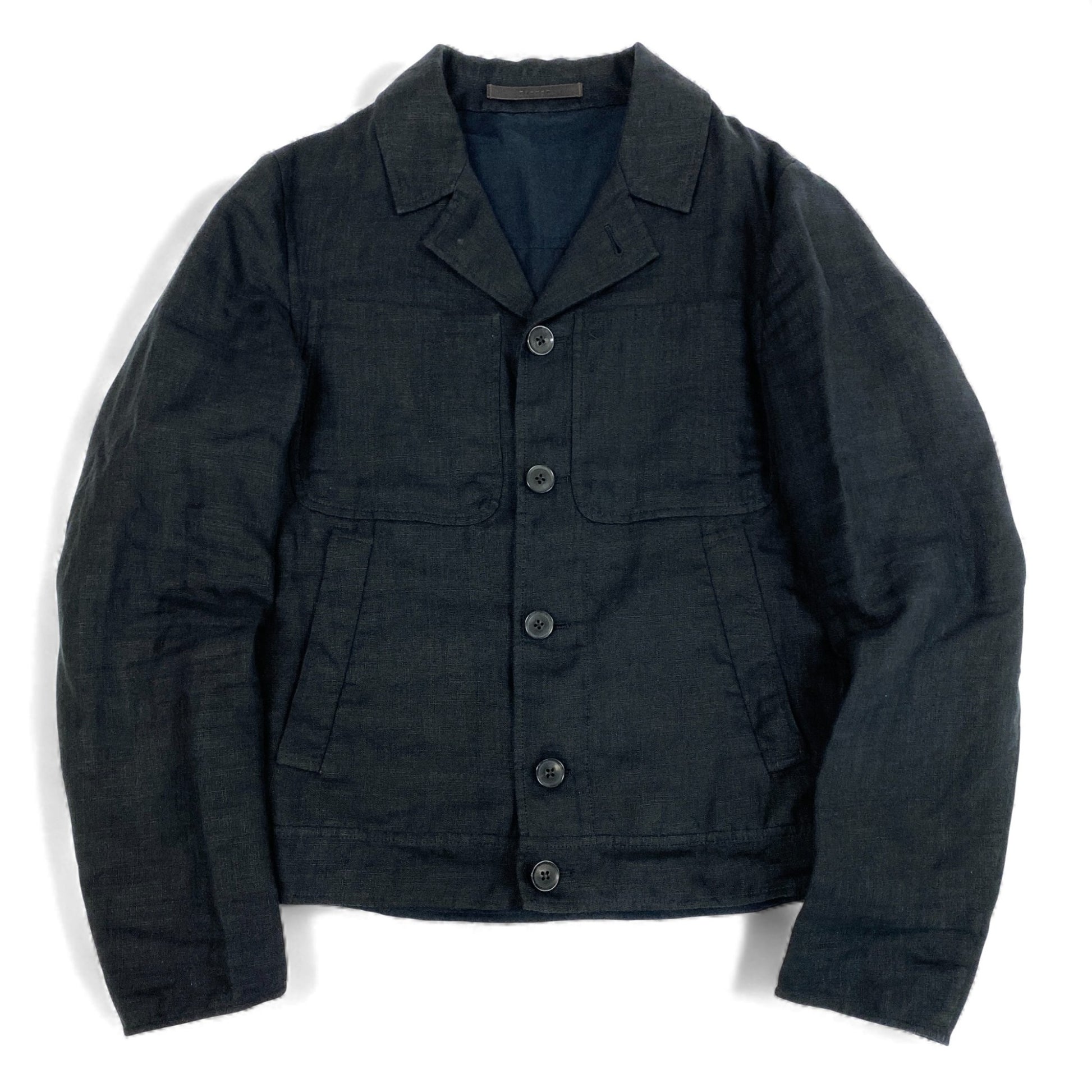 深みのあるブラックに、自然な風合いが魅力のマットなリネン混素材を使用したCARUSOのワークジャケットです。シンプルながら上品な佇まいで、フロントのボタンや大きめのパッチポケットが控えめな存在感を演出します。軽やかで通気性が良く、春〜秋の羽織りとして快適に着用できる一着。スラックスで上品にまとめるのはもちろん、デニムとのカジュアルスタイルにも自然に馴染む万能なアイテムです。