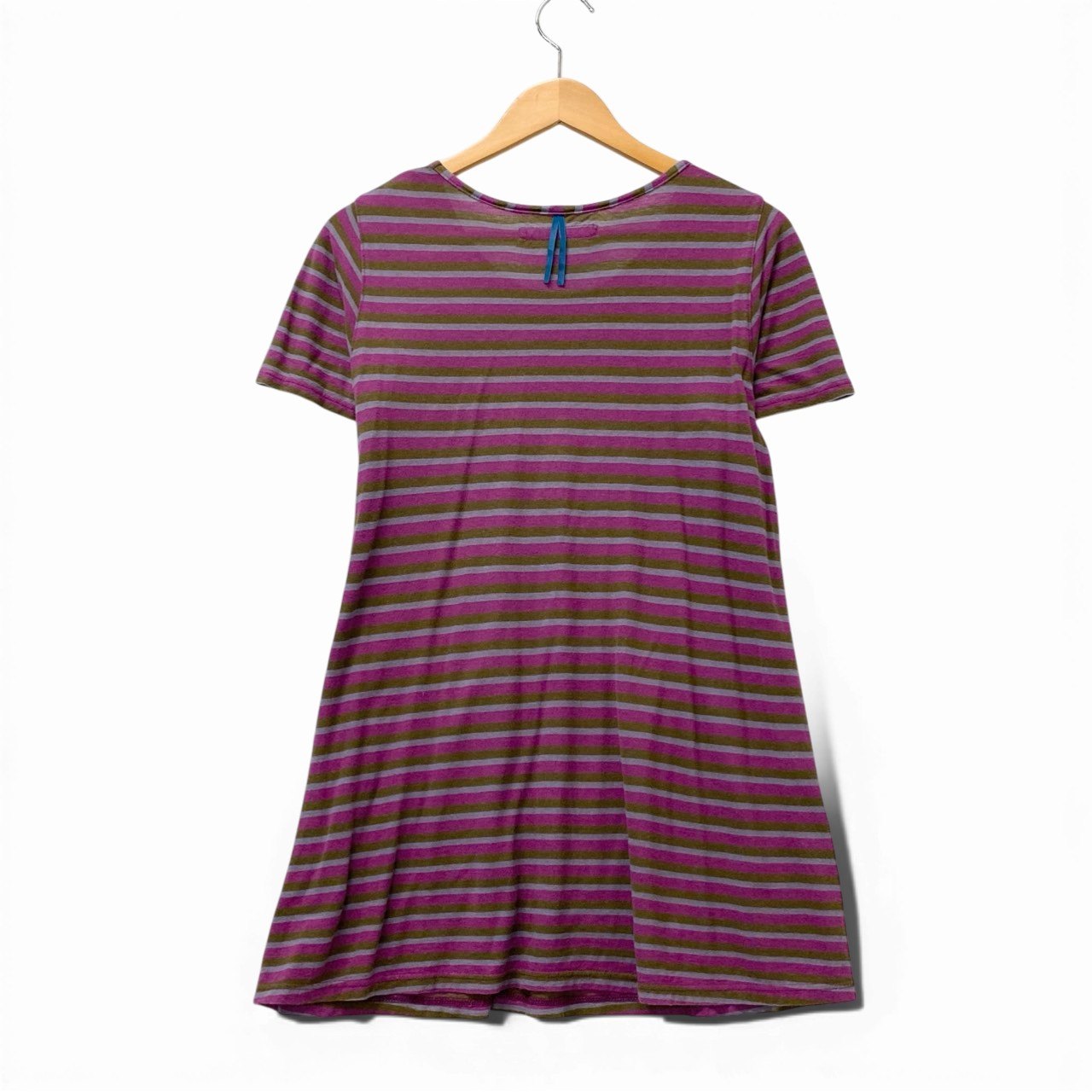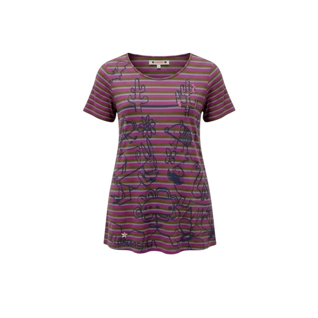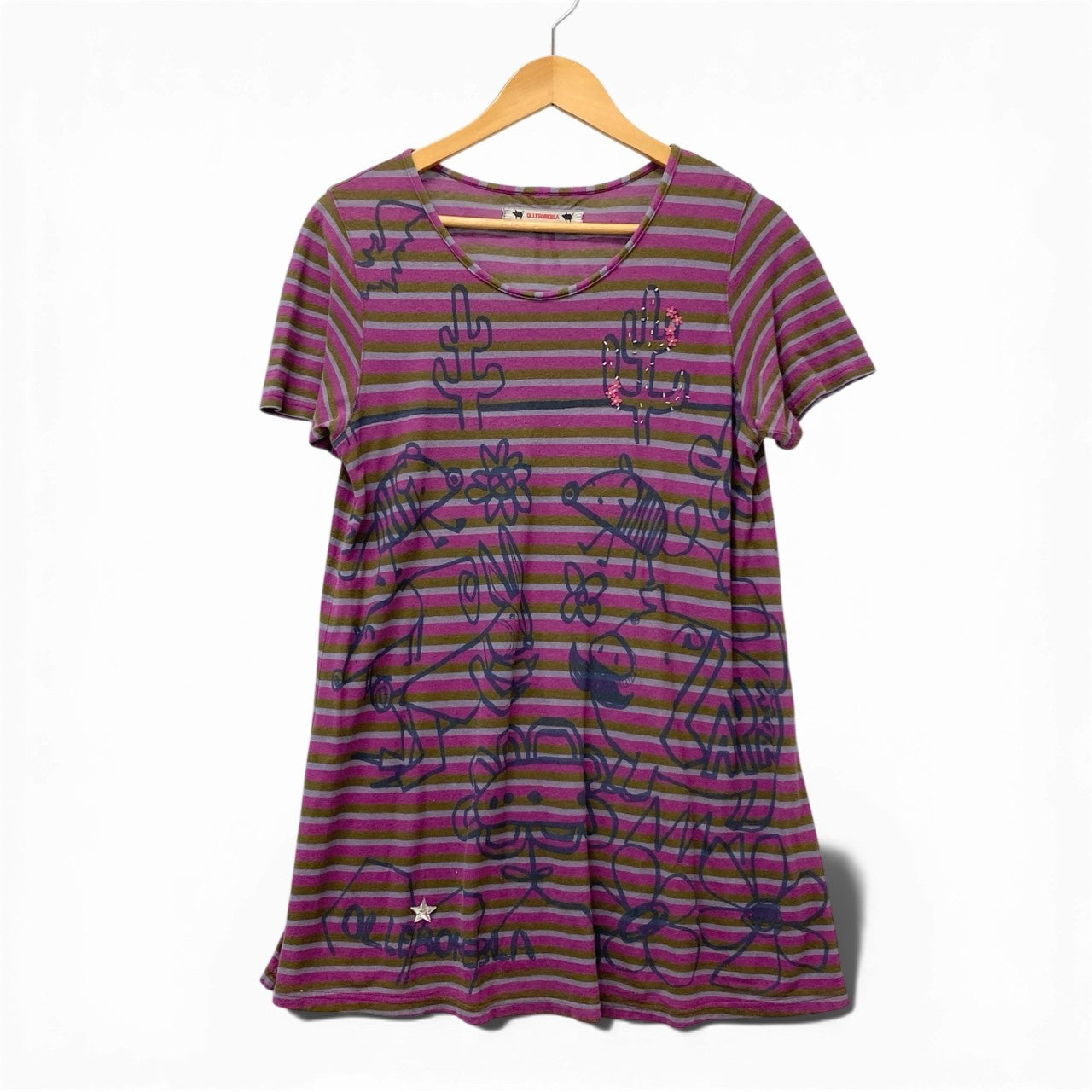 パープル×オリーブグリーンのボーダーに、ネイビーの手描き風プリントが映えるオレボレブラらしい一着。 ブタさんやサボテン、フラワーモチーフなど遊び心あふれる総柄デザインが魅力です。 一部にピンク系ビーズ装飾が施され、立体的なアクセントになっています。 ヒップまで隠れるチュニック丈で、カジュアルなデイリースタイルを華やかに演出します。