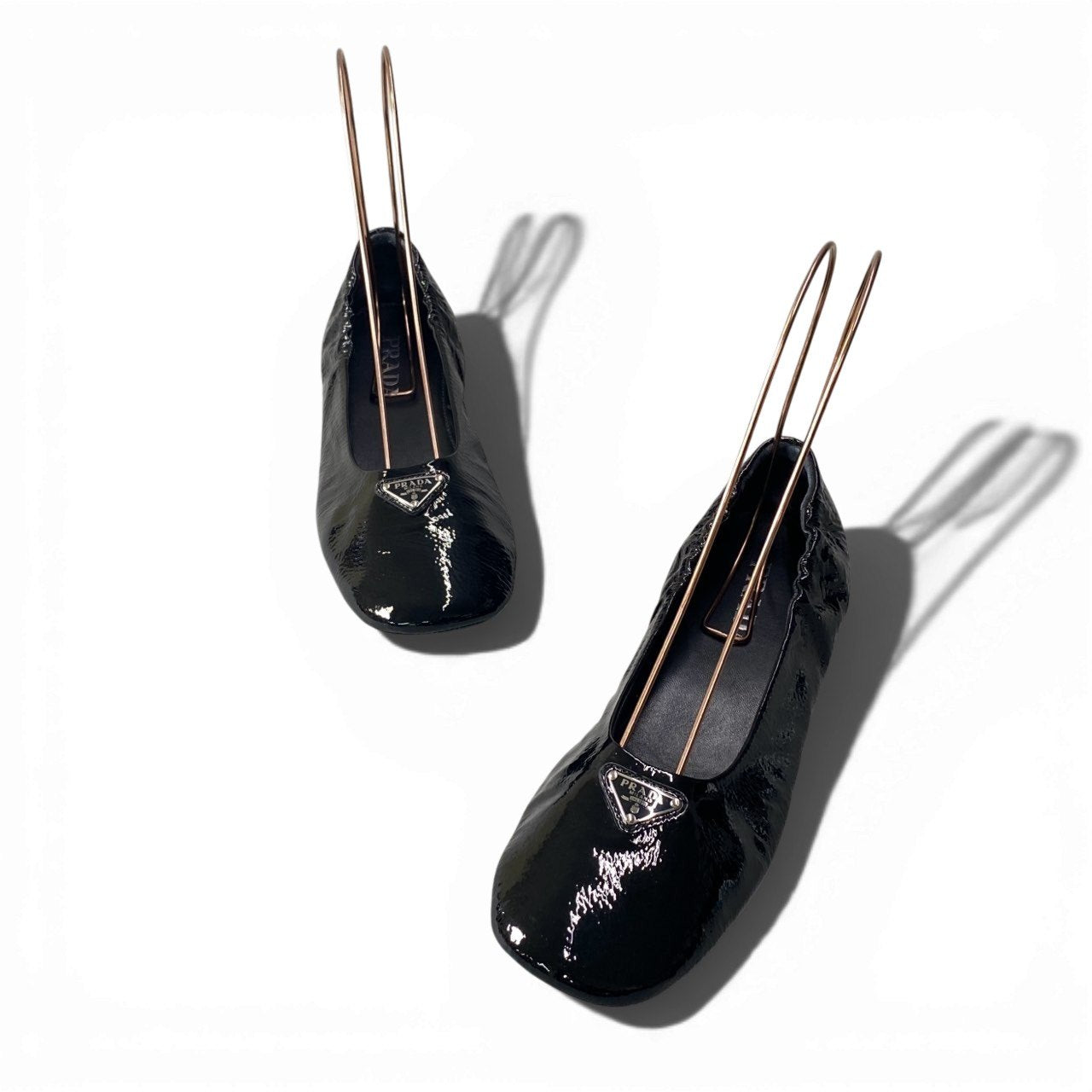PRADAのバレエシューズで、ミニマルながら存在感のあるデザインが魅力の一足です。カラーは艶やかなブラックで、光沢感のあるパテントレザー(ナプラック)がラグジュアリーな印象を演出。フロントにはトライアングルロゴプレートを配置し、ブランドらしいアクセントに。シンプルなシルエットで、カジュアルからきれいめスタイルまで幅広く合わせやすいアイテムです。