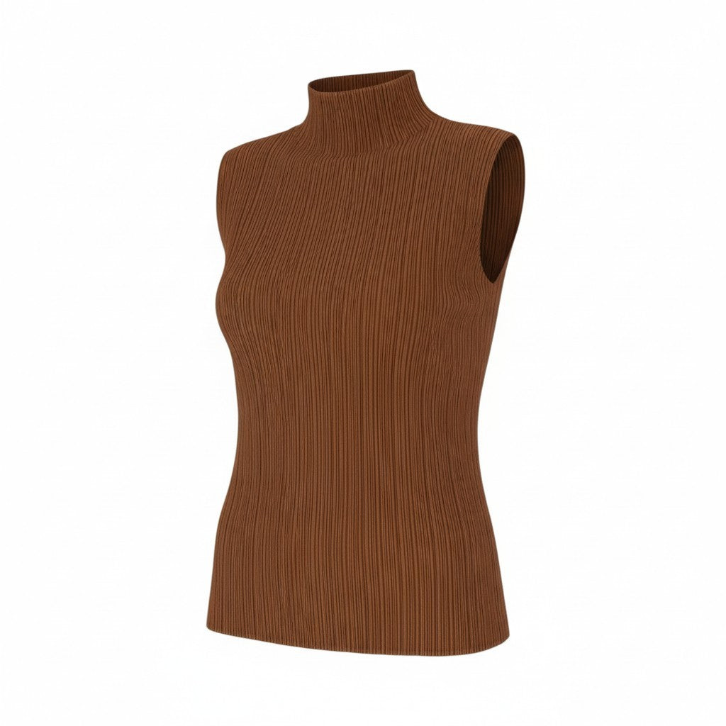 キャメルブラウンのプリーツが美しい、PLEATS PLEASEのノースリーブトップスです。ストレートに走る細かなプリーツが縦ラインを強調し、身体をすっきり見せる上品なデザイン。軽量で伸縮性の高い素材のため、春夏は一枚で、秋冬はジャケットやカーディガンのインナーとしても活躍します。ベーシックながら存在感があり、デイリーからお出かけまで幅広いスタイルに対応する万能アイテムです。