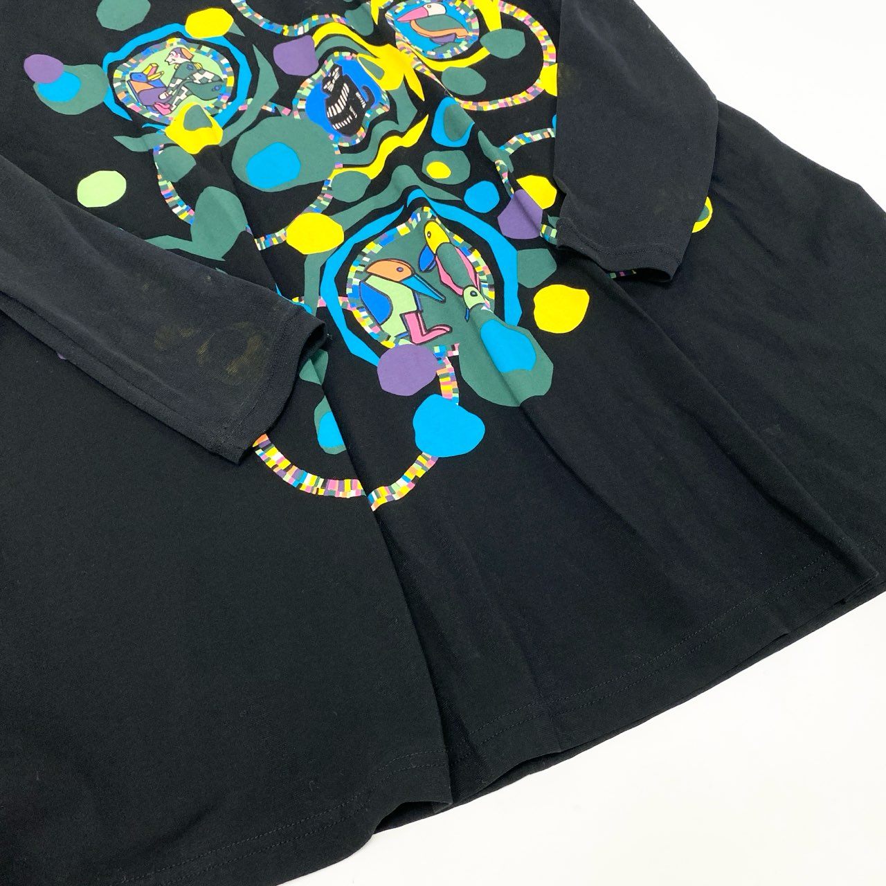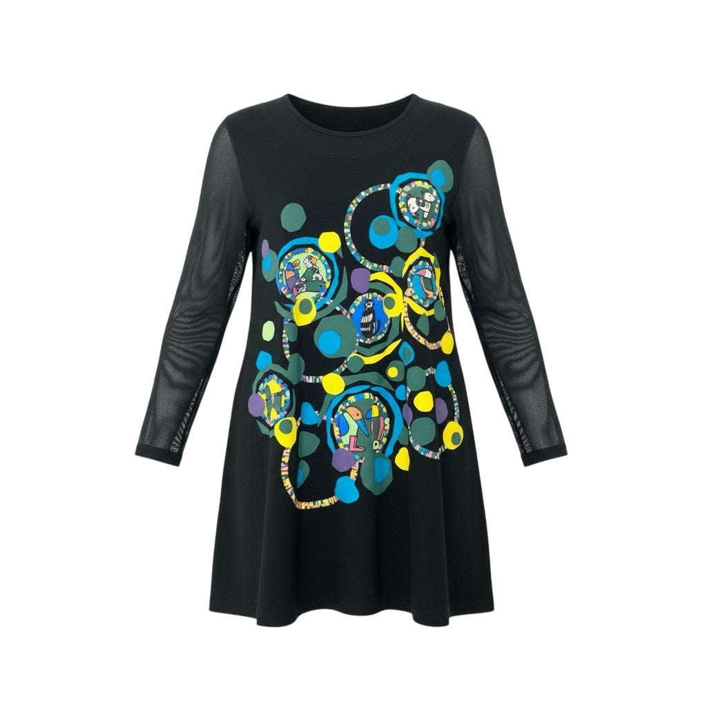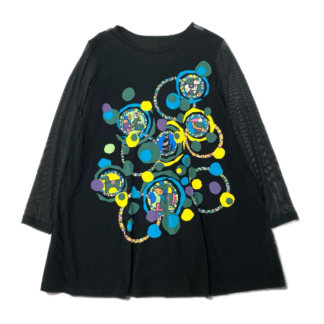 ブラックをベースに、ブルー・イエロー・パープルのサークル柄とアニマルモチーフが散りばめられた、TOKUKO 1er VOLらしいアート性の高いチュニックワンピースです。袖はシアースリーブで軽さがあり、長袖でも涼しく着られるデザイン。Aラインに広がるシルエットが自然に体型をカバーし、1枚で存在感のあるコーデが完成します。レギンスや細身パンツとも相性が良く、デイリーからお出かけまで幅広いシーンで活躍する一着です。