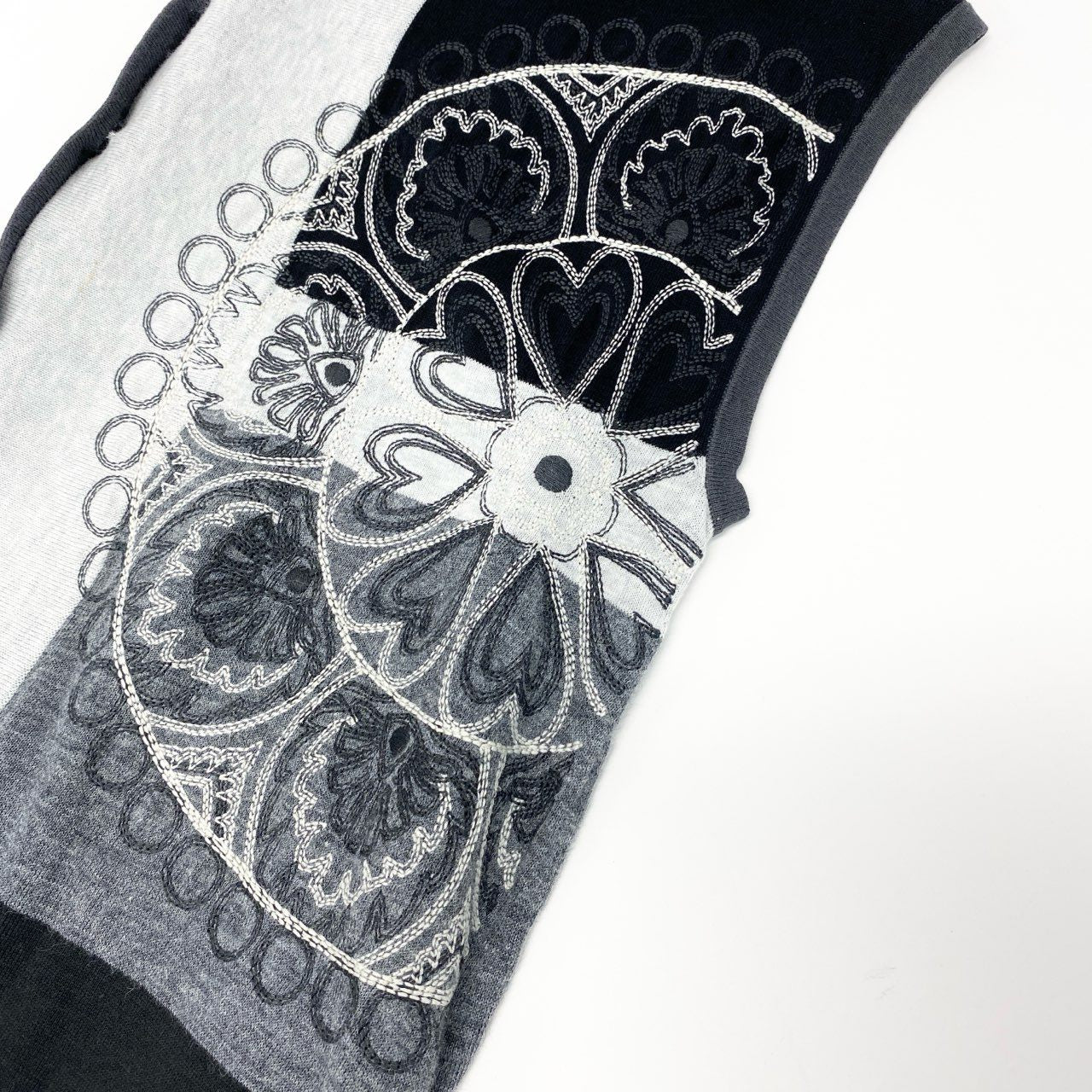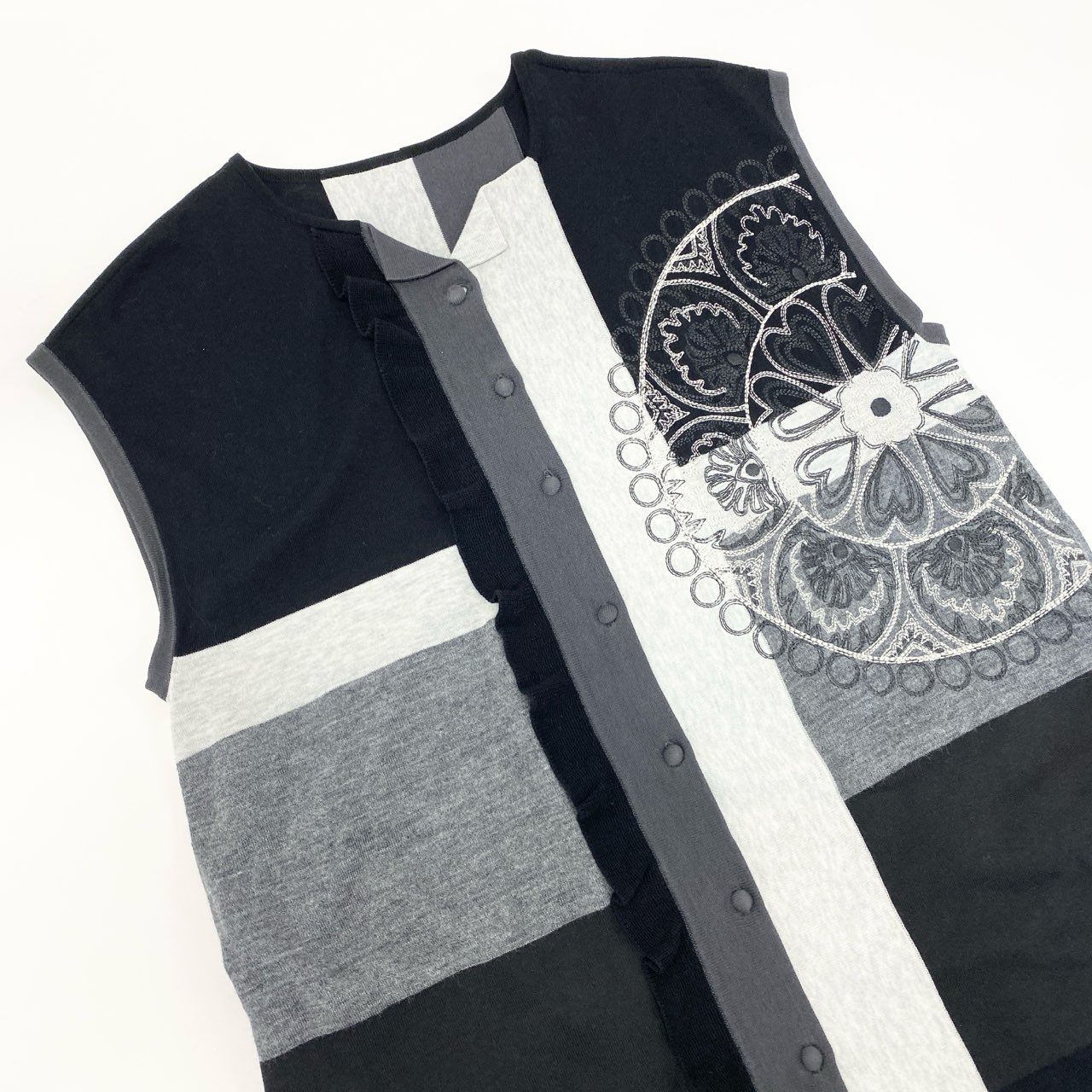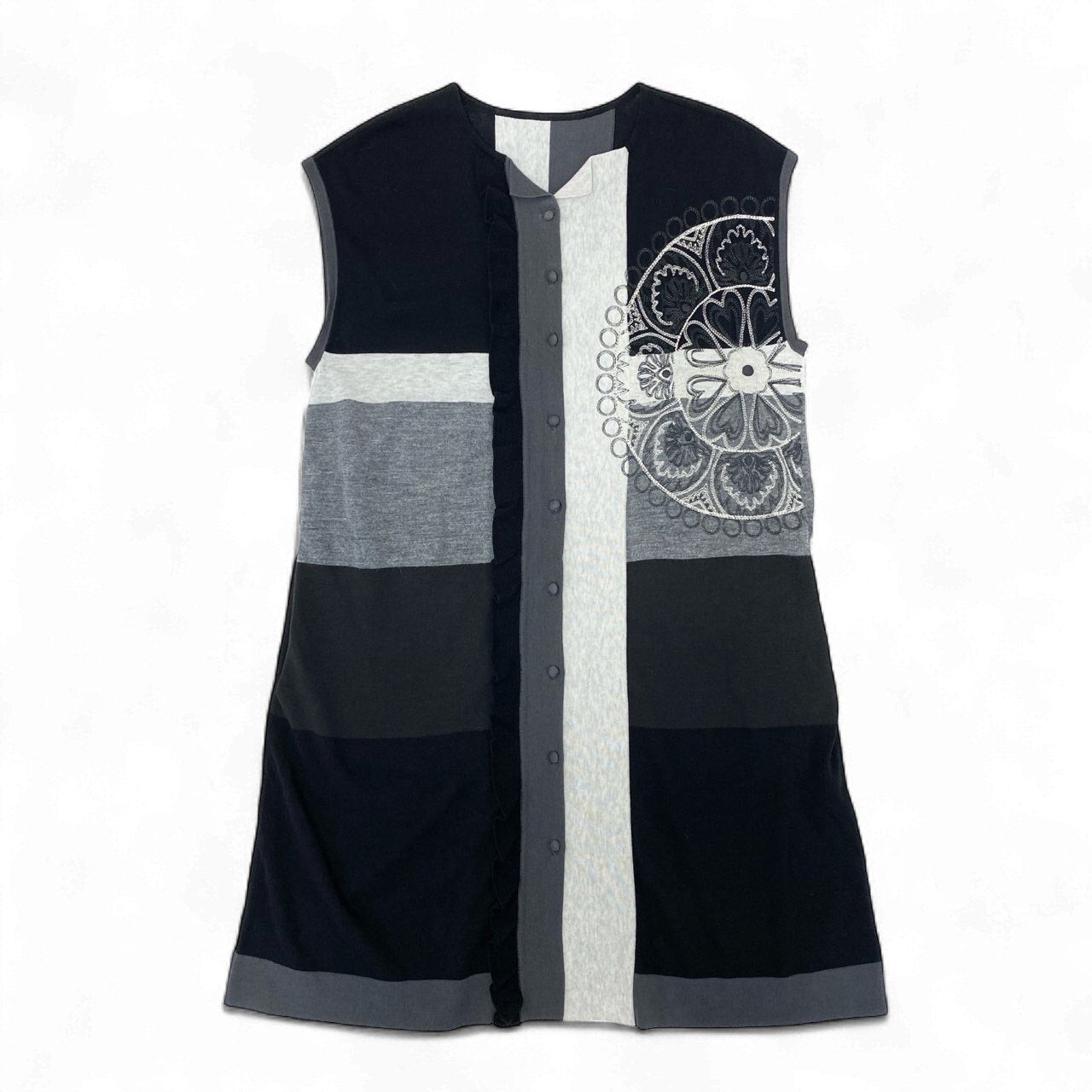 トクコプルミエヴォルらしい芸術的な切替デザインが魅力の、ノースリーブ・コットンリネンニットカーディガンです。ブラック・チャコール・ライトグレーを組み合わせたモノトーンブロックカラーに、大きな刺繍モチーフが存在感をプラス。フロントには柔らかな雰囲気のくるみボタンを使用しており、細部までブランドらしい上品さが宿っています。軽やかな素材感で通年使いやすく、ワンピースの上の羽織りや、長袖トップスとのレイヤードにも最適です。体型を選ばず着こなし幅広く楽しめる一着です。