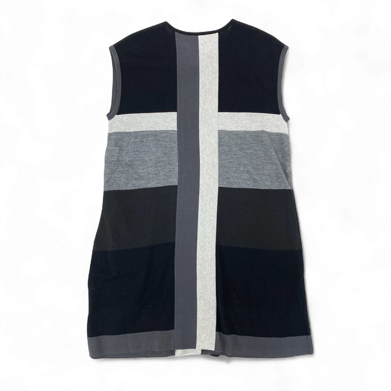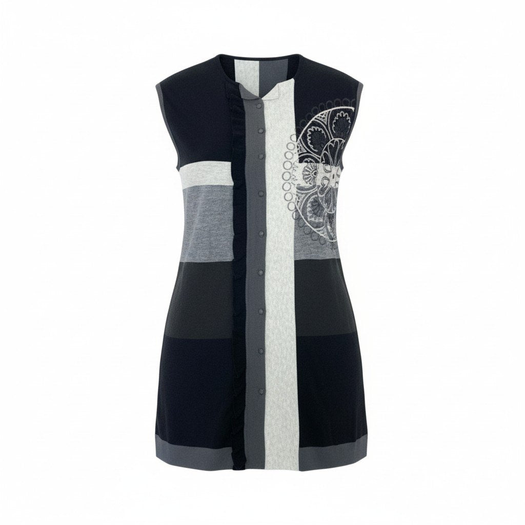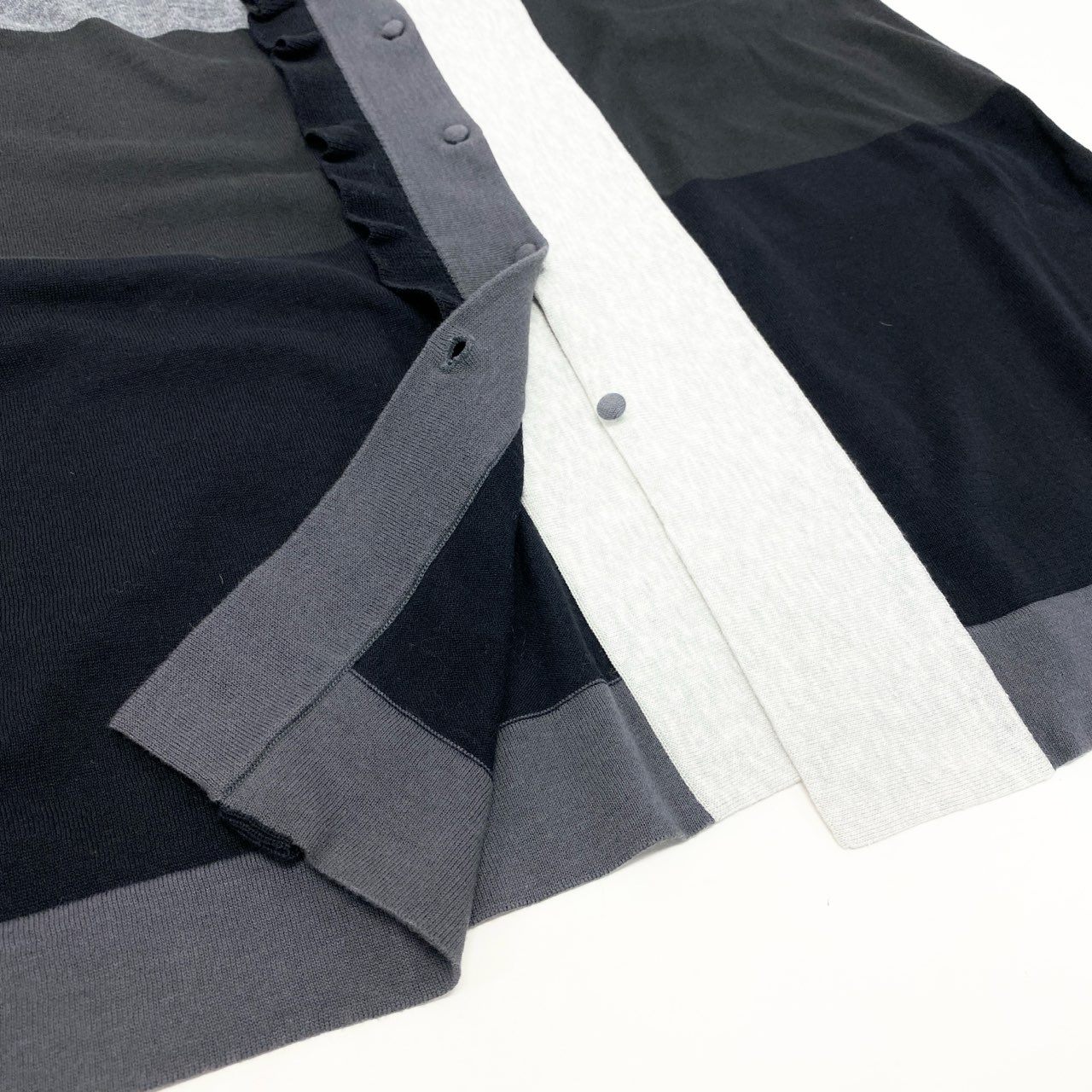 トクコプルミエヴォルらしい芸術的な切替デザインが魅力の、ノースリーブ・コットンリネンニットカーディガンです。ブラック・チャコール・ライトグレーを組み合わせたモノトーンブロックカラーに、大きな刺繍モチーフが存在感をプラス。フロントには柔らかな雰囲気のくるみボタンを使用しており、細部までブランドらしい上品さが宿っています。軽やかな素材感で通年使いやすく、ワンピースの上の羽織りや、長袖トップスとのレイヤードにも最適です。体型を選ばず着こなし幅広く楽しめる一着です。