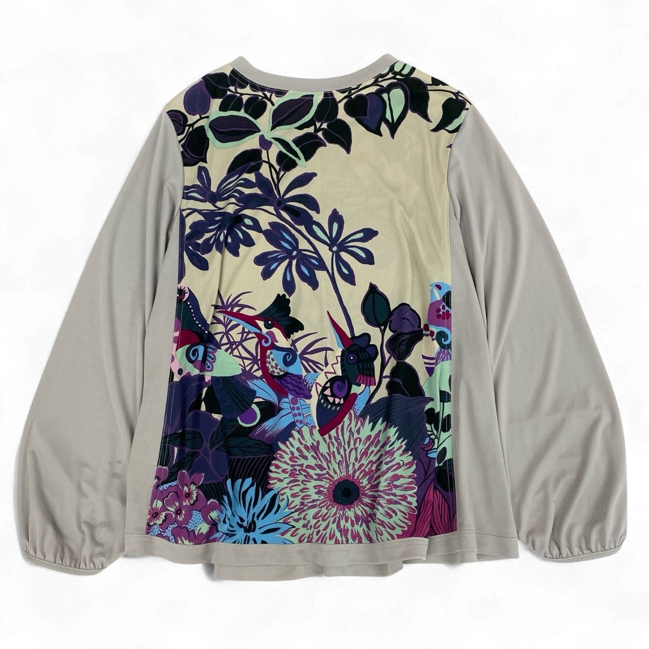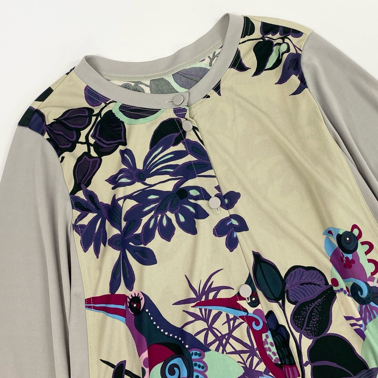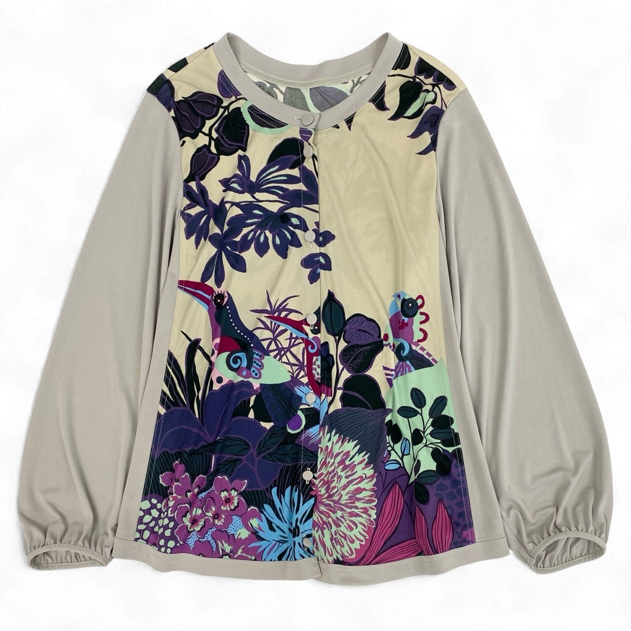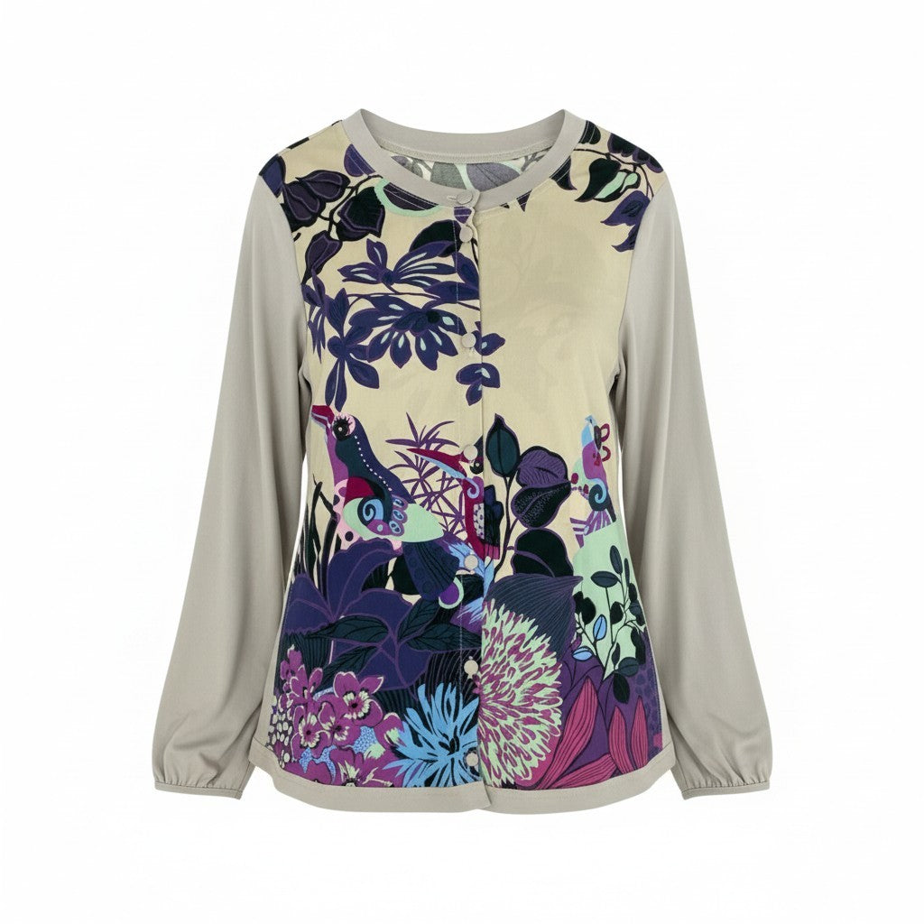 TOKUKO 1er VOLらしい、アート性の高い花柄プリントが目を惹くロングスリーブカーディガンです。グレージュの袖と身頃の落ち着いた色味に、パープル・ブルー・グリーンを効かせた華やかなプリントが映える一枚。 フロントにはくるみボタンを採用し、優しい雰囲気とデザイン性を両立しています。 軽やかな着心地で、春・秋はアウターとして、冬はインナーとしても活躍。 コーディネートの主役になる存在感のあるアイテムで、シンプルボトムと合わせるだけで華やかなスタイルが完成します。