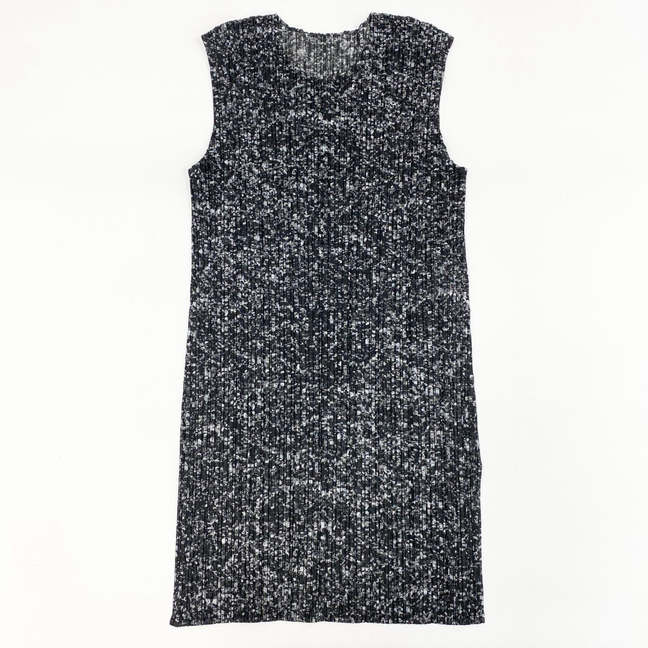 PLEATS PLEASE(プリーツプリーズ)のブラックベース×ホワイトミックスの総柄ノースリーブワンピース。プリーツ特有の伸縮性と軽やかさで、体にしなやかにフィットしつつ動きやすさも抜群です。色調はブラックに近いチャコールグレー地に、細かなホワイトドット調の抽象柄がプリントされた、視覚的にも印象的なデザイン。シワになりにくく、旅行やデイリー使いにも最適です。1枚で着てもインナーと重ねても美しく決まるアイテムです。