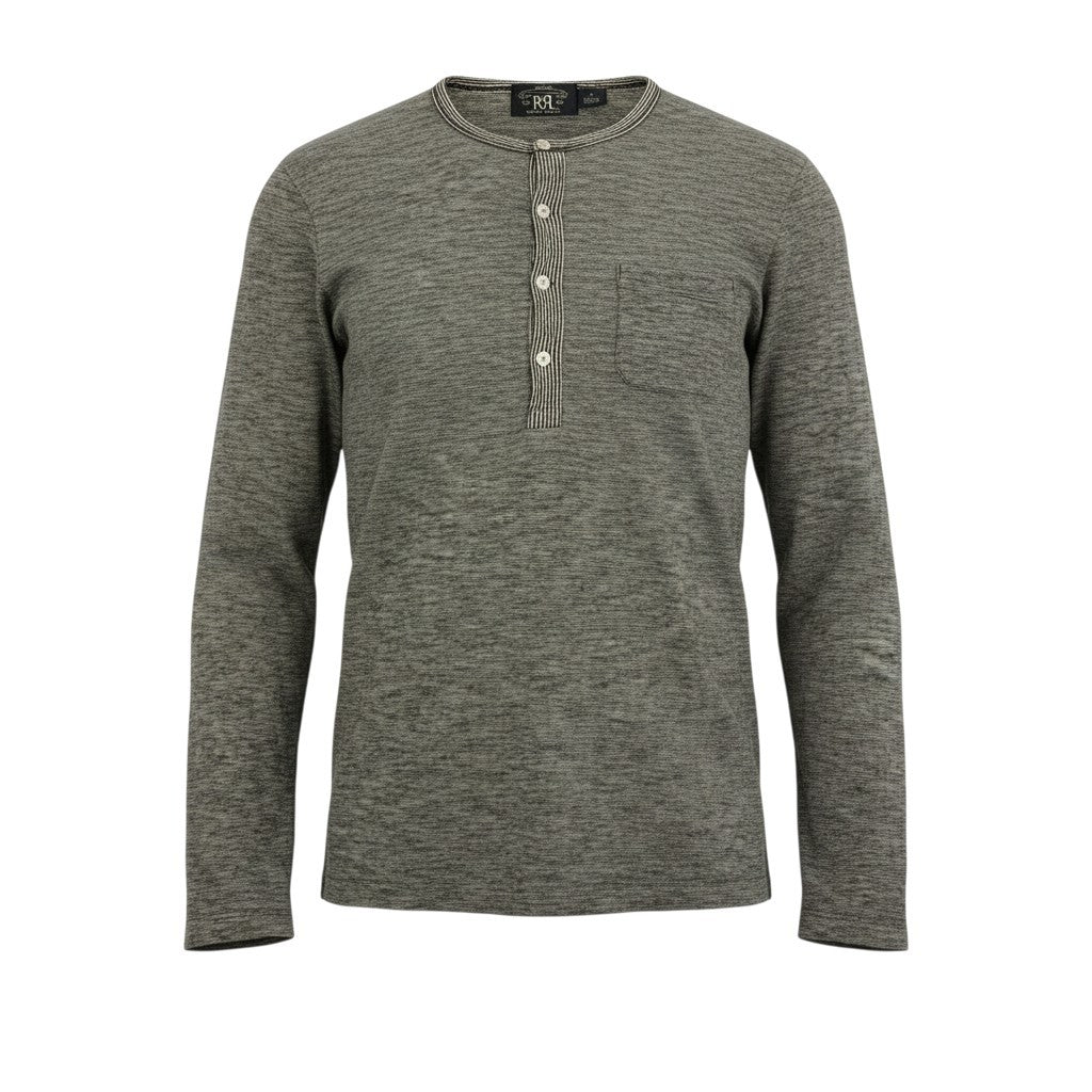 杢調のカーキグリーン(オリーブグレー系)が落ち着いた印象のRRLヘンリーネックカットソーです。マットなコットン素材で、ナチュラルなムラ感のある無地デザインがヴィンテージライクな雰囲気を演出します。フロントのボタン付きヘンリーネックと前立て部分のストライプ切替、胸ポケットがさりげないアクセントになっています。デニムやチノパンと好相性で、1枚でもレイヤードでも活躍する大人のカジュアルアイテムです。
