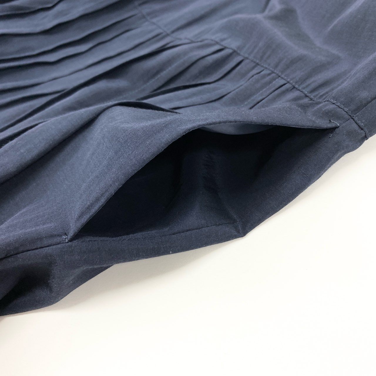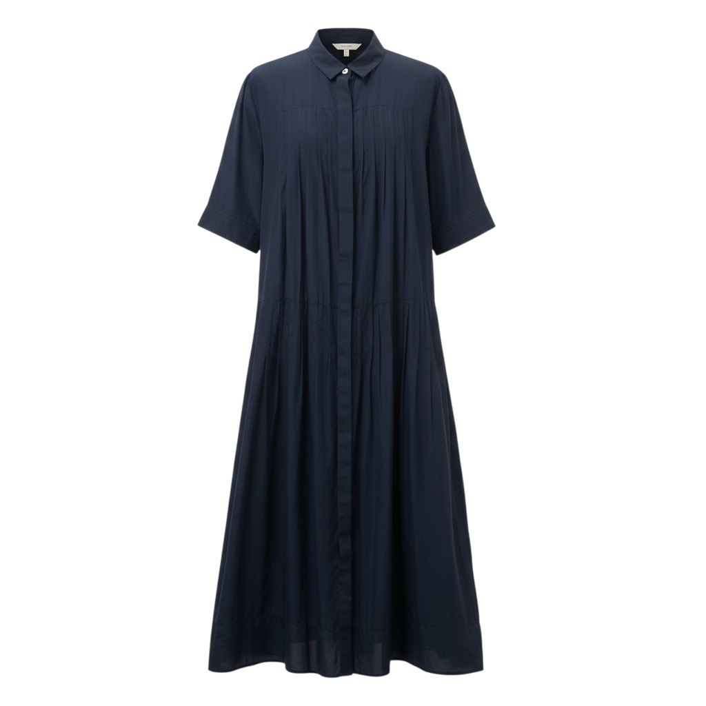 カラーは深みのあるミッドナイトネイビーで、落ち着いた印象ながら上品な存在感を持つ一着です。フロントにはタックが丁寧に入っており、自然なドレープが生まれて体を美しく見せてくれます。軽やかな生地感で、1枚でさらりと着られる涼やかなシャツワンピース。サンダルやフラットシューズと合わせればデイリーに、ヒールとアクセサリーを添えればきれいめのお出かけコーデにも対応します。上質感が伝わる、大人のためのエレガントワンピースです。