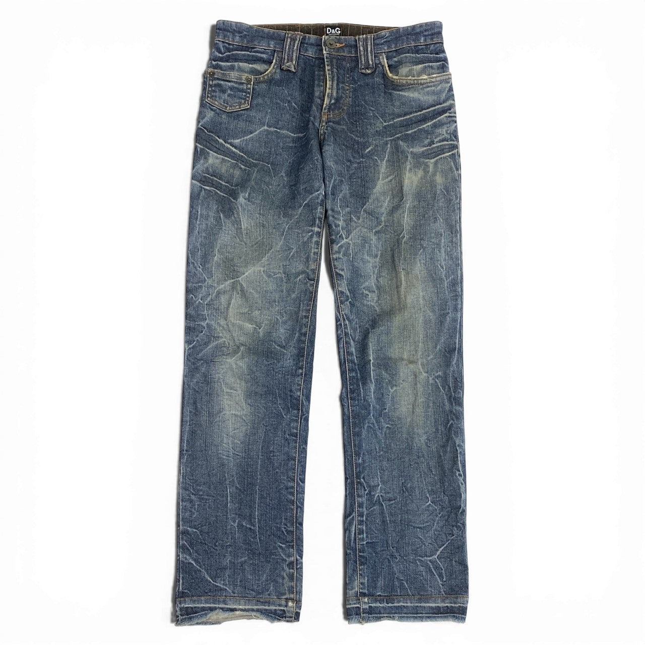 ドルチェ&ガッバーナのデニムパンツで、ミディアムインディゴブルーをベースにした00’sヴィンテージらしいUSED加工が特徴です。全体に入ったシワ感・アタリ加工が立体感を生み、こなれた雰囲気を演出します。マットなコットンデニムにストレッチ性を備え、履き心地も良好。Tシャツやレザージャケットと合わせたカジュアルスタイルから、きれいめ外しまで幅広く活躍する一本です。