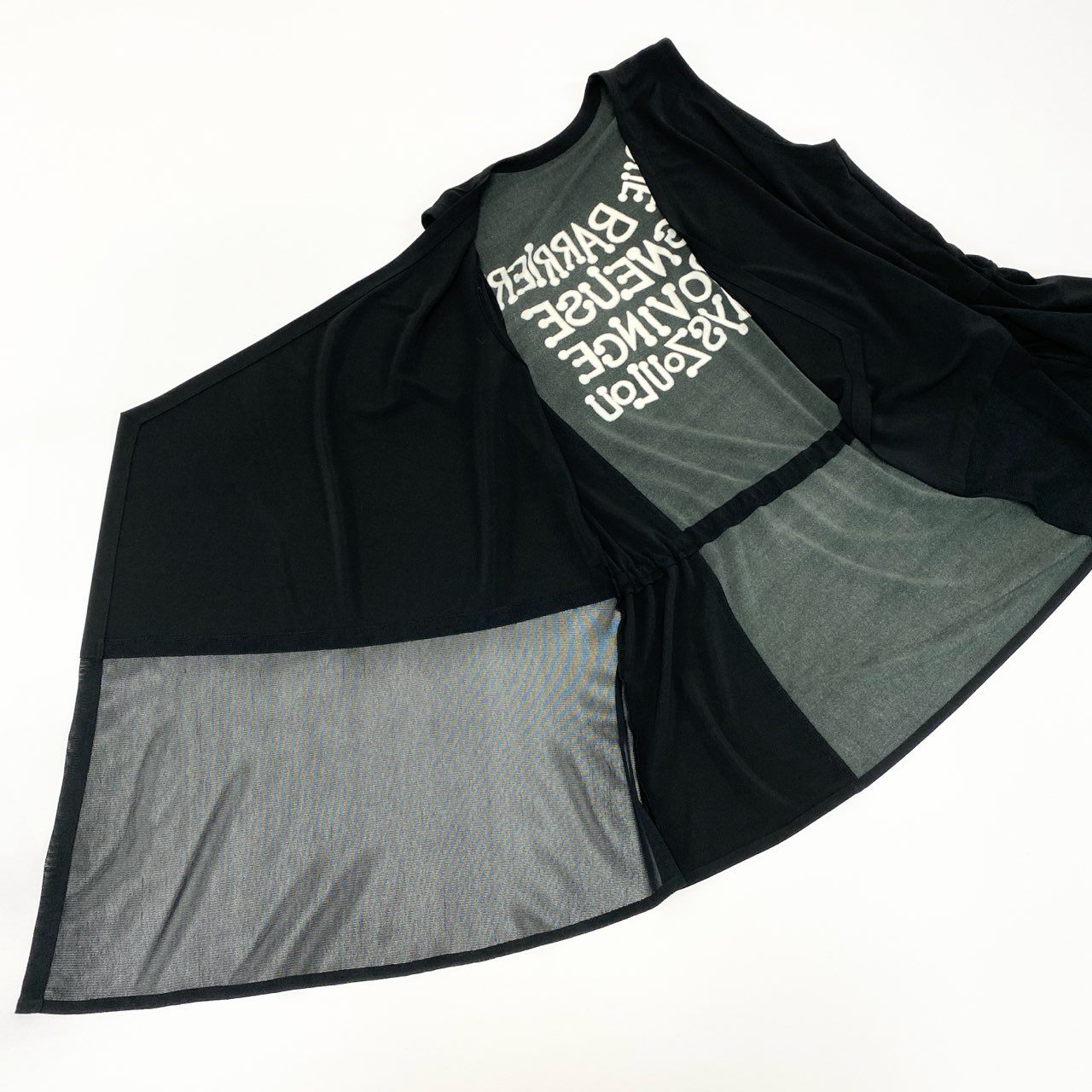 深みのあるブラックカラーに、背面のホワイト文字プリントがアクセントとなったトクコプルミエヴォルのアシンメトリージレベストです。軽やかなシアー素材の切り替えと、左右非対称の裾デザインが動きに合わせて揺れ、スタイリングに個性をプラスします。ウエストのリボンでシルエット調整もでき、ワンピースやカットソーの上から羽織るだけで華やかに。季節の変わり目にも使いやすい一枚で、コーデの主役にぴったりです。