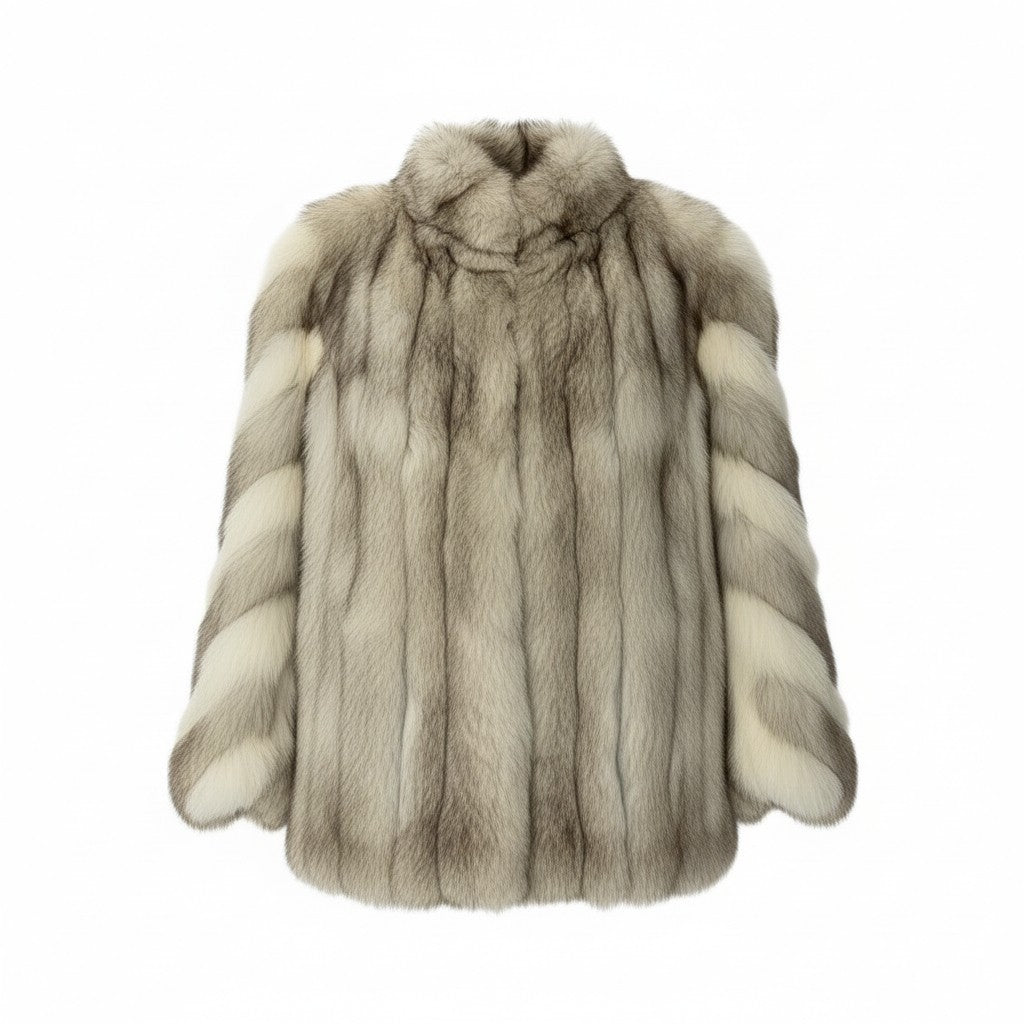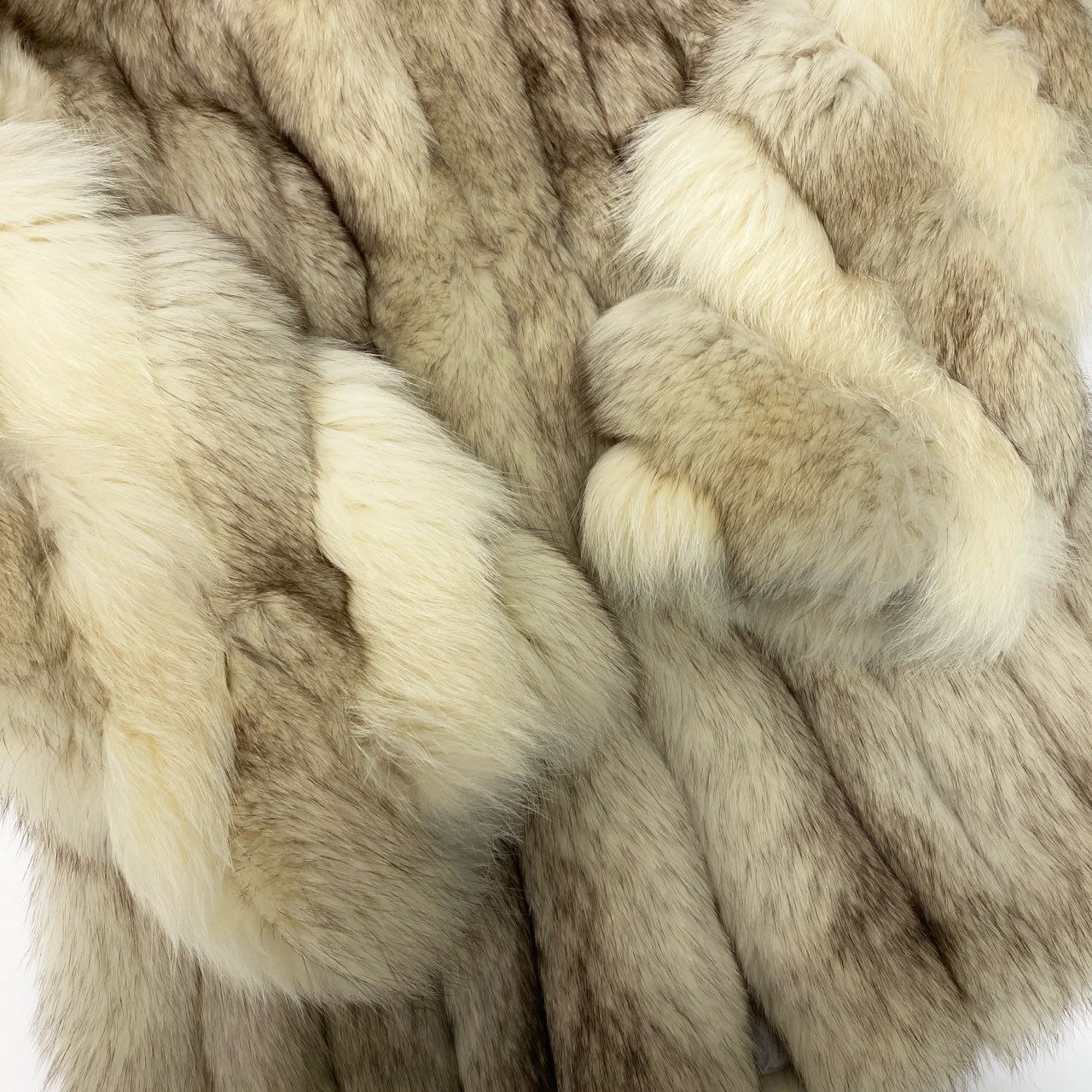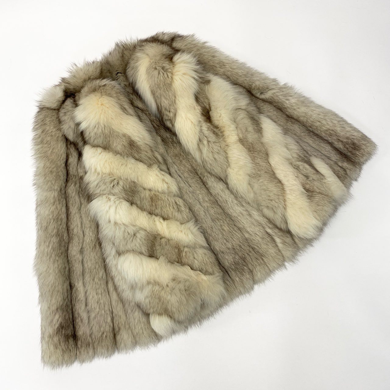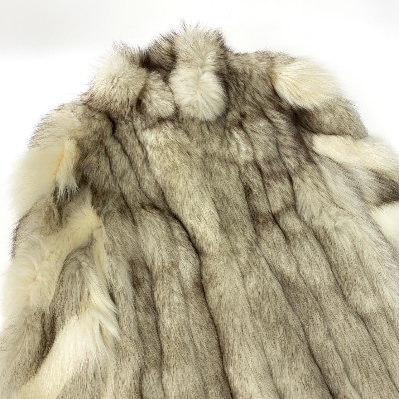 シルバーグレー〜アイボリーが混ざるナチュラルグラデーションが美しい、銀サガ表記のブルーフォックス毛皮コートです。毛足が非常に長く、密度の高い極厚ファーを贅沢に使用しており、立体感と高級感があります。縦方向を意識した斜め段パターンにより、ボリュームがありながらも広がりすぎない印象です。マットで柔らかな質感の天然ファーが、顔まわりを上品に演出します。冬のお出かけや特別なシーン、ラグジュアリーな装いに映える一着です。