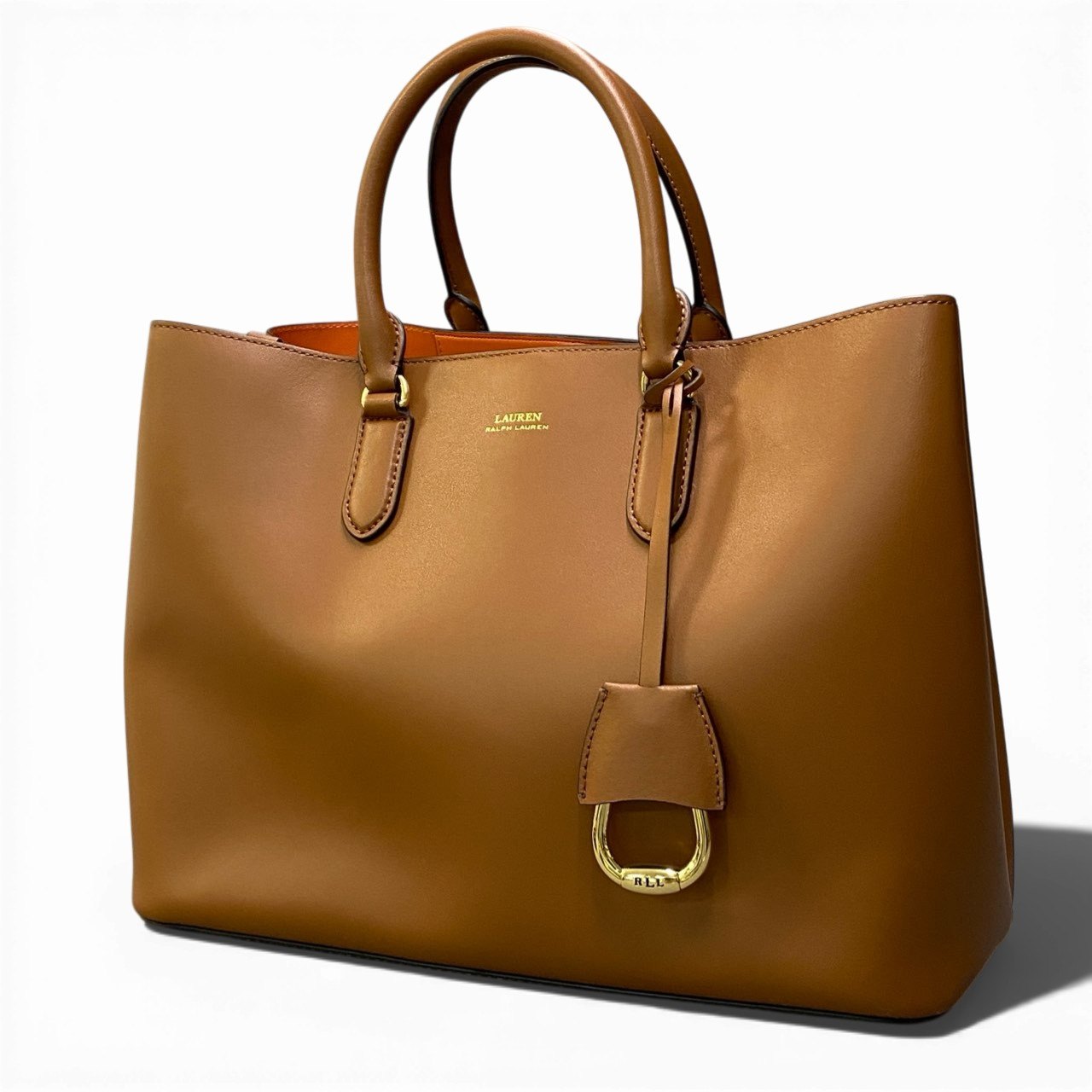 上品なキャメルブラウンのスムースレザーが印象的なラルフローレンのトートバッグです。 マットな質感のレザーに、ゴールド金具とフロントの「LAUREN RALPH LAUREN」ロゴが高級感を演出。 取り外し可能なショルダーストラップ付きで、手持ちと肩掛けの2WAY仕様です。 シンプルながら洗練されたデザインで、ビジネスからきれいめカジュアルまで幅広く活躍するアイテムです。