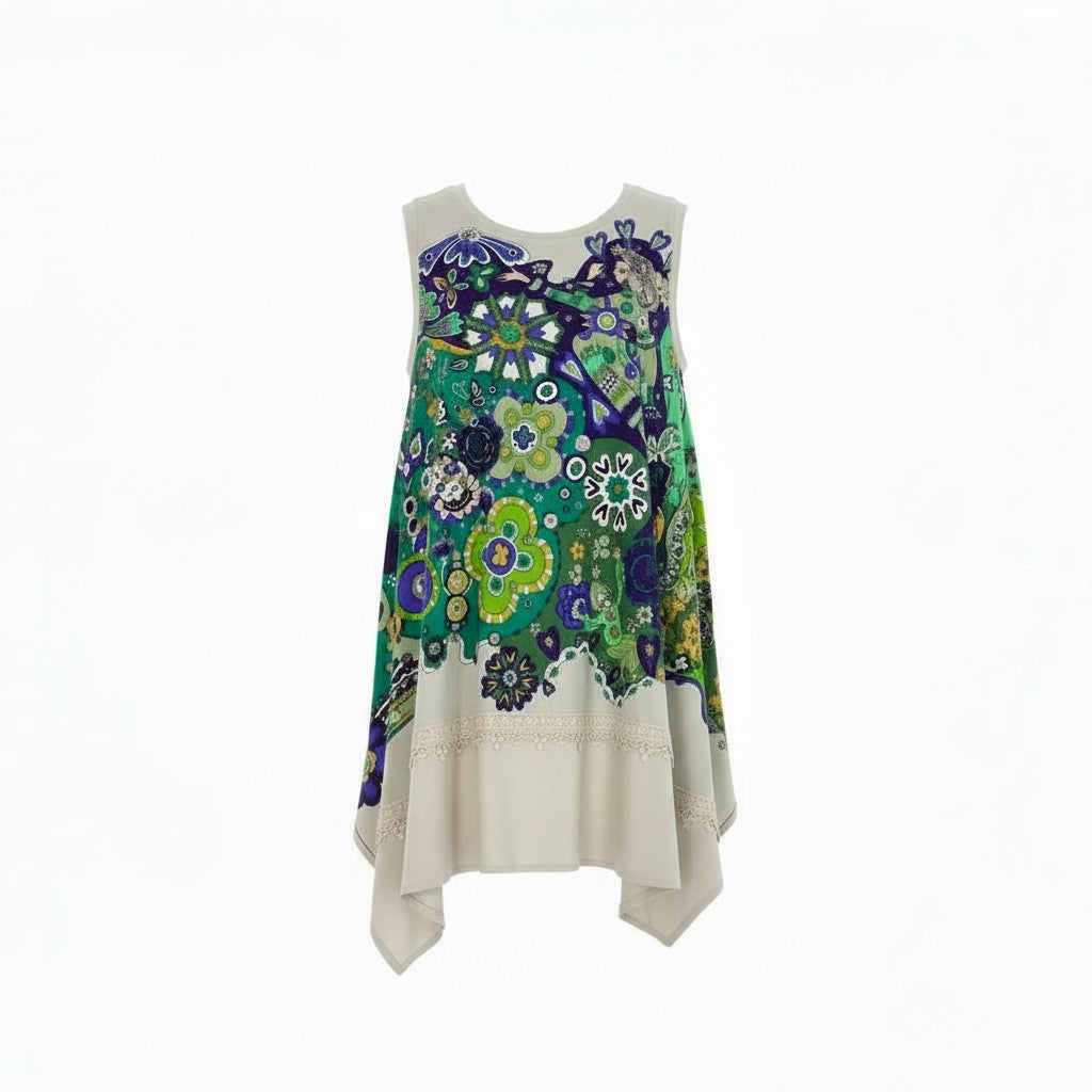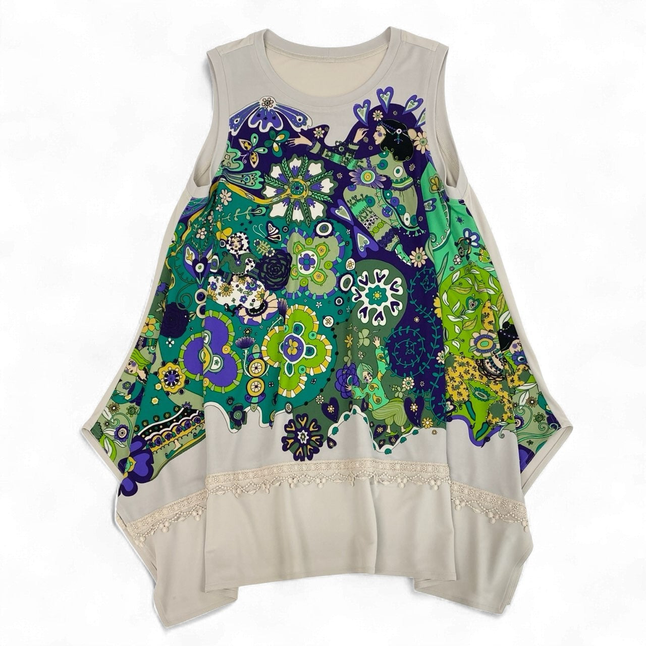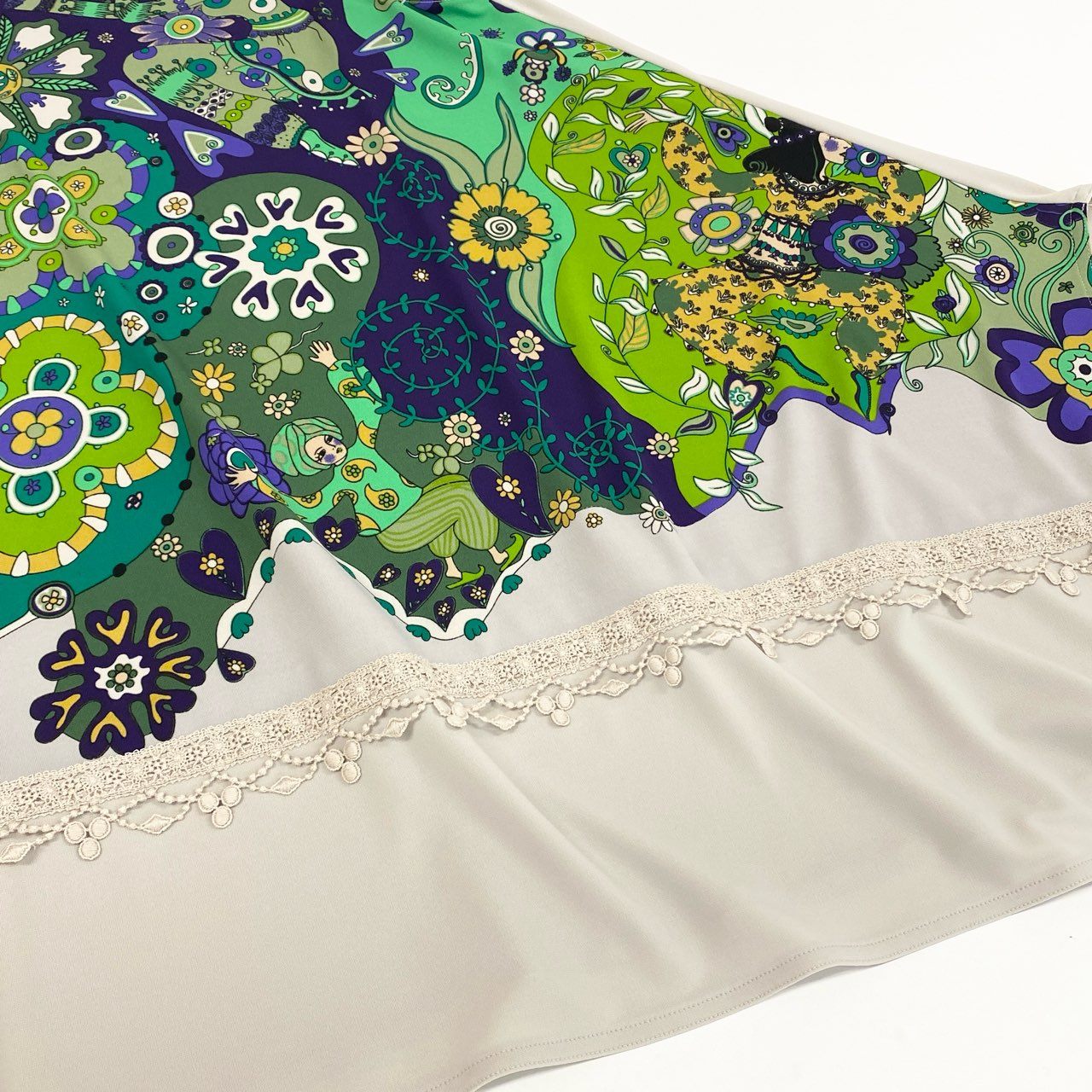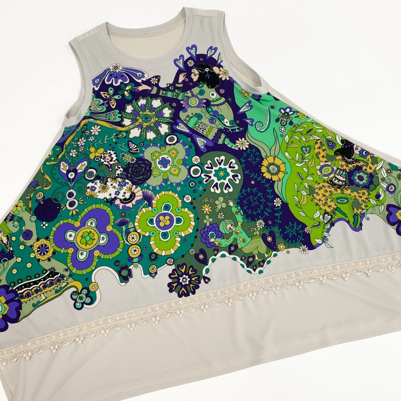 ライトグレージュをベースに、エメラルドグリーン・ライム・パープルなどを使った鮮やかなアートフラワープリントが目を引く、TOKUKO 1er VOL らしいチュニックワンピースです。軽やかな素材が動きに合わせて美しく揺れ、裾には繊細なレースと小さなポンポン装飾が施されるなど、細部までこだわりのあるデザイン。アシンメトリーな広がりがシルエットを華やかに見せ、一枚で存在感のあるスタイルが完成します。デイリーから旅行、お出かけシーンまで幅広く活躍するアイテムです。