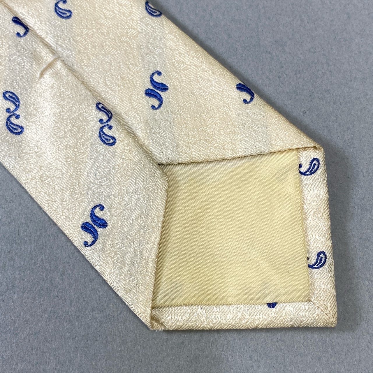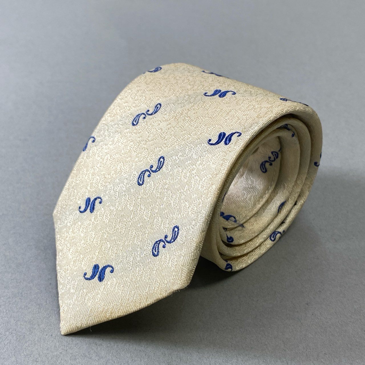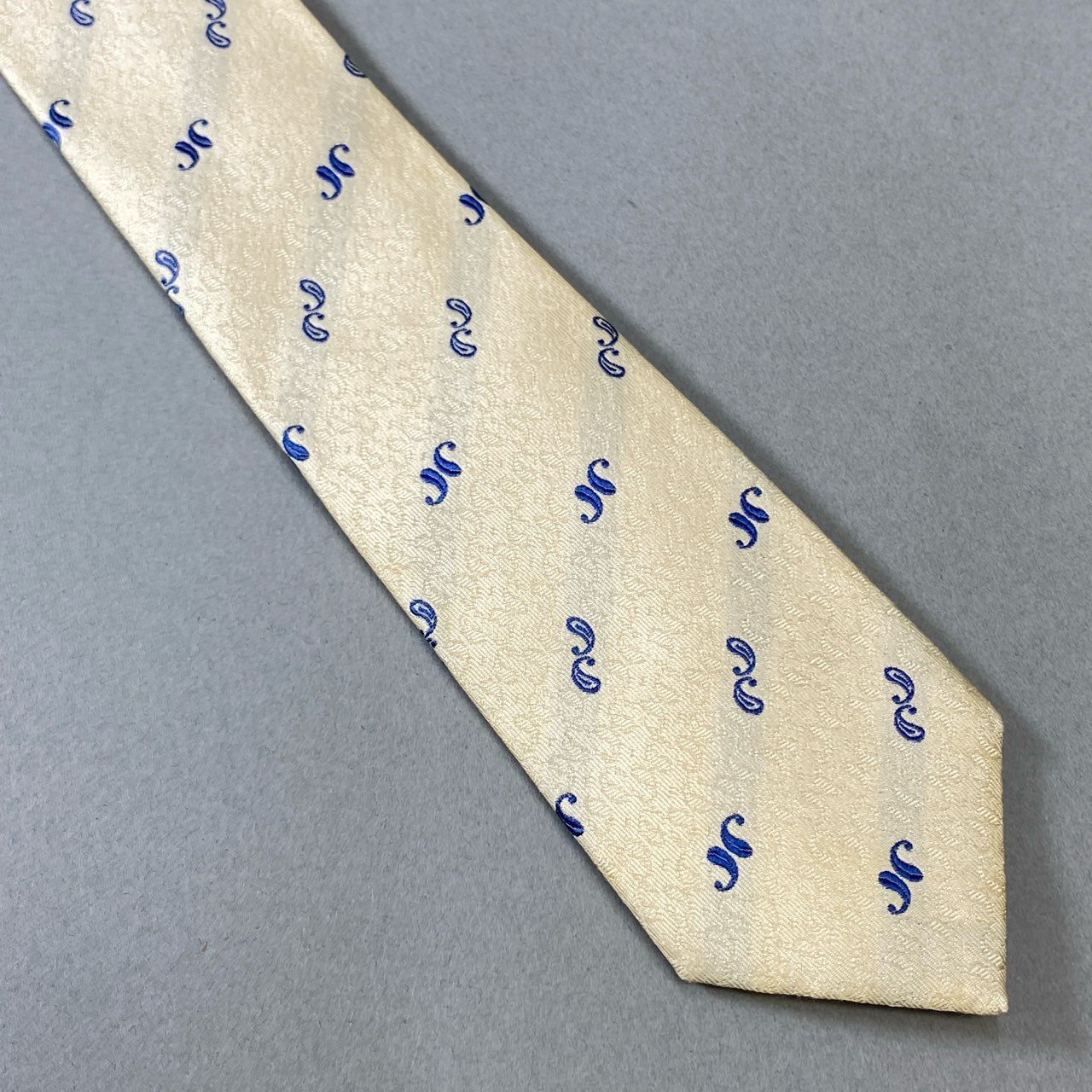 コムデギャルソン・オムの上品なベージュネクタイ。ロイヤルブルーのペイズリーモチーフがさりげなく織り込まれたデザインです。清潔感と知的な印象を与えるカラーリングで、春夏のスーツスタイルにも軽やかに映える一本。ビジネスはもちろん、ブライダルやパーティーにもおすすめのアイテムです。