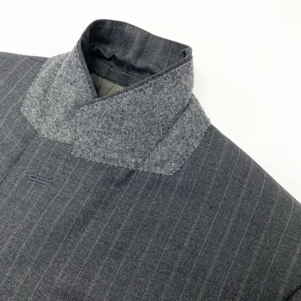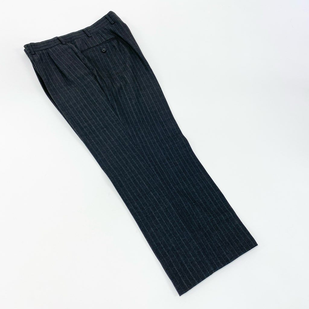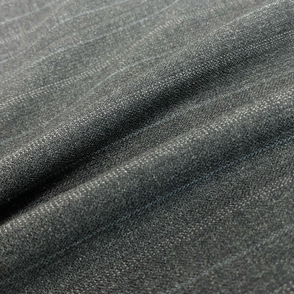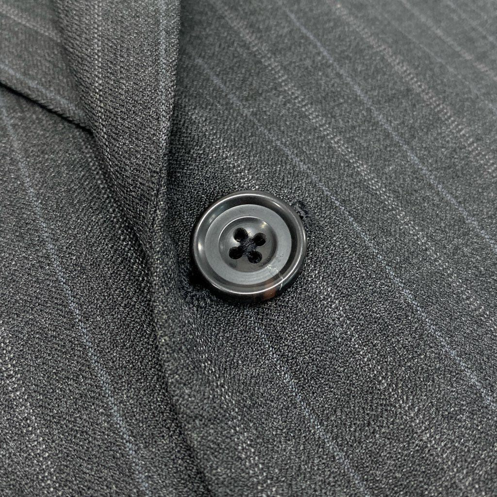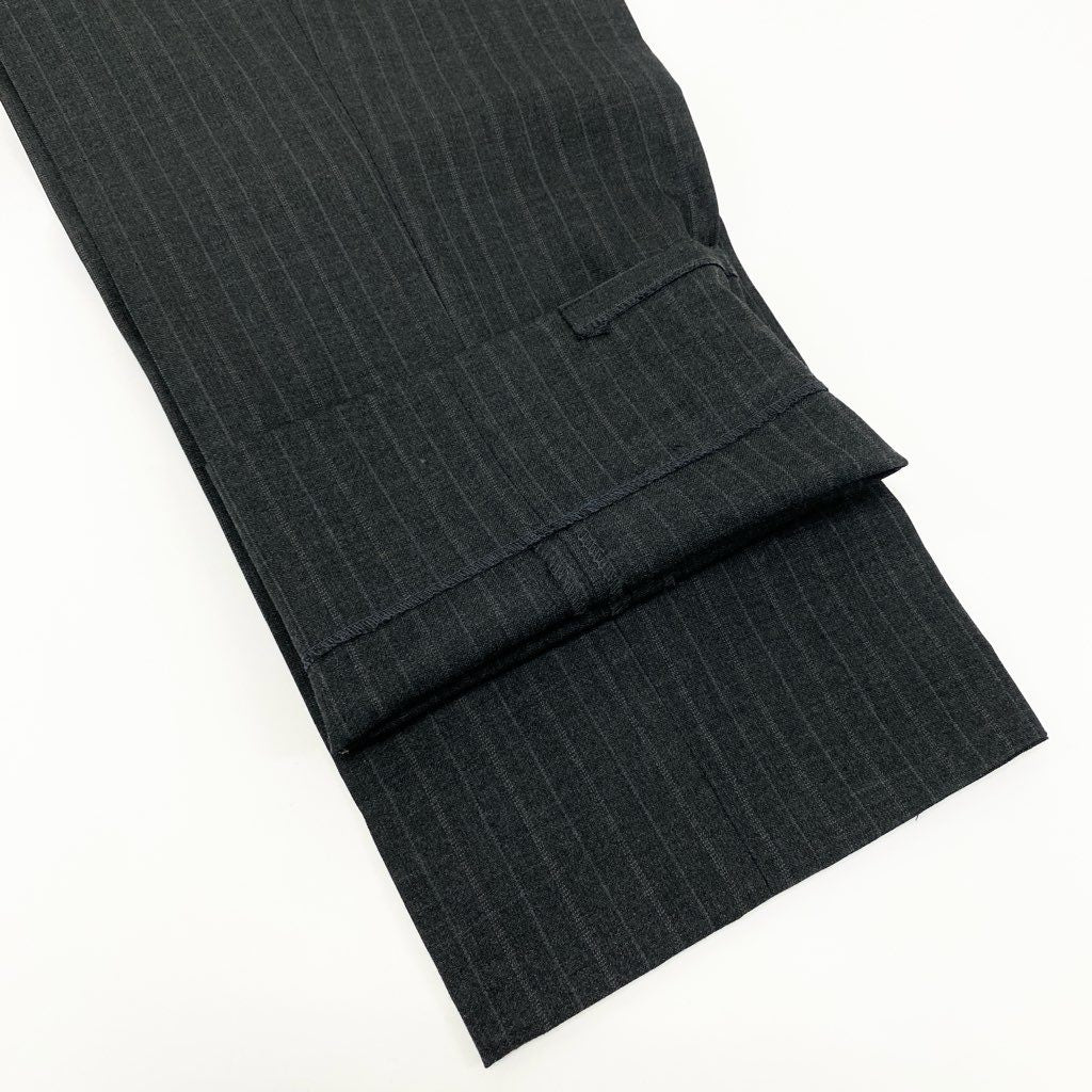 Burberrysのスーツセットアップで、落ち着いたチャコールグレーをベースにした上品なピンストライプ柄が特徴です。素材はマットな質感のウール生地で、クラシックかつ知的な印象を演出します。シングル2ボタン仕様にフラップポケット、袖口は4ボタン仕上げの正統派ディテールです。ビジネスシーンはもちろん、式典やフォーマル寄りの場面にも対応できる一着です。