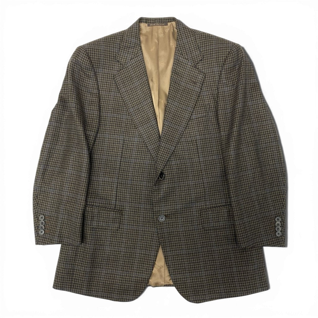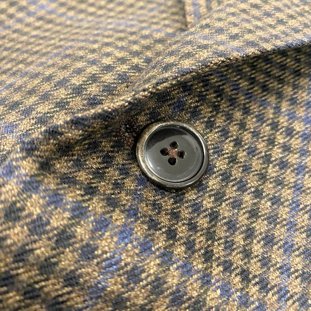 ブラウンを基調にオリーブが混ざったような落ち着いた色味のチェック柄テーラードジャケットです。素材はマットで柔らかさのあるウール系生地で、クラシカルな雰囲気が感じられます。フロントは2ボタン仕様、袖口は本切羽風のボタンディテールで、仕立ての良さが際立ちます。Ravazzoloらしい端正なシルエットで、スラックス合わせのきれいめスタイルから、デニムを使った大人カジュアルや通勤用にも幅広く活躍します。