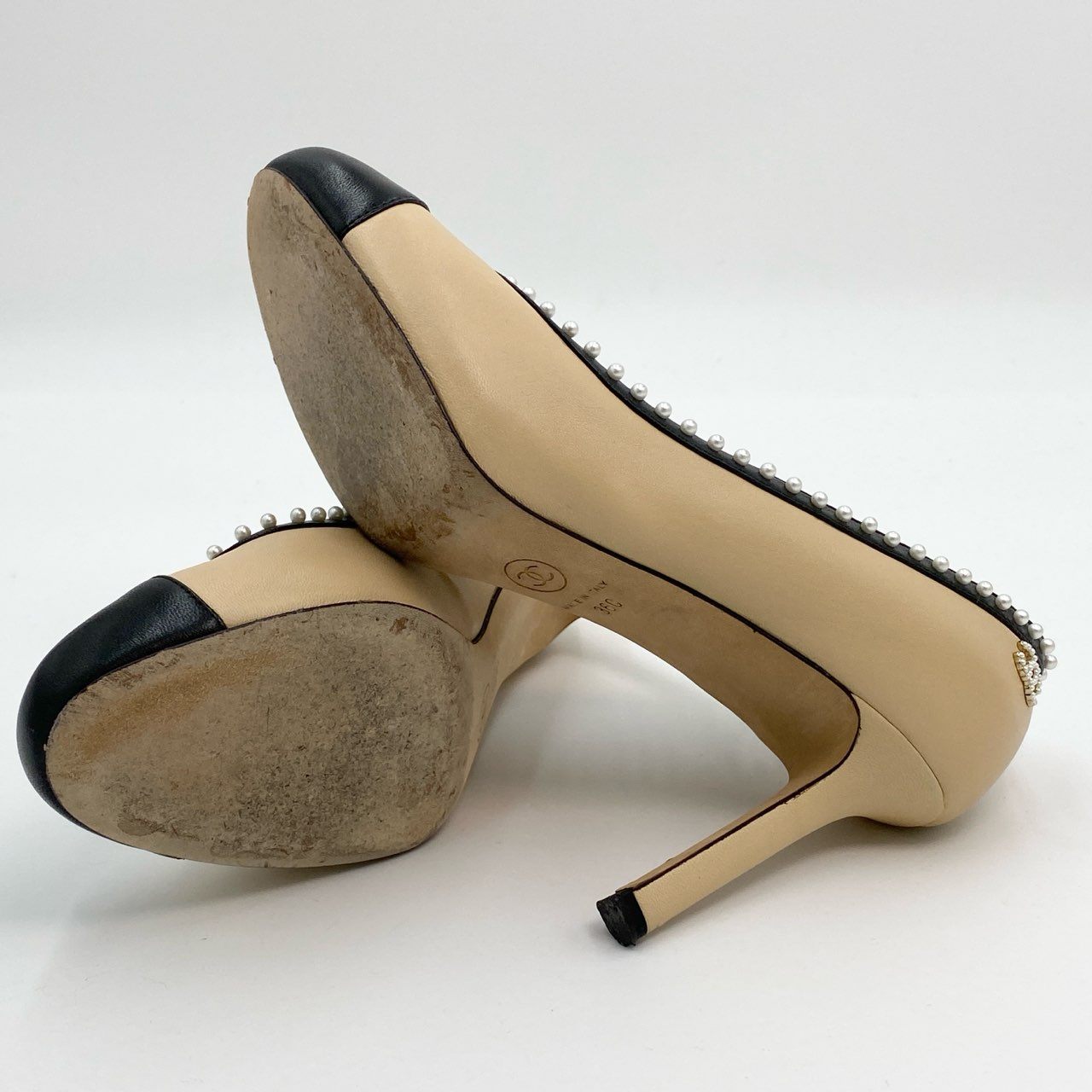 3c30 CHANEL シャネル ココマーク パール付き ヒールパンプス G31552 36C ベージュ ブラック レザー シューズ 靴t18r