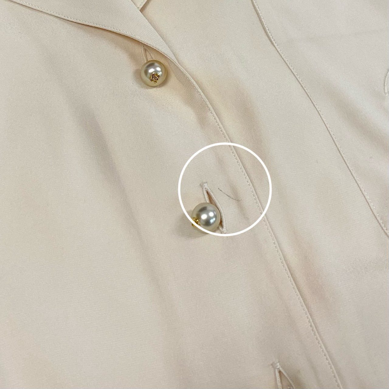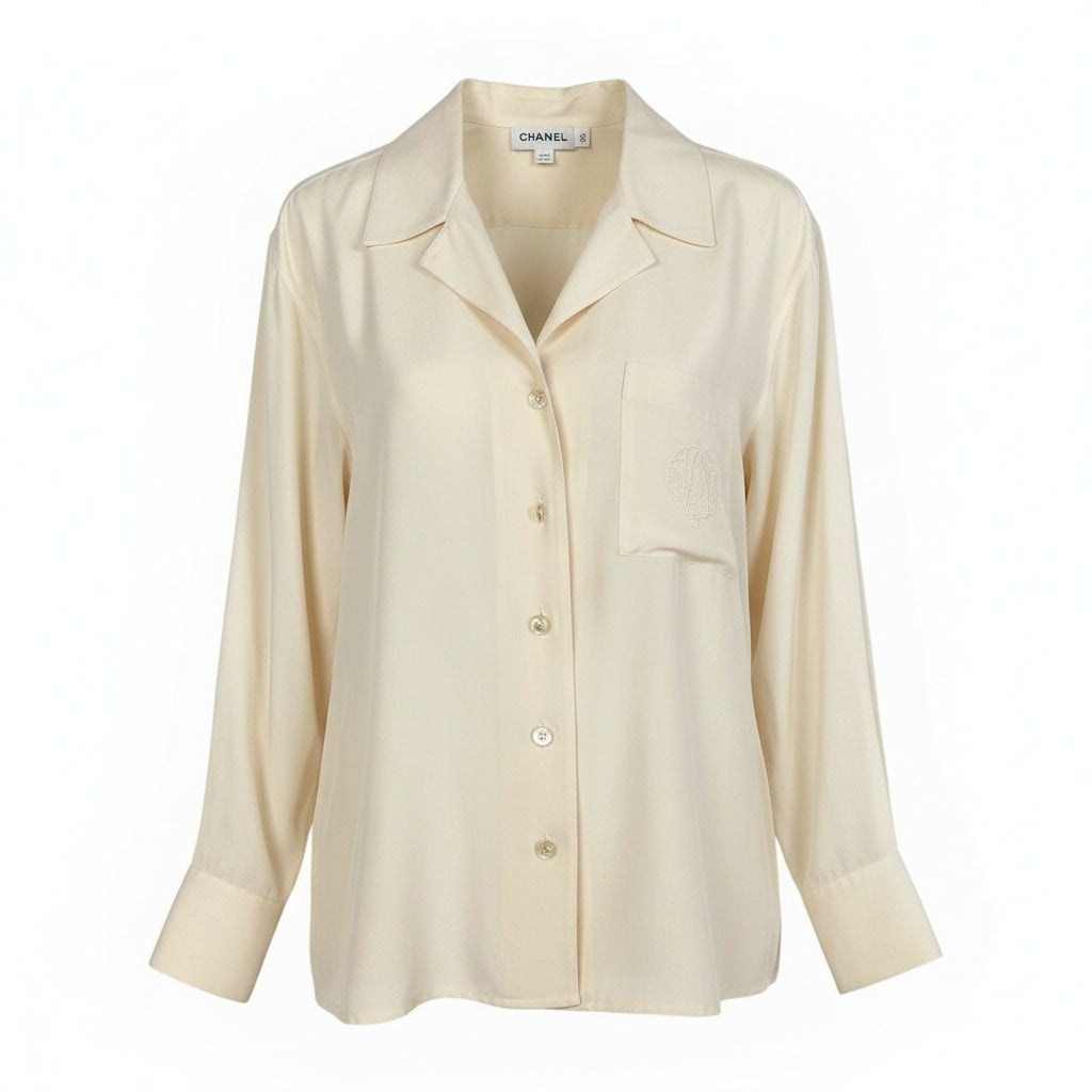10a13 CHANEL シャネル ロングスリーブシャツ オープンカラー シルクブラウス ココマーク パールボタン レディース 女性用 アイボリー シルク100% Vintage shirt with pearl Coco mark buttonst18r