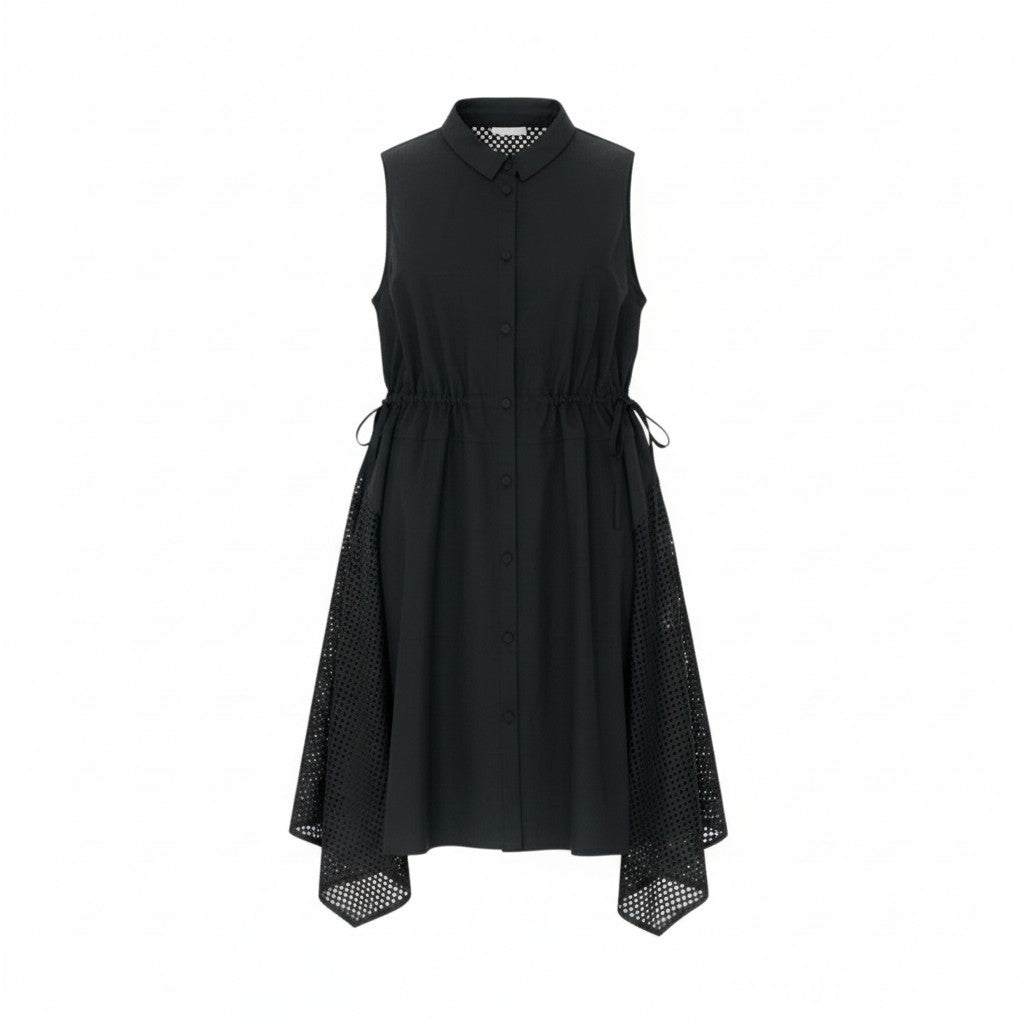 カラーは深みのあるブラックで、肩・サイドに施されたカットワークレースが軽やかさと涼しげな透け感を演出するノースリーブシャツワンピースです。ウエストはサイドリボン仕様で、絞ればメリハリを出せ、緩めればAラインに広がるアレンジ自在のデザイン。コットンリネンのマットで柔らかな素材感が心地よく、夏場の一枚着にも羽織りとしても活躍します。モード感がありつつも日常使いしやすい、トクコプルミエヴォルらしい個性的な一着です。